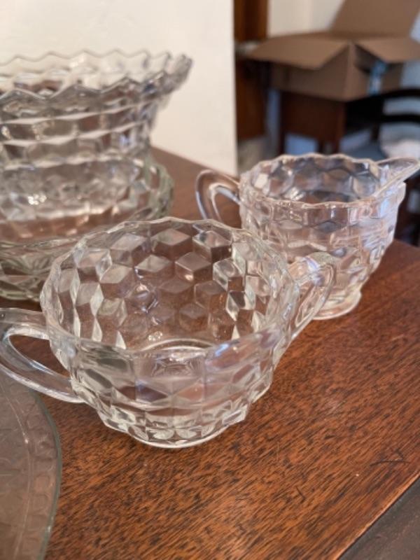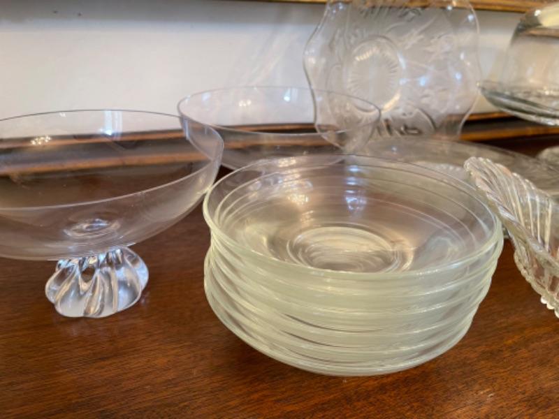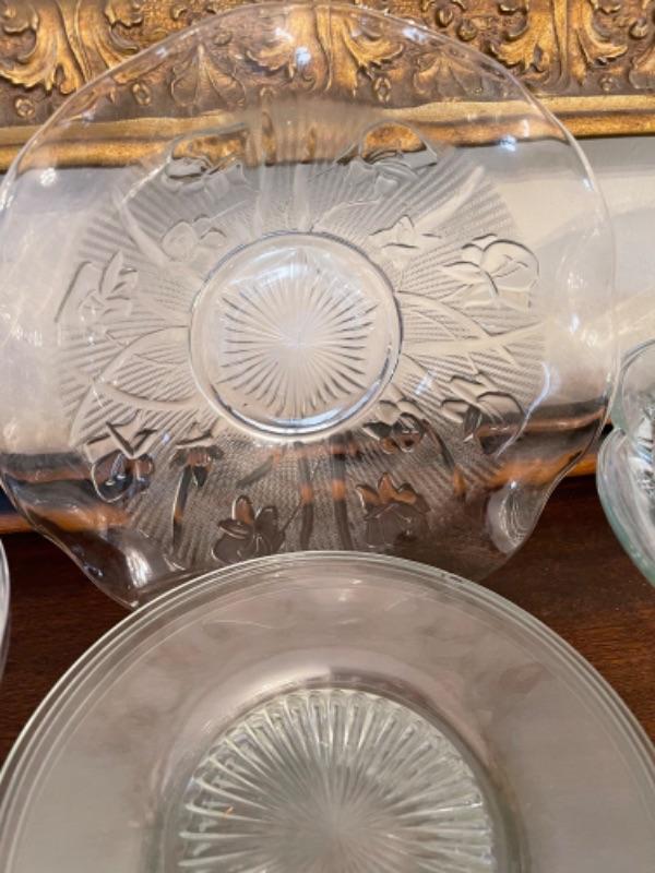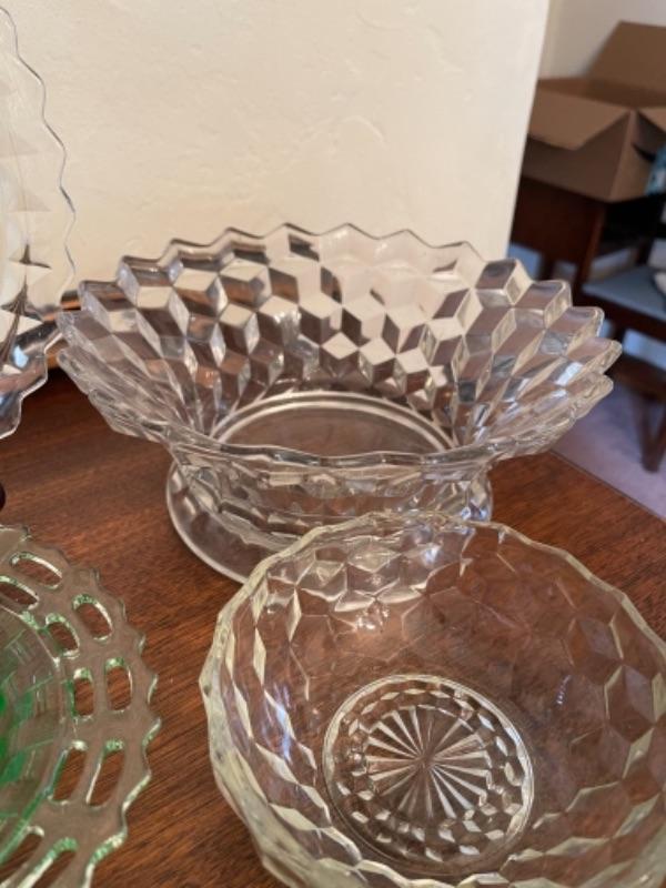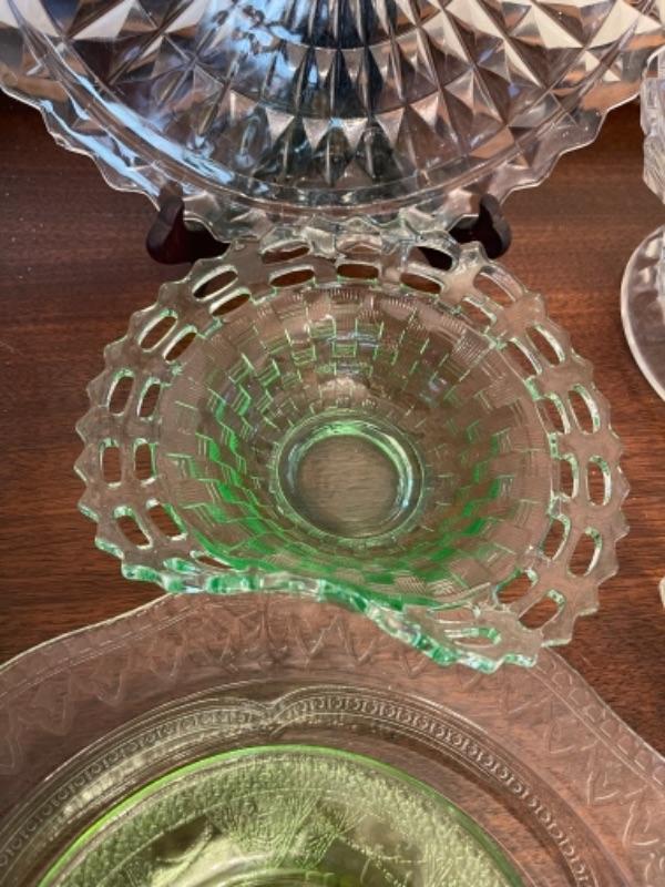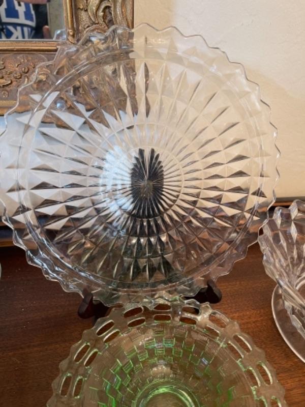 Lot 14. Assorted glassware, Fostoria American, green depression glass, covered cake plate, compotes, candy dish, etc.--Was $75 - - Now $35