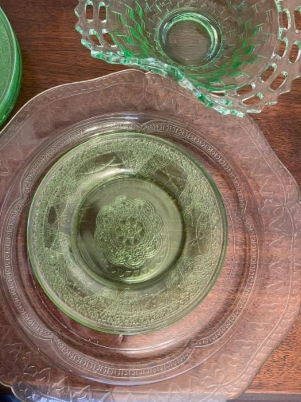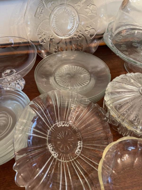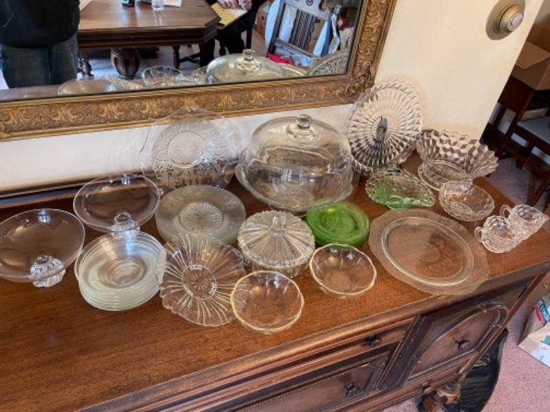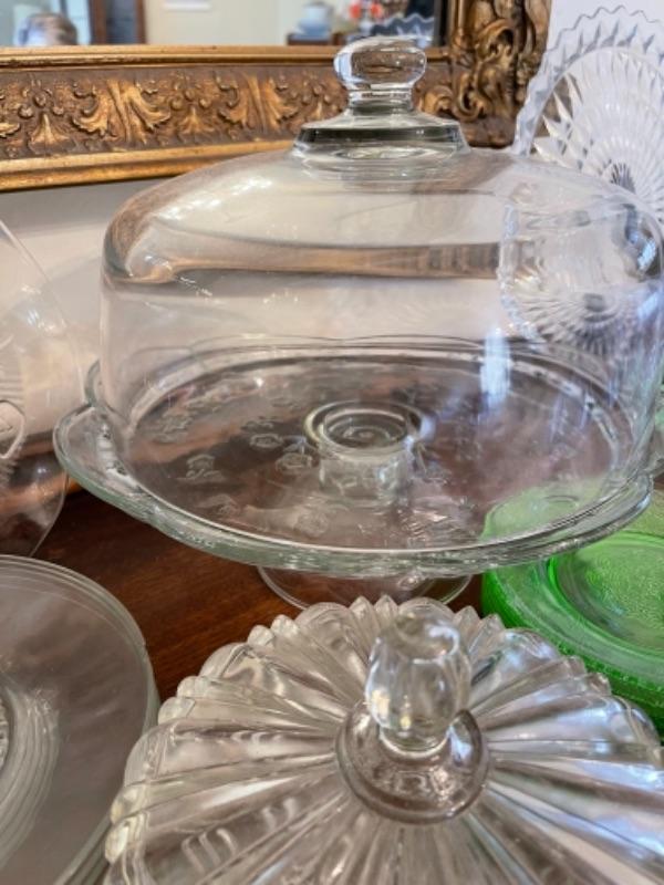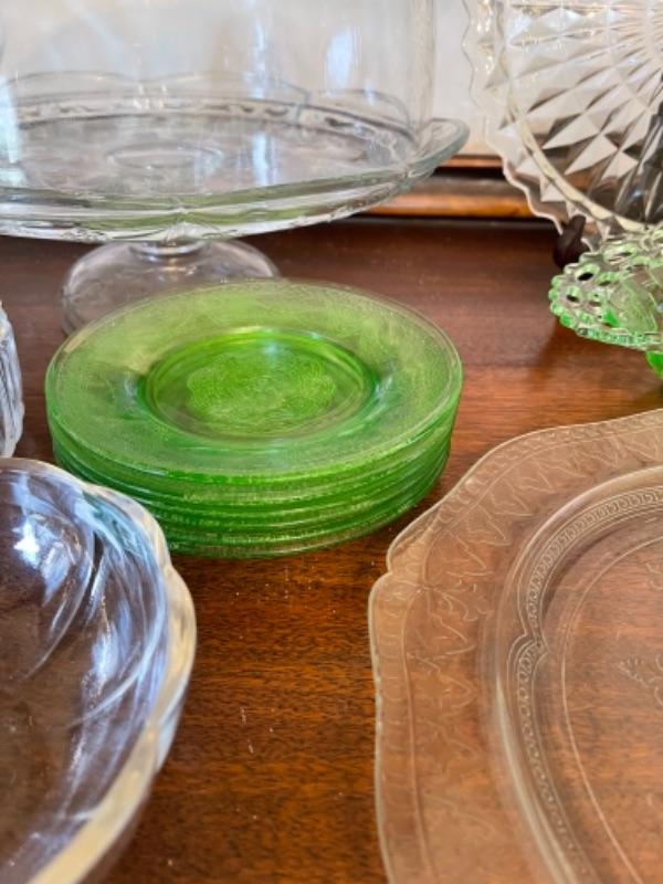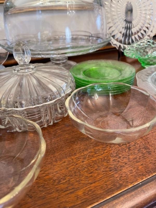 Lot 14. Assorted glassware, Fostoria American, green depression glass, covered cake plate, compotes, candy dish, etc.--$35