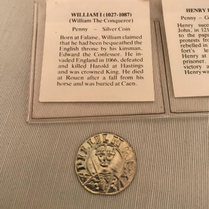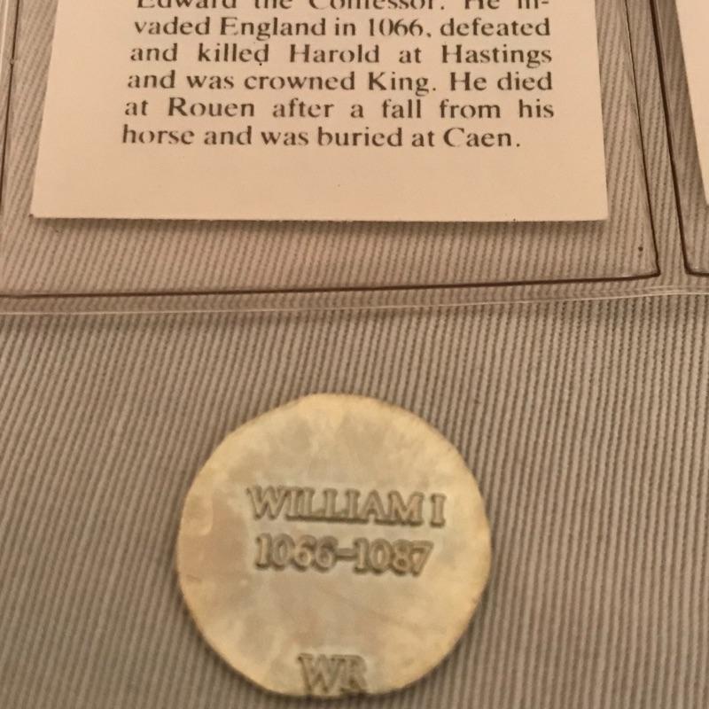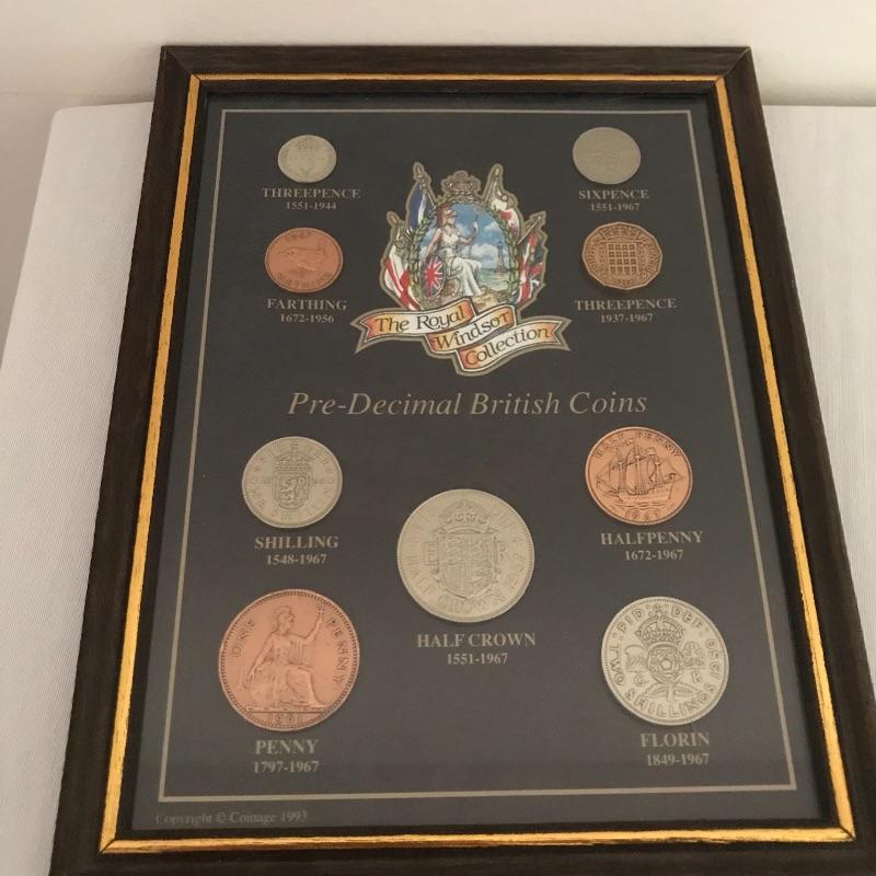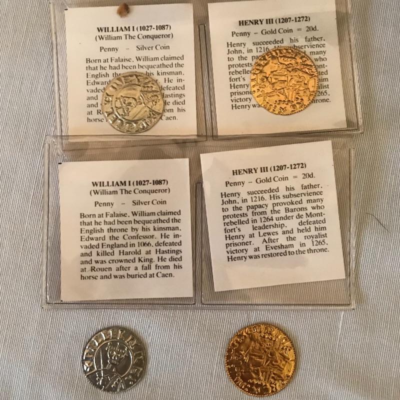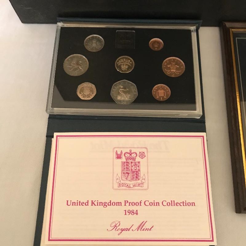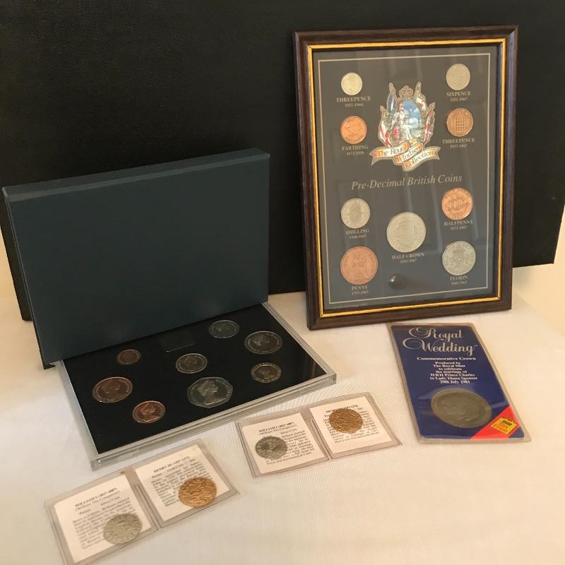 Royal Windsor Collection Pre-Decimal British Coins behind glass in a 6.75” x 8.75” frame. Two each William I and Henry III coin reproductions. Diana and Charles 1981 Commemorative Crown. UK 1984 Proof Coin Set.