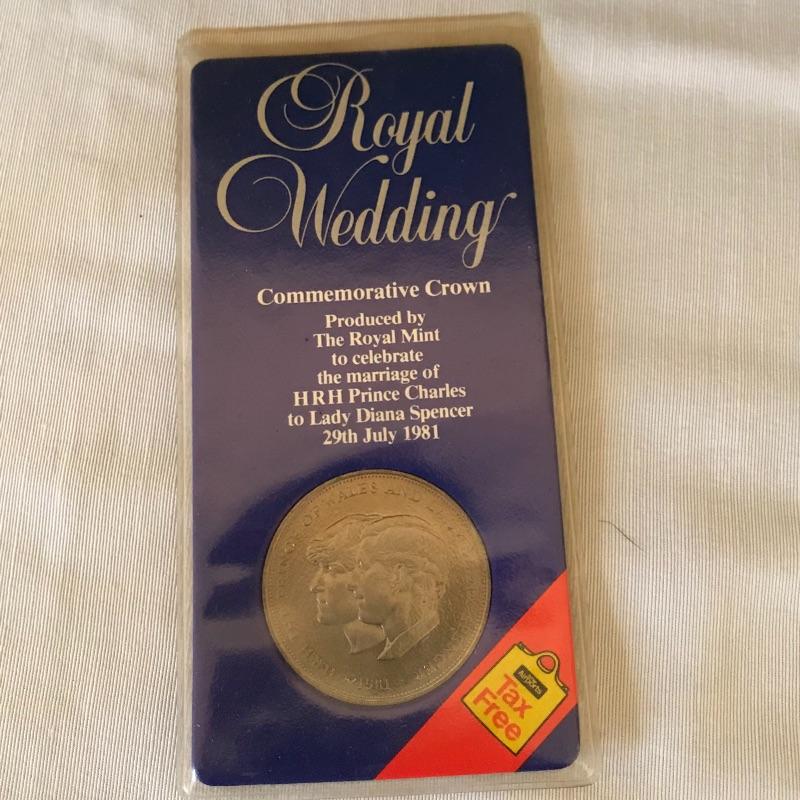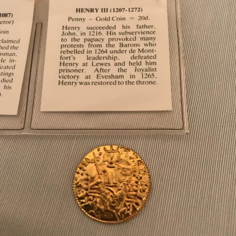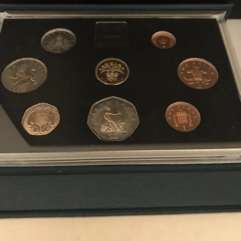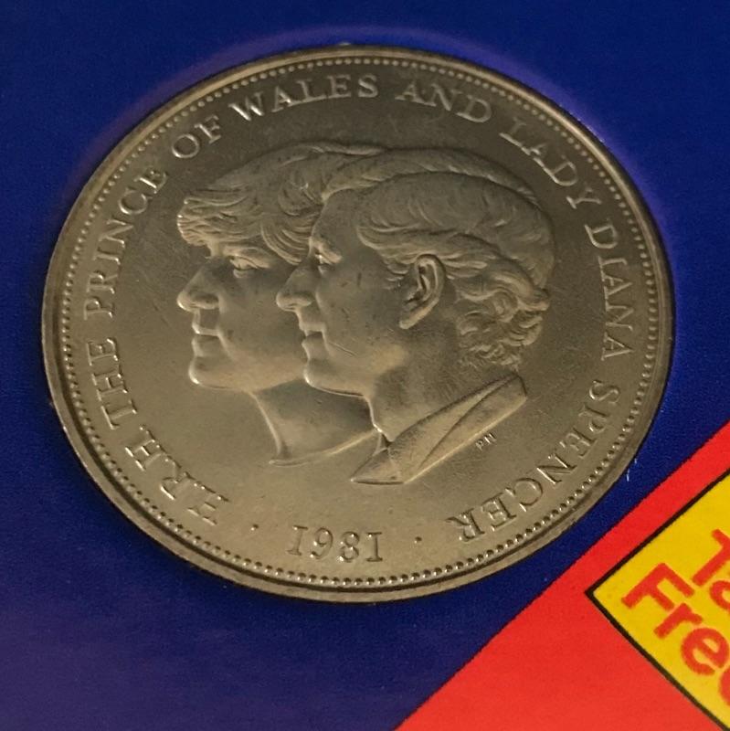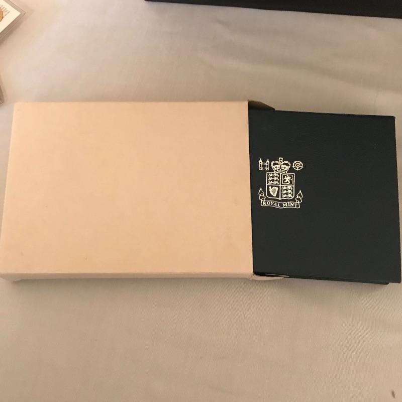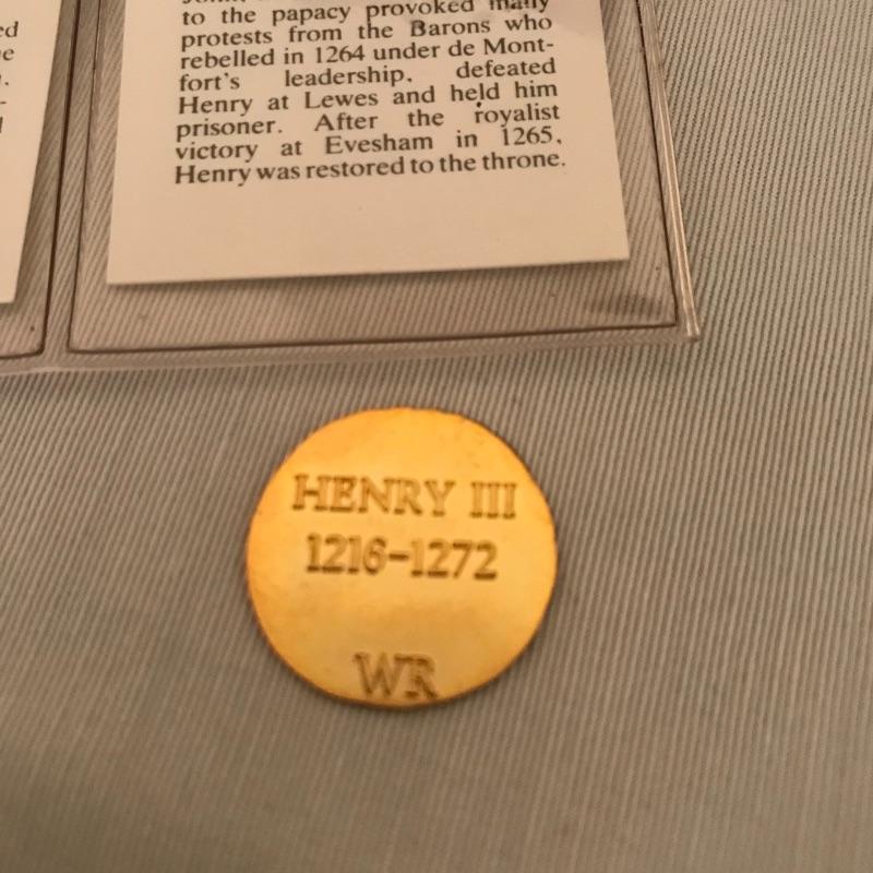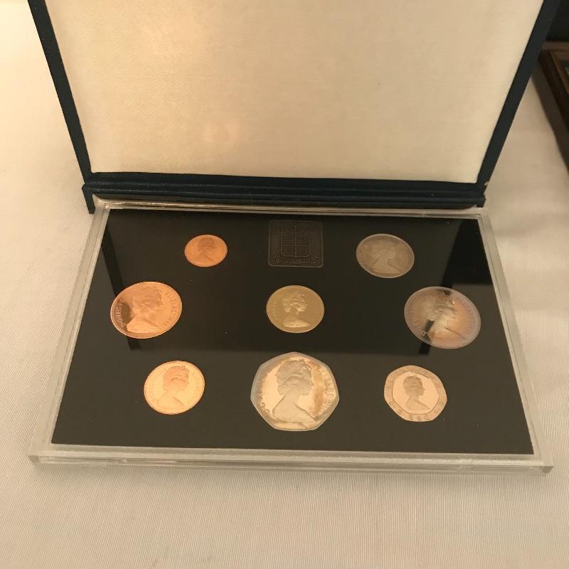 Royal Windsor Collection Pre-Decimal British Coins behind glass in a 6.75” x 8.75” frame. Two each William I and Henry III coin reproductions. Diana and Charles 1981 Commemorative Crown. UK 1984 Proof Coin Set.