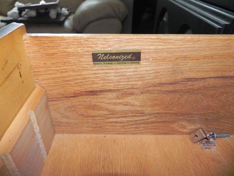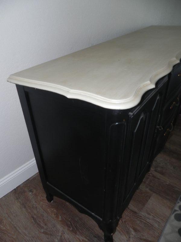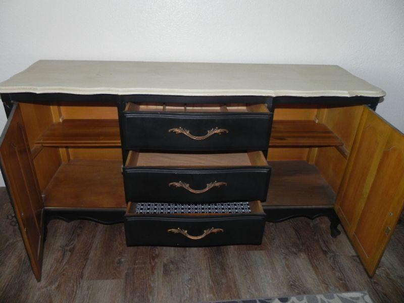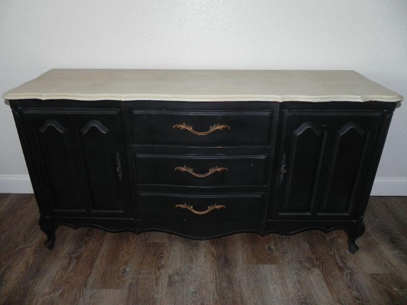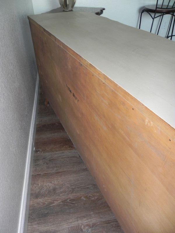 MEASURES 63"X19"X32", 3 DRAWERS AND STORAGE ON EACH SIDE WITH SHELF, PAINTED CREAM COLOR ON TOP (HAS A FEW SCRATCHES ON TOP THAT TOOK OFF PAINT)