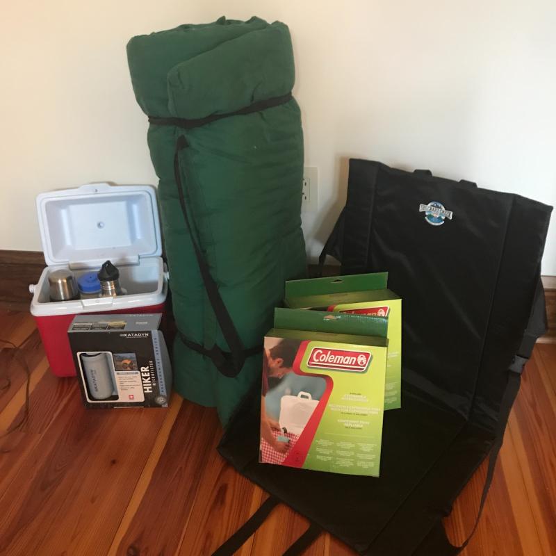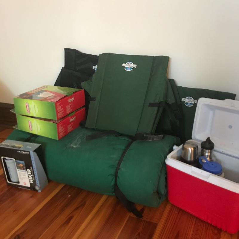 Lot includes three folding Crazy Creek Chairs, Sleeping Pad, Cooler, Water Filtration System(new in box), Water Bottles and Water Bag(2 new in box). Now you just need some great weather and a campfire! No shipping. Local Pick Up Only in Asheville.
