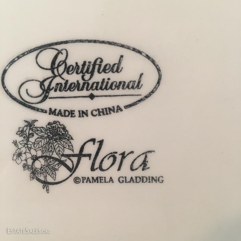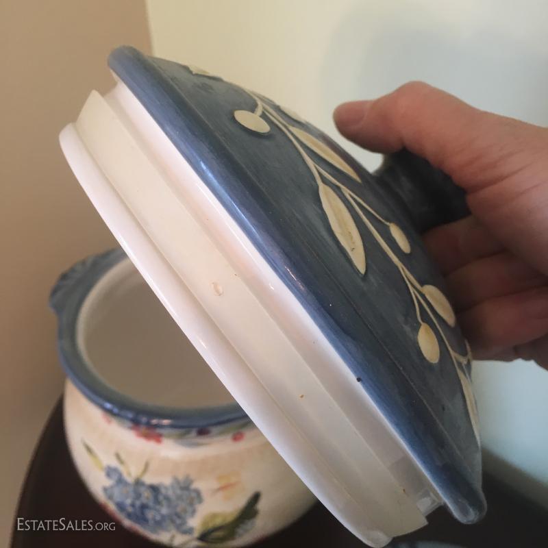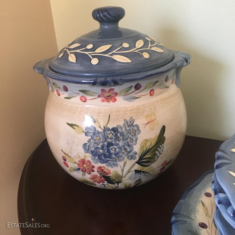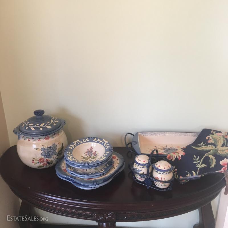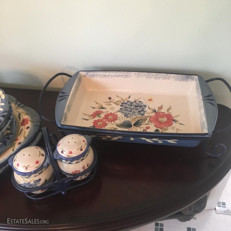 Designed by Pamela Gladding. Large cookie jar, casserole dish with stand, salt & pepper shakers with stand and 3-piece place setting for at least two. Each piece has a different floral design. One bowl has a hairline crack. Jar stands 11.5" tall. This lot is available for shipping or local pick up in Mills River, NC.