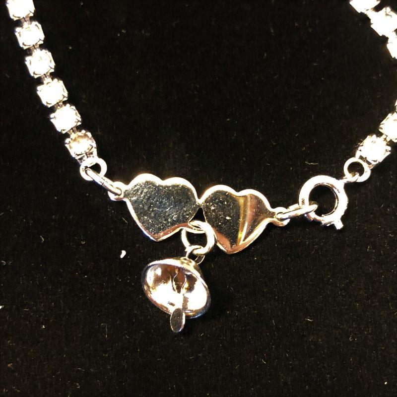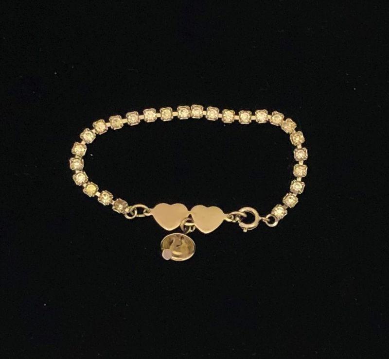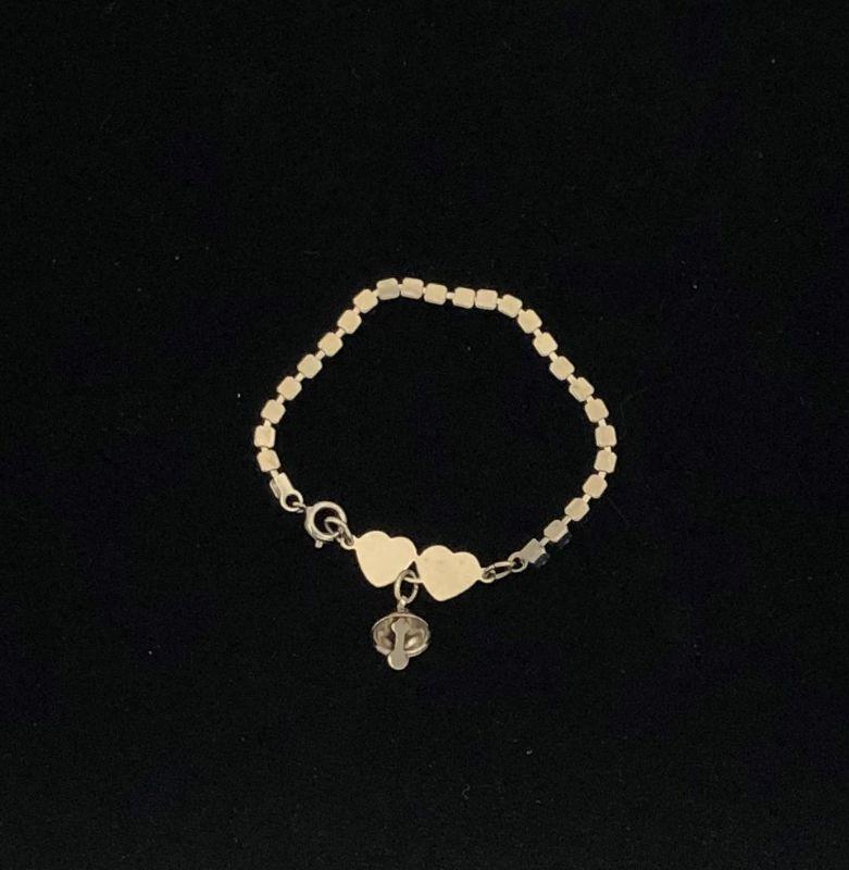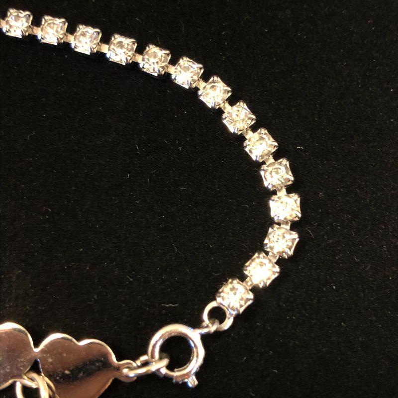 This bracelet is about 6" long and has clear stones around the entire bracelet. The clasp part has two silver tones hearts with a bell.