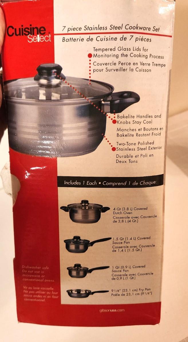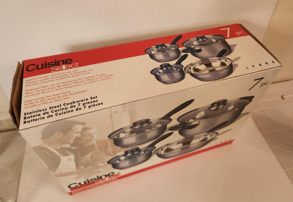 Brand new in box - Cuisine Select 7 pc Stainless Steel Cookware Set. You get a 4 qt Dutch Oven, a 1.5 quart covered sauce pan, a 1 quart covered saucepan, and a 9 1/8" Frying Pan.