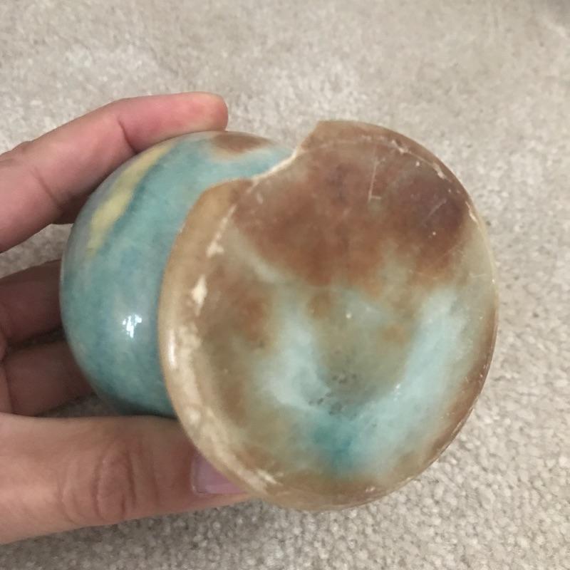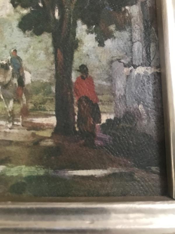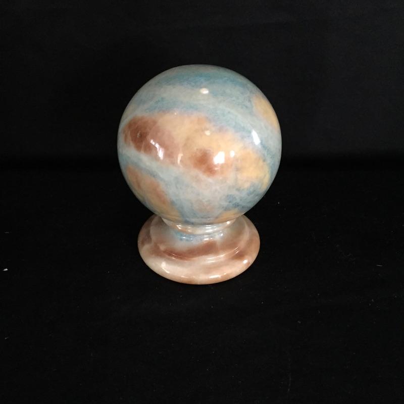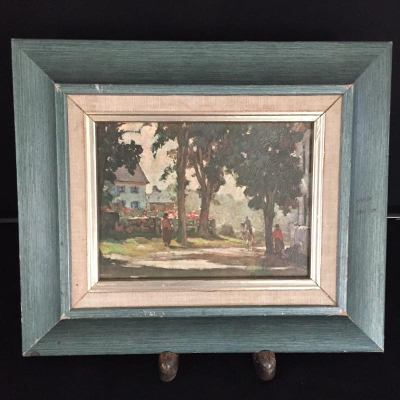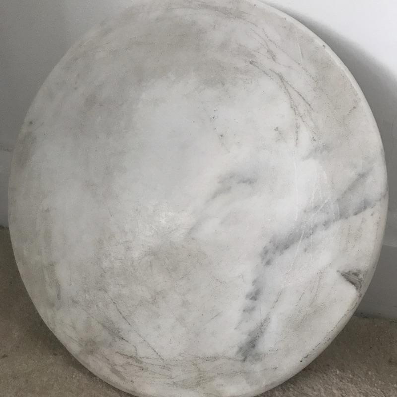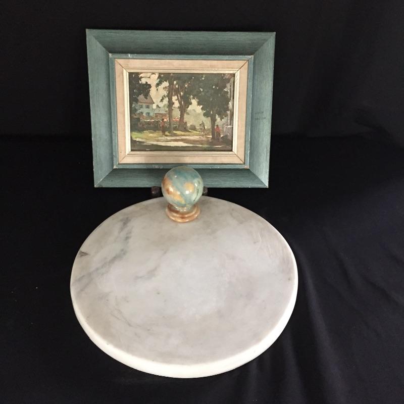Lot includes a quaint framed art a round marble slab and marble ball piece. Marble slab can be used as a cutting board or a table top and measures 14”d. Framed art is not signed and measures 11.25” x 13.25”. Local Pickup Only.