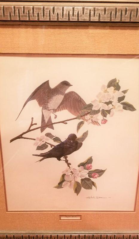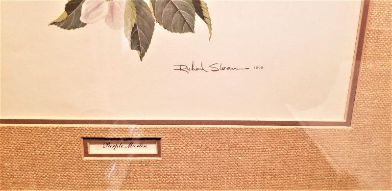 Nice framed print by noted bird artist Richard Sloan "Purple Martin." Measures 29 3/4" wide and 33" long.