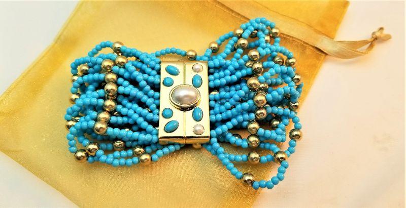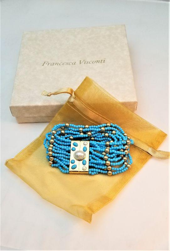 In original box, here is a Francesca Visconti multi-strand Stretch bead bracelet - features turquoise and gold colored beads with "pearl" accents on the gold-toned clasp. Original receipt shows this was purchased in 2009 at a cost of $44.98. 1.5" wide, Stretches to accommodate up to an 8 inch wrist. Very attractive.