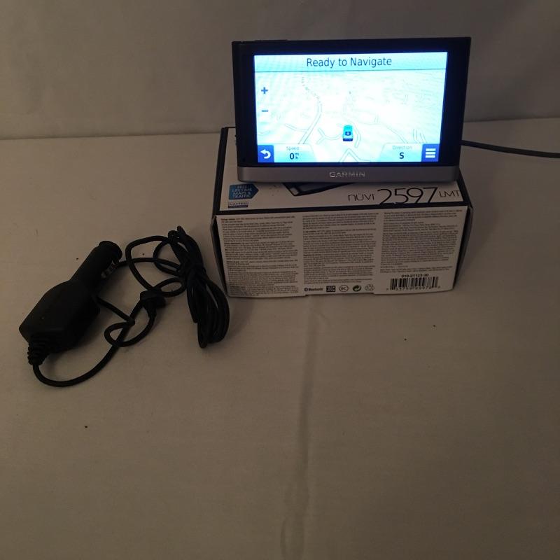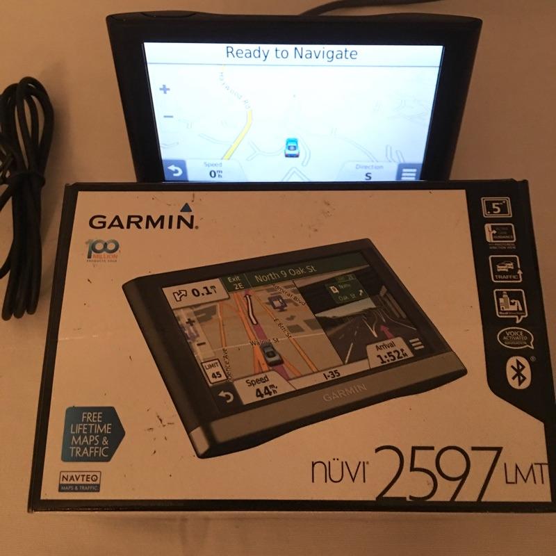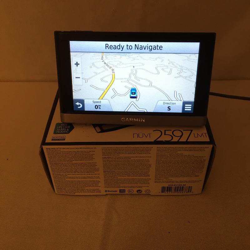 Garmin Nuvi 2597 LMT with air vent mount, HD vision visor, ice scraper and umbrella. You will not be lost if you decide to wander with this GPS.
