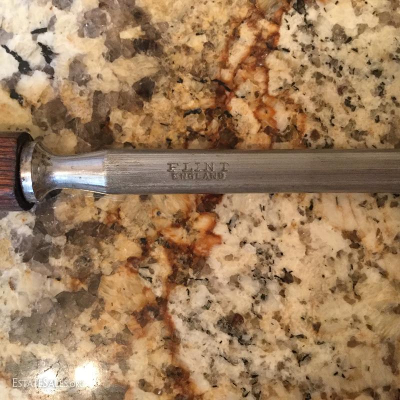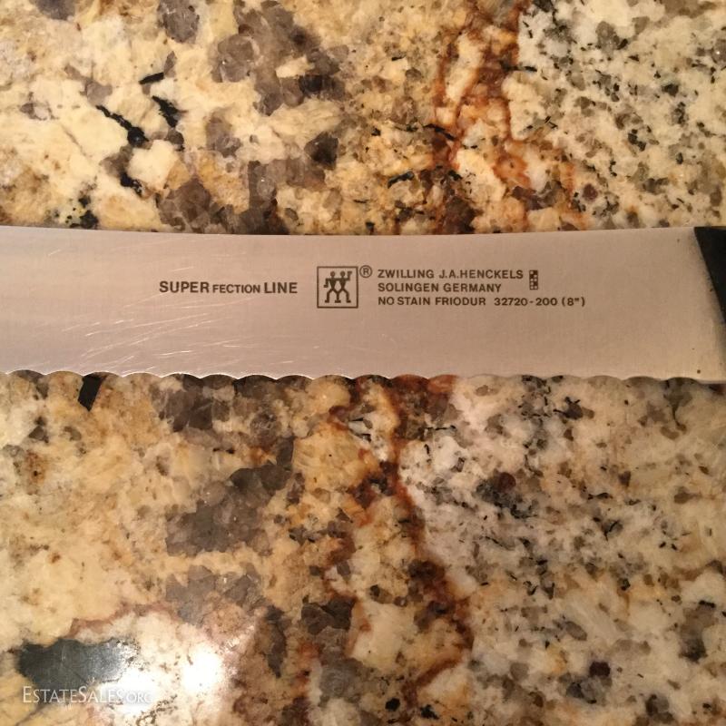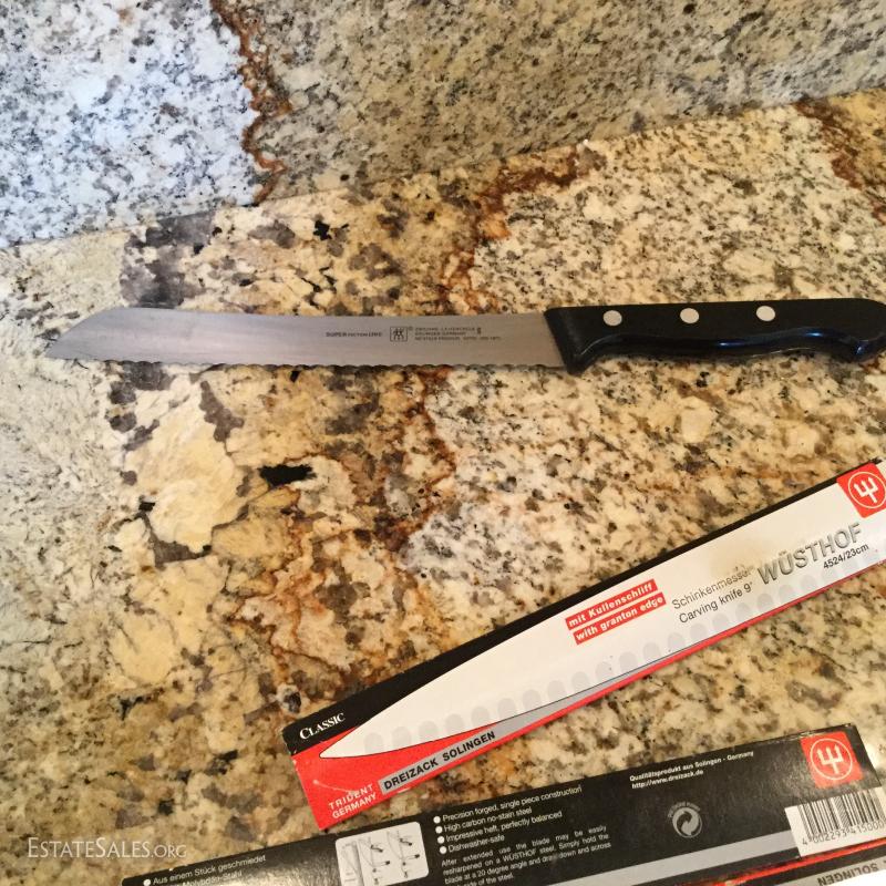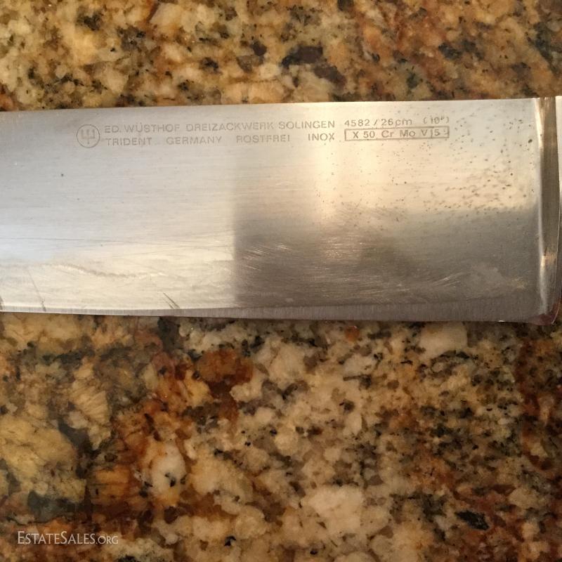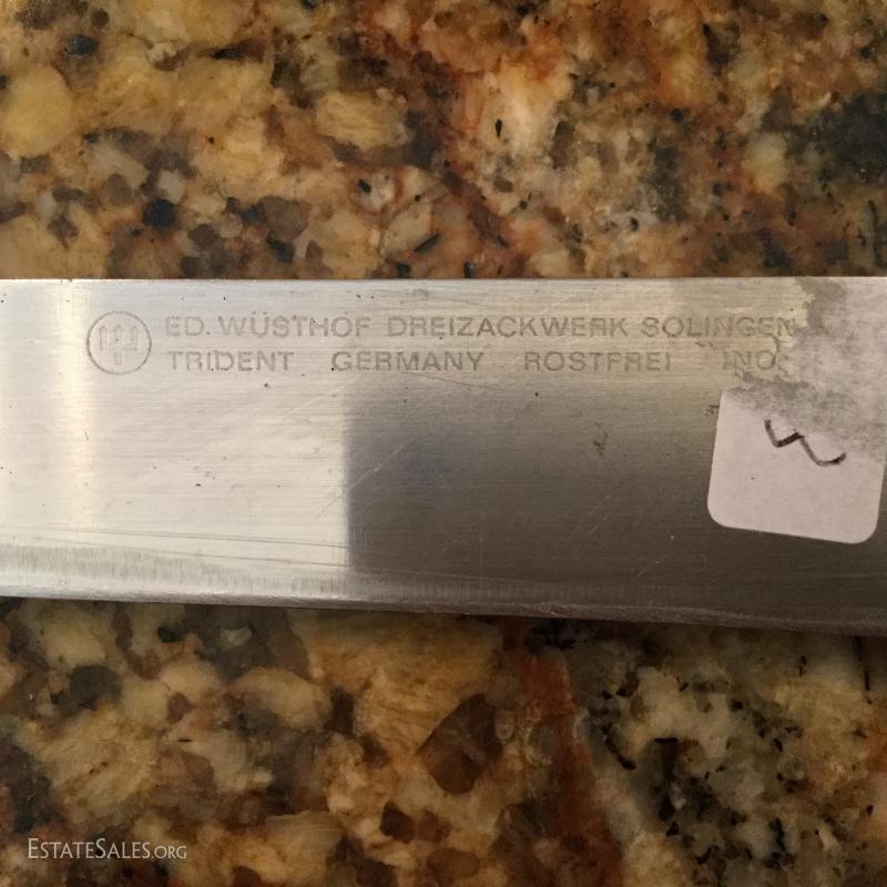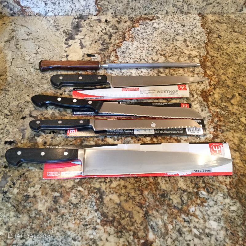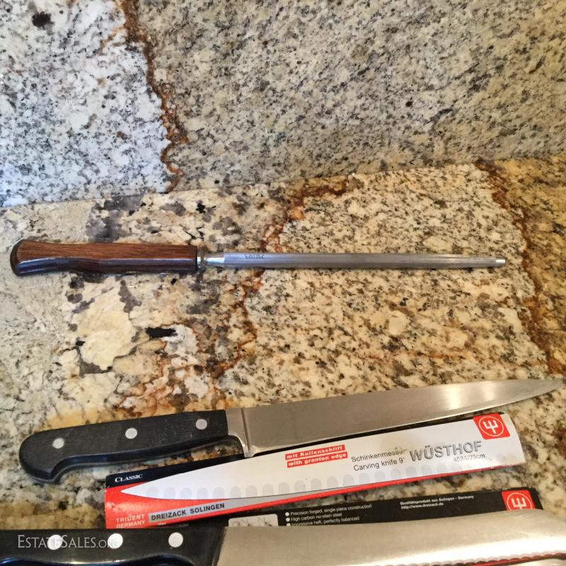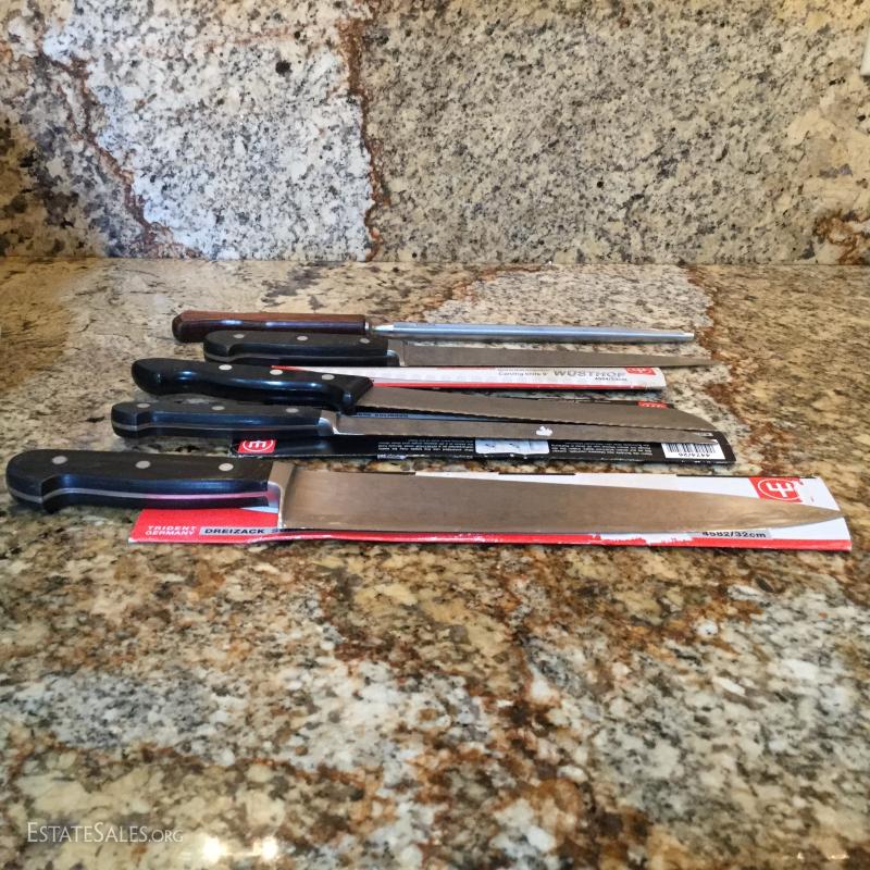 Three German knives by Wusthof. One knife sharpener by Flint England. See photos.