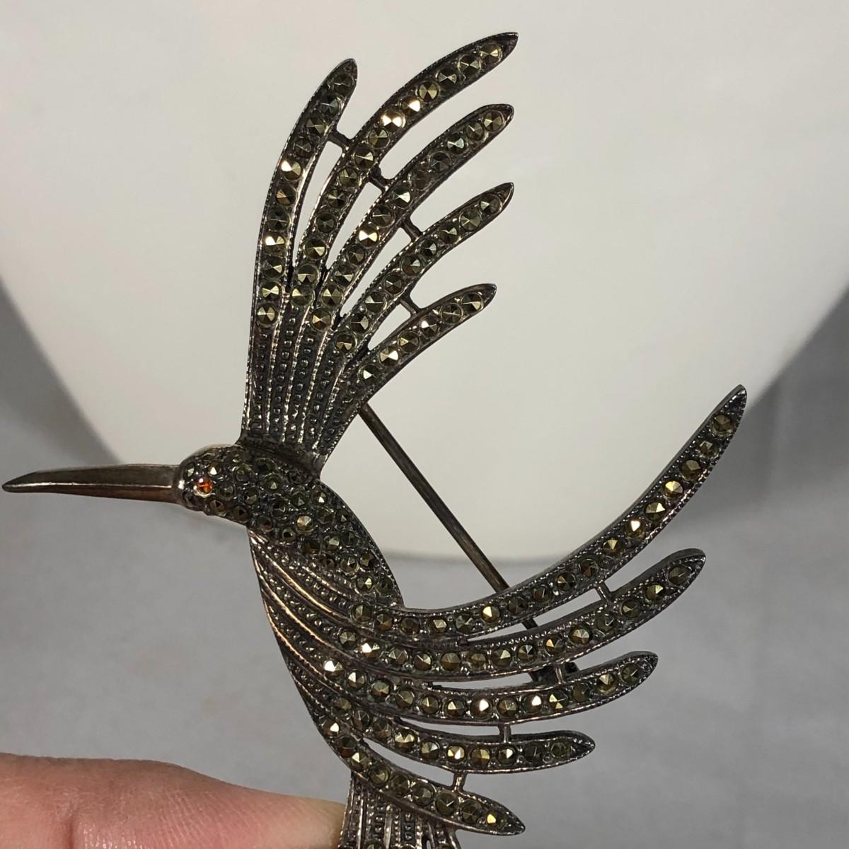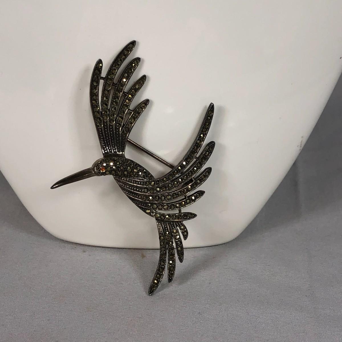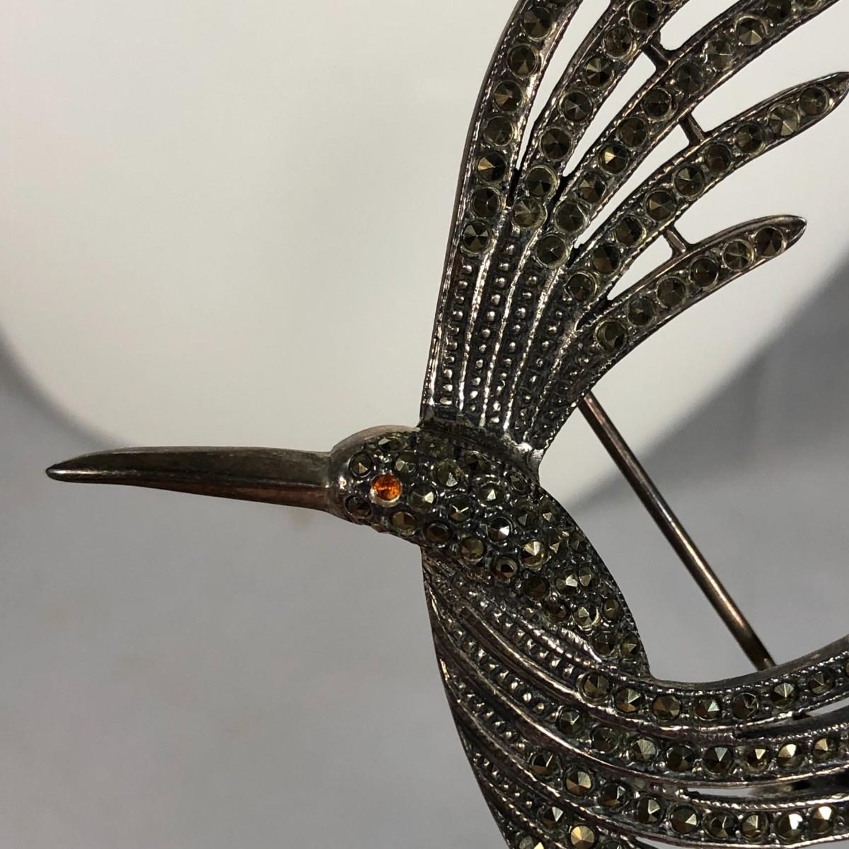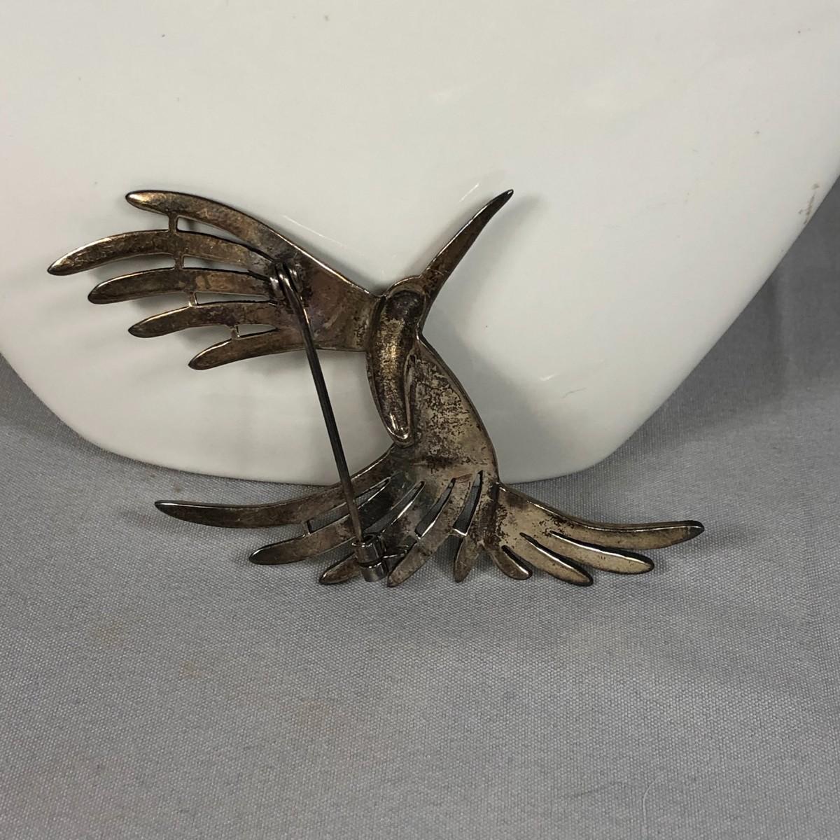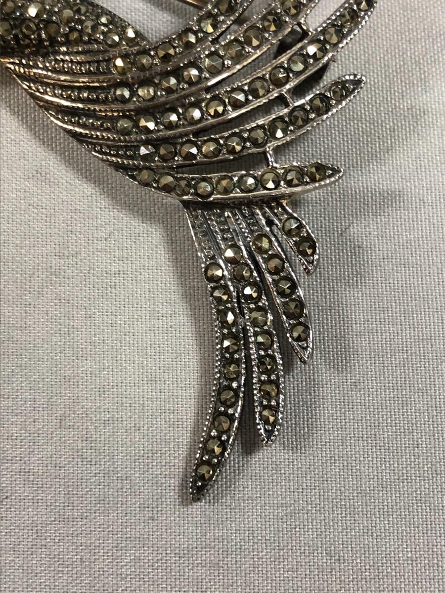 Beautiful brooch that appears to be silverplated. I was able to remove some of the tarnish with silver polish as you can see in the last picture that is of the tail. It is about 3.5" long and it looks like all of the crystals are intact.