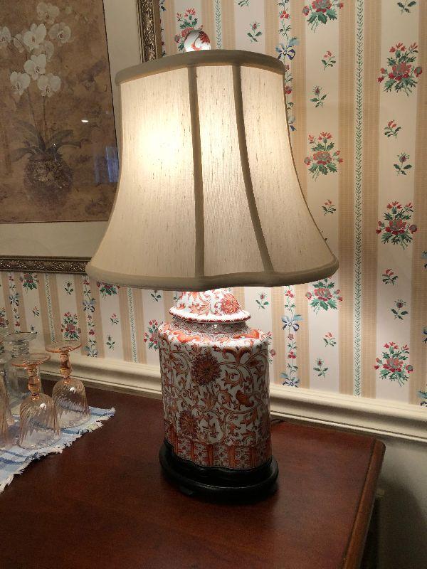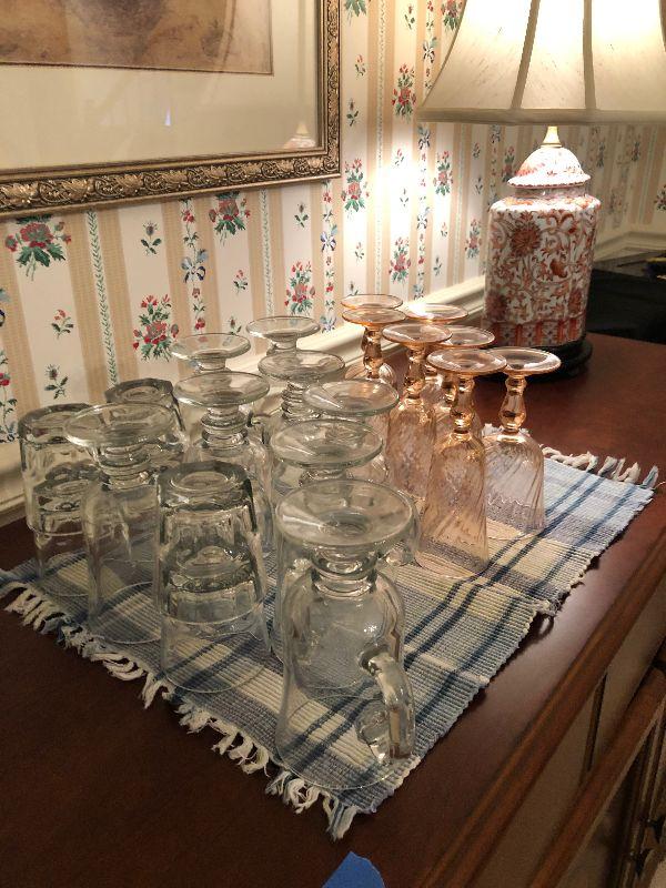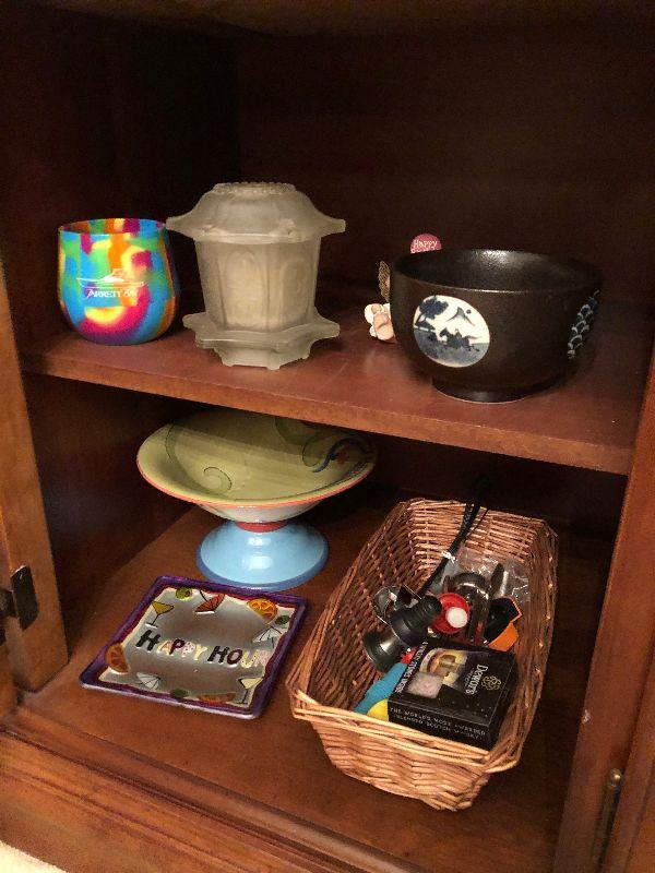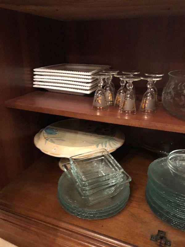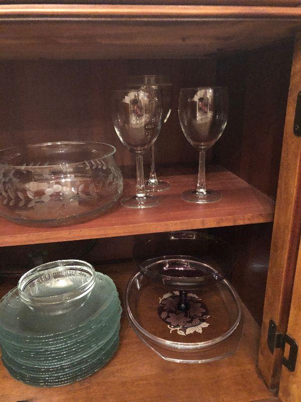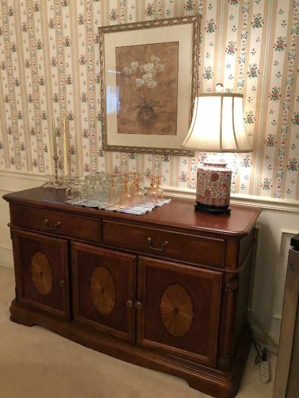 Inlaid Wood Buffet (55" x 19" x 32") Including Contents, Red & White Lamp, Candlesticks and Stemware