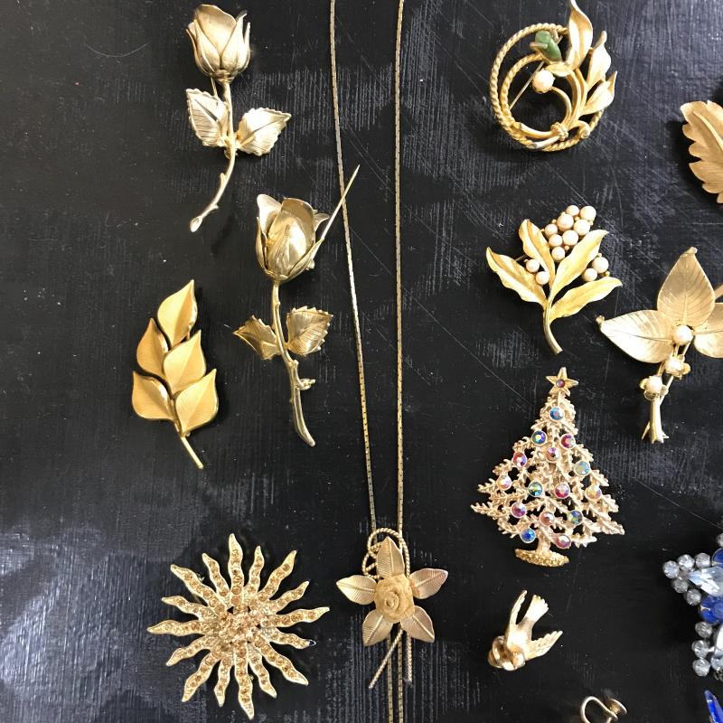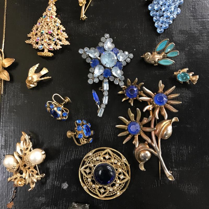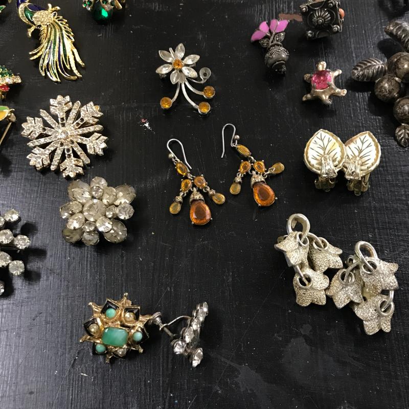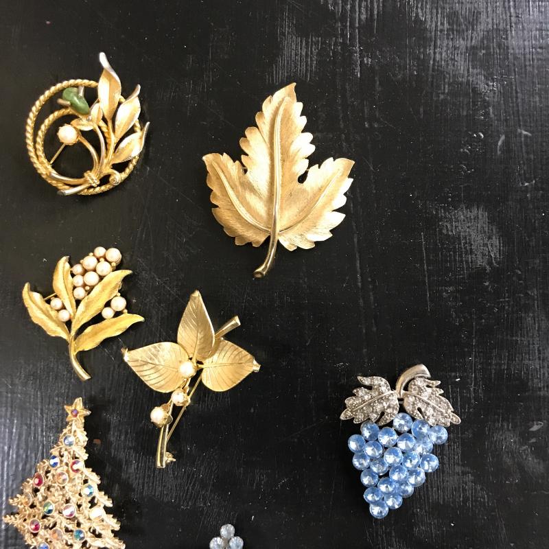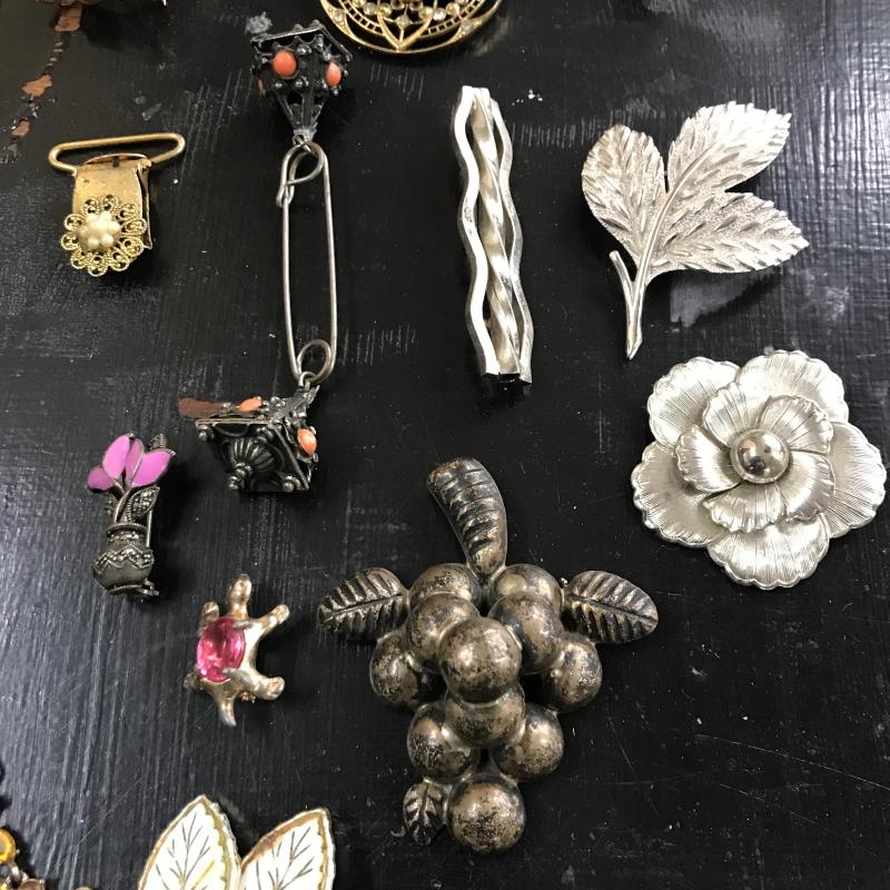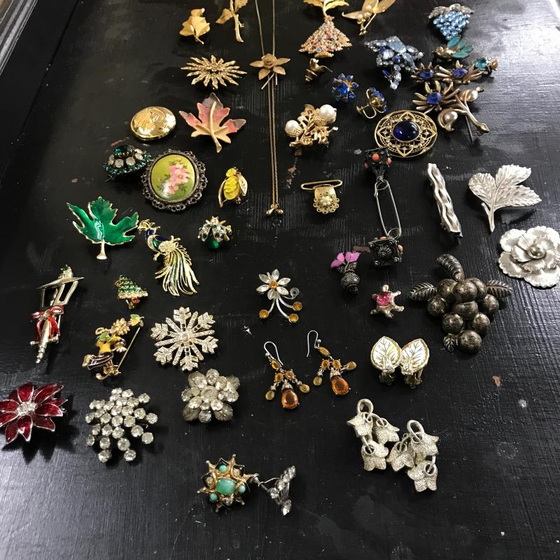 Large lot of vintage jewelry with some modern pieces in the mix. Includes some clip-on and regular earrings, pins and necklace. One hollow sterling piece with grape design. See photos for details. Shipping or local pick up in Maggie Valley, NC.