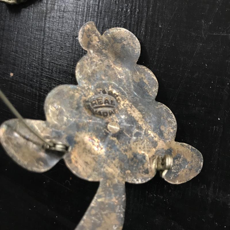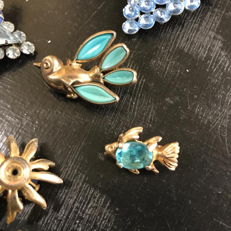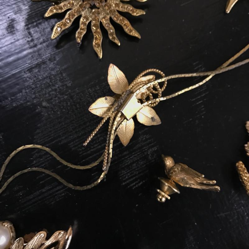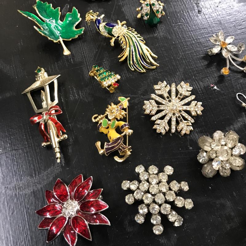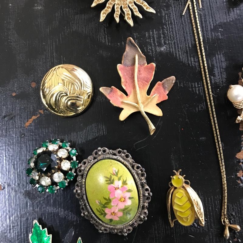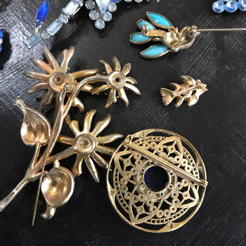 Large lot of vintage jewelry with some modern pieces in the mix. Includes some clip-on and regular earrings, pins and necklace. One hollow sterling piece with grape design. See photos for details. Shipping or local pick up in Maggie Valley, NC.
