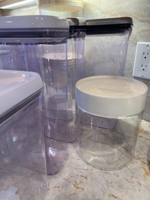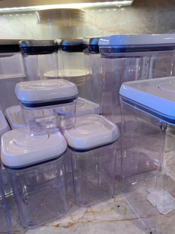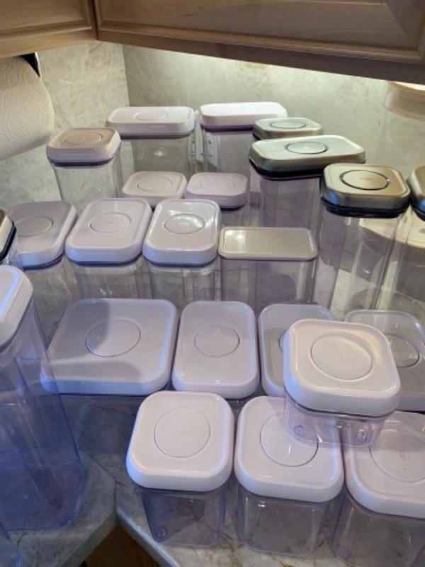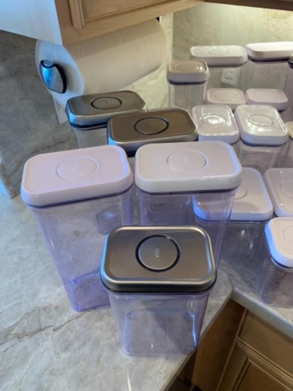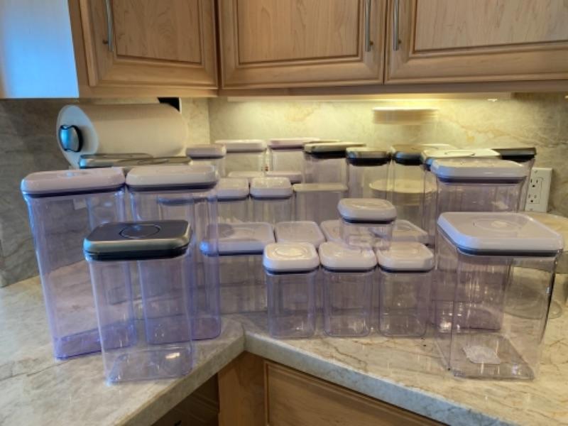 Lot 14. Large collection of kitchen Oxo canisters--$95. New or like new.