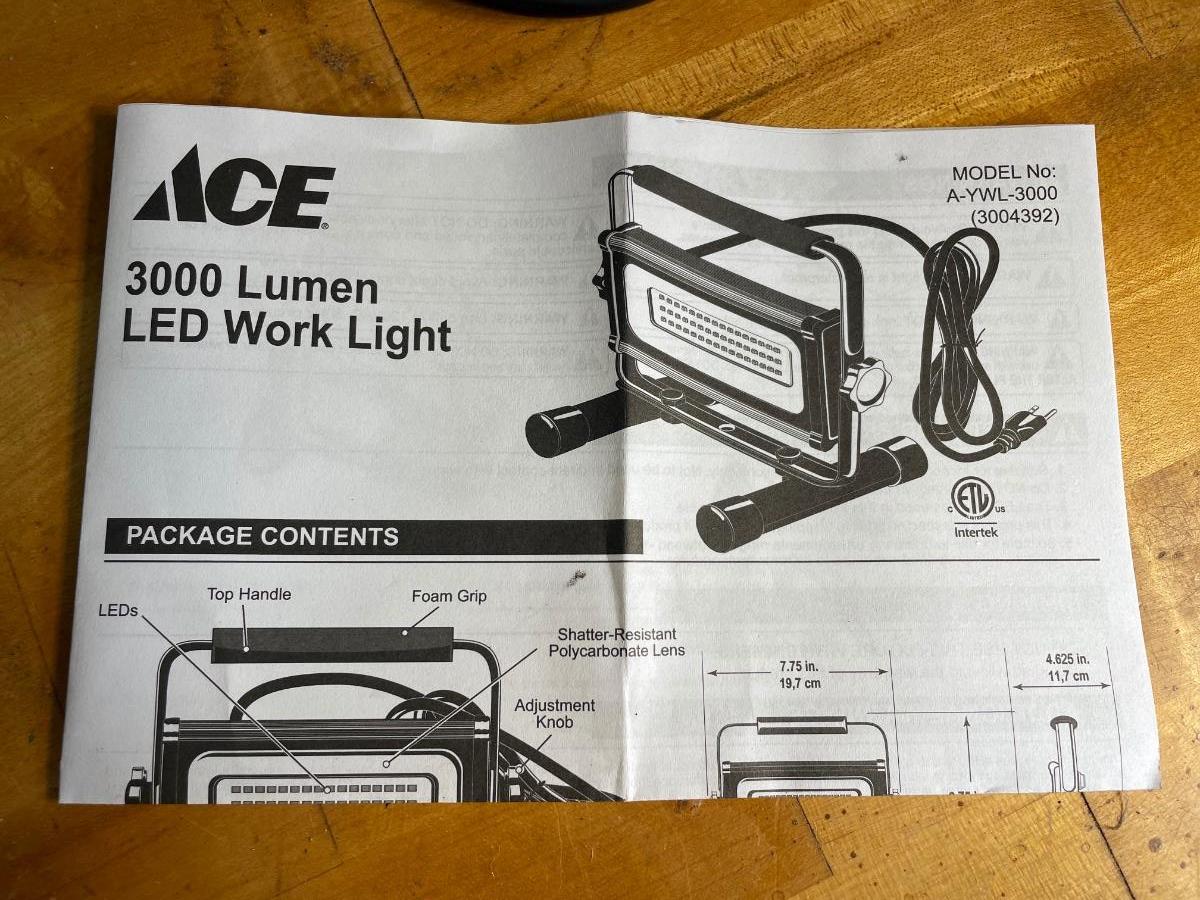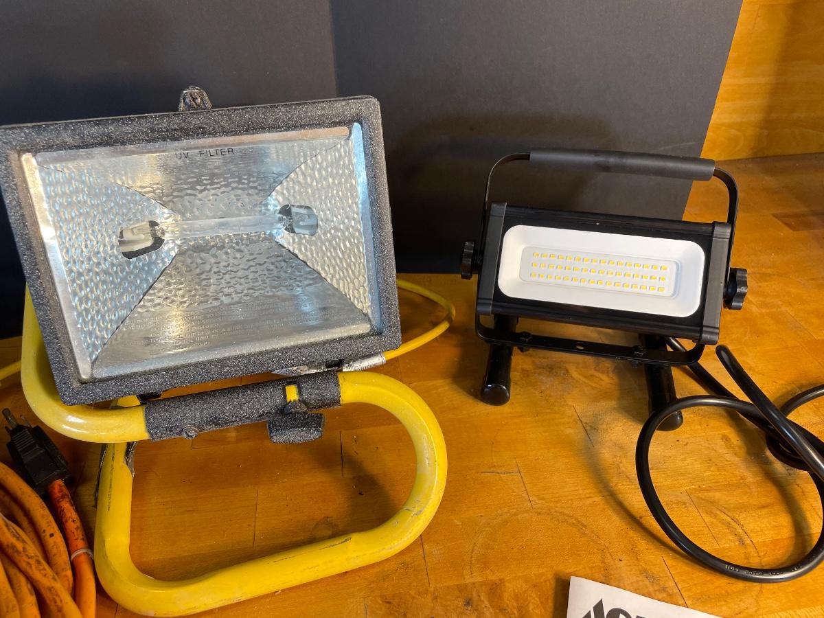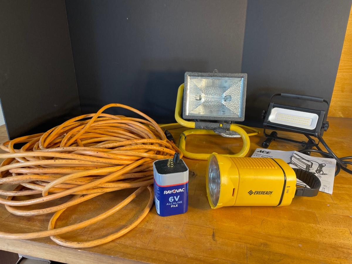 Two work lights, long heavy duty extension cord and a fat flashlight