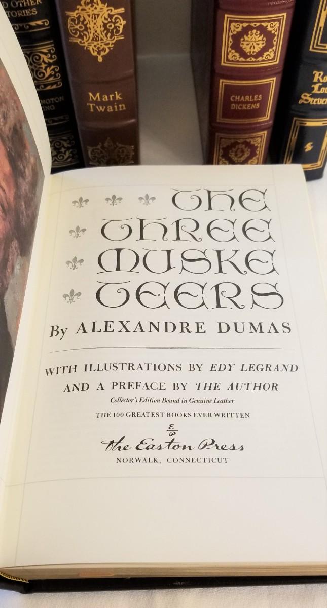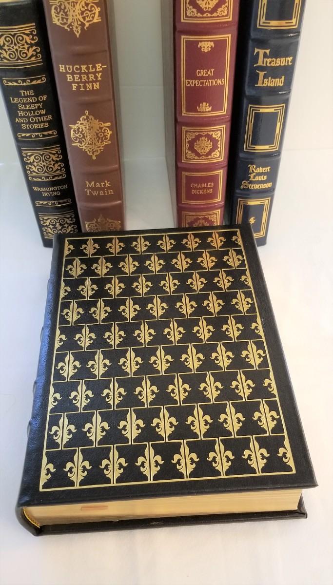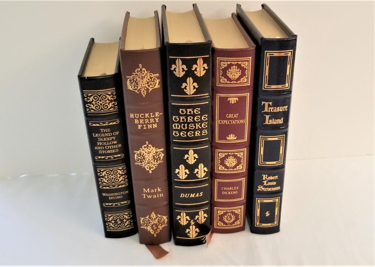 These beautiful leather bound books are literally like new - have never been read. These are from the Easton Press series "Greatest Books of the World". You get all you see here: Legend of Sleepy Hollow and Other Stories, The Three Muskateers, Great Expectations, Treasure Island, and Huckleberry Finn. These books sell on ebay for 10.00 - 30.00 each.