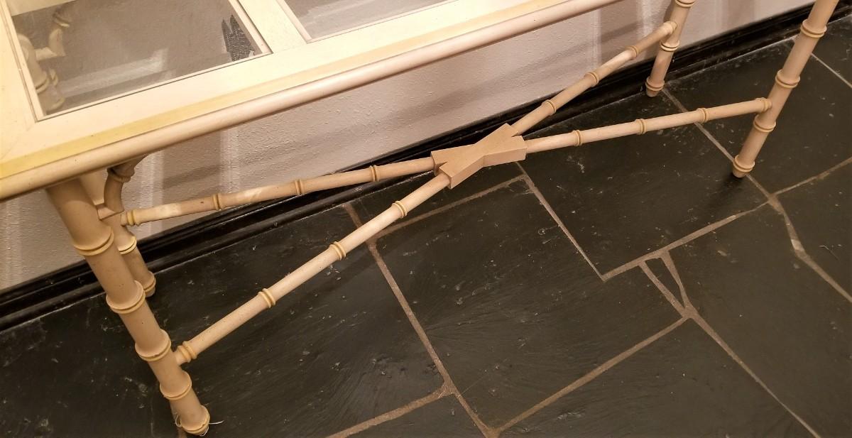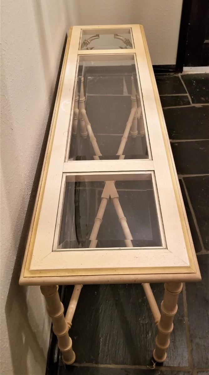 This mid-century faux rattan side/foyer table is in good condition - beveled glass inserts that lift out for moving/cleaning. 54" long, 26" tall, 14.5" deep. Could be painted any color you desire. A matching display cabinet will come up later in the sale.