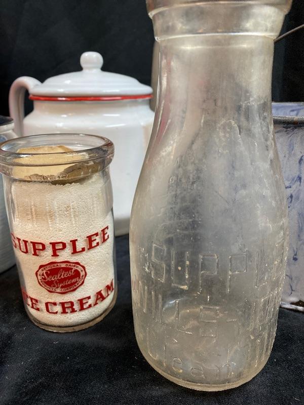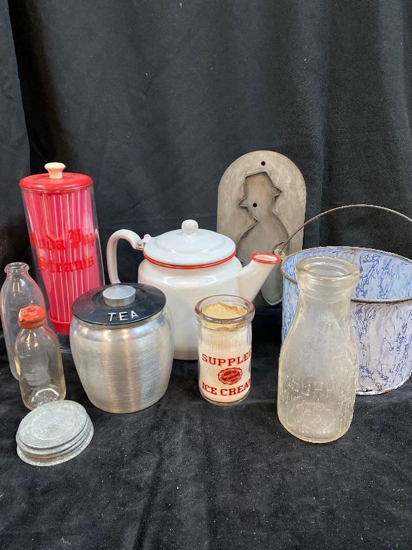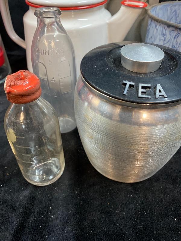Chromex 1950’s Aluminum yea canister, Sealtest System dairy products 1939 glass jar, glass baby bottles, Supplee wills-Jones glass milk jar and more. Please see all pictures for condition of the items listed and what is included in the lot. Pictures will also show any measurements if taken and is the best representation of the items. Thank you for looking and have fun bidding! We appreciate Treasure Hunters!