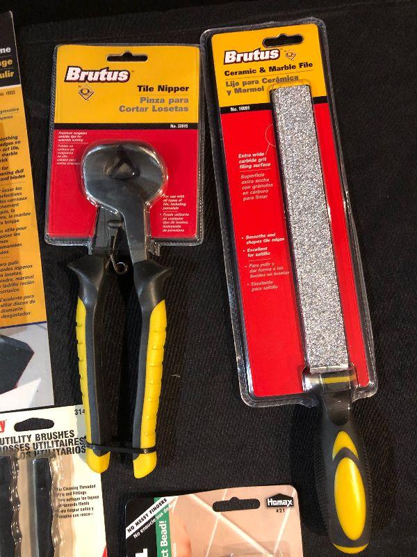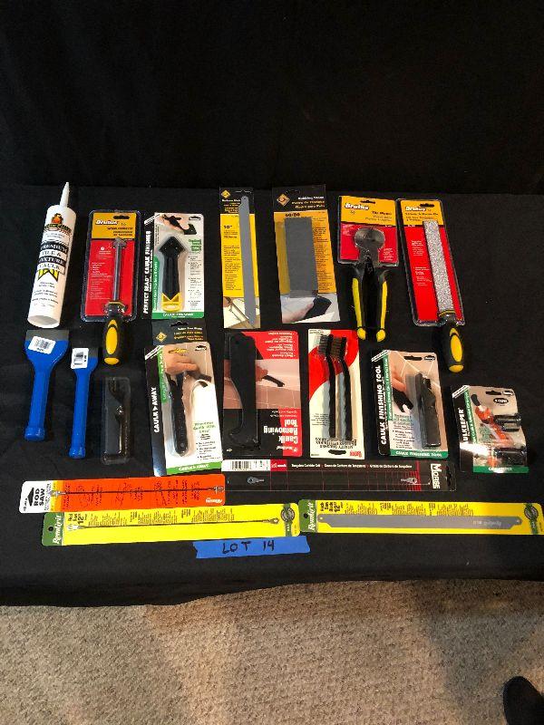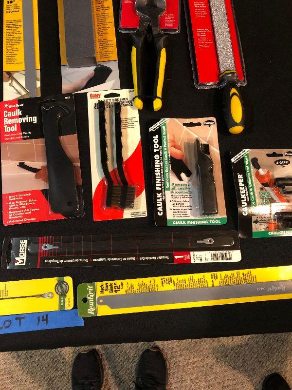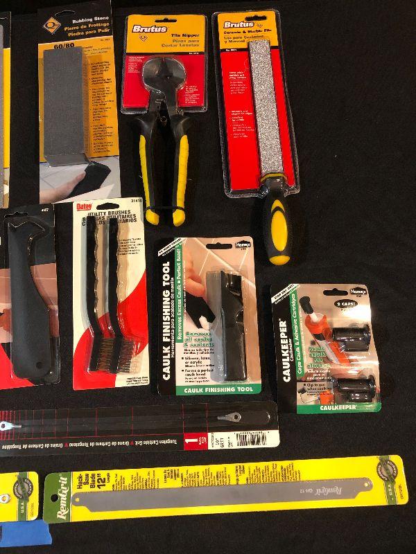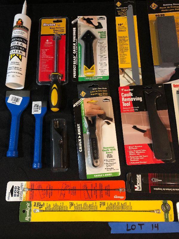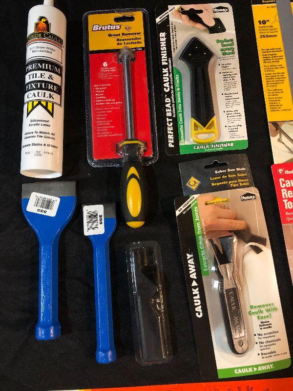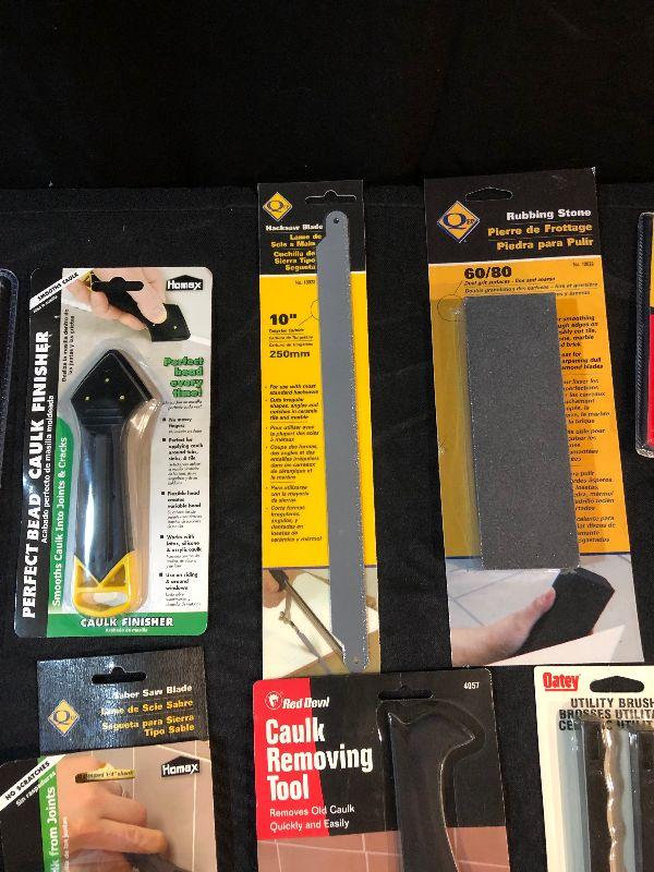 New hardware and tools including ceramic file, blades, caulk, chisels, rubbing stone and other miscellaneous items.