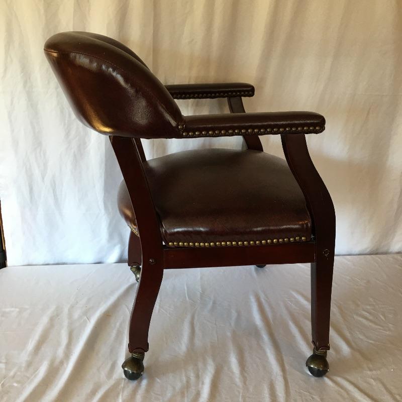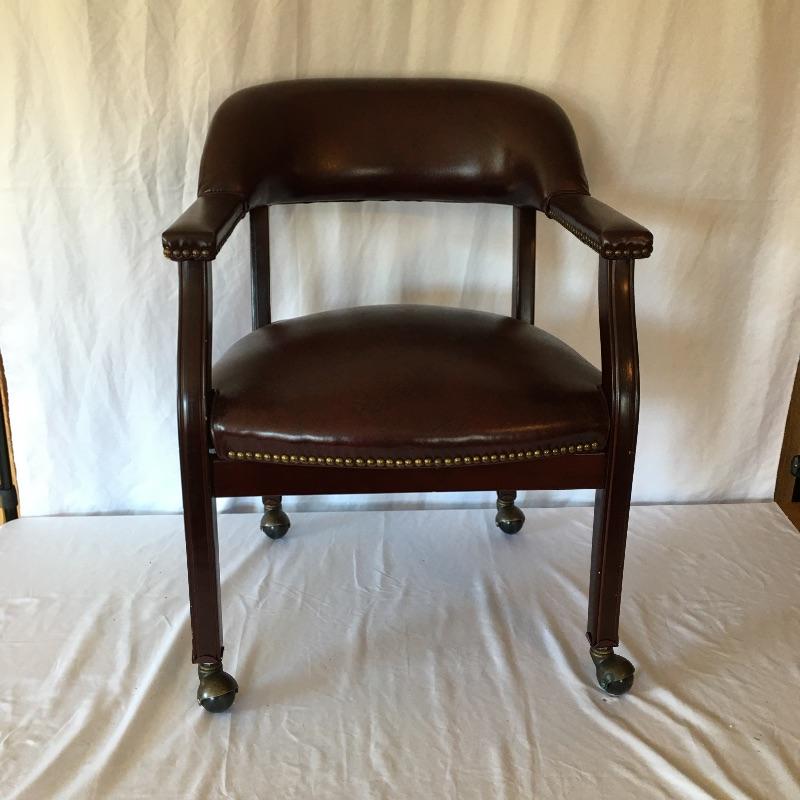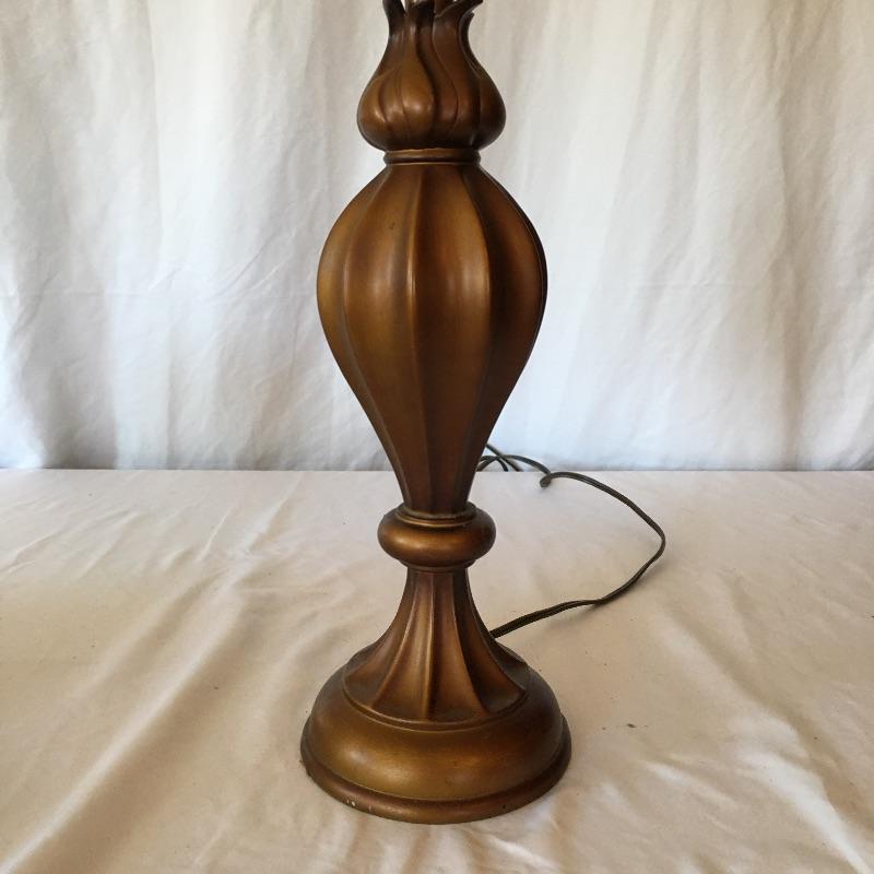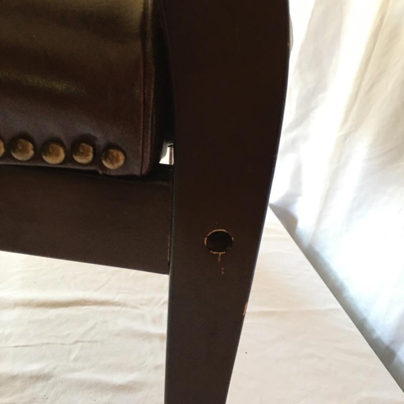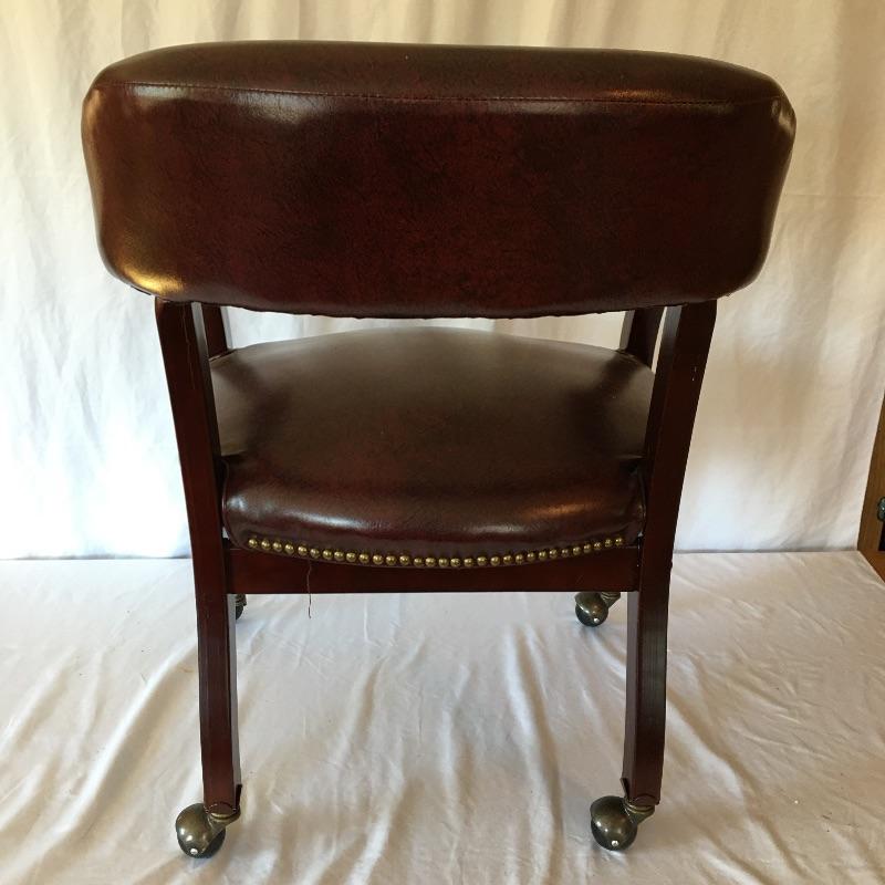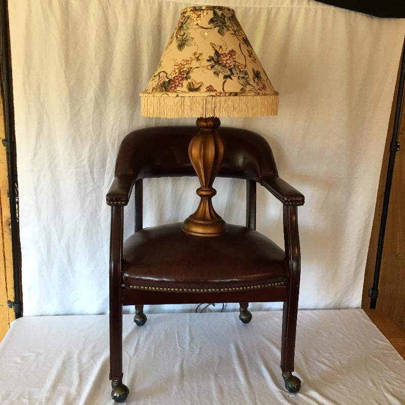 This lot includes an office chair with wheels and has a nail head trim with vinyl padded seat and back and a lamp with a tasseled shade. Lamp appears to be made of plaster and chair is missing two plugs for covering screws, see pictures. Lamp illuminates when tested.