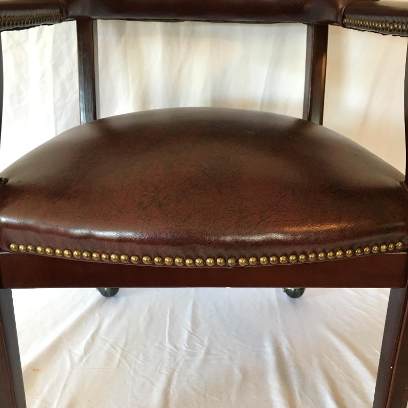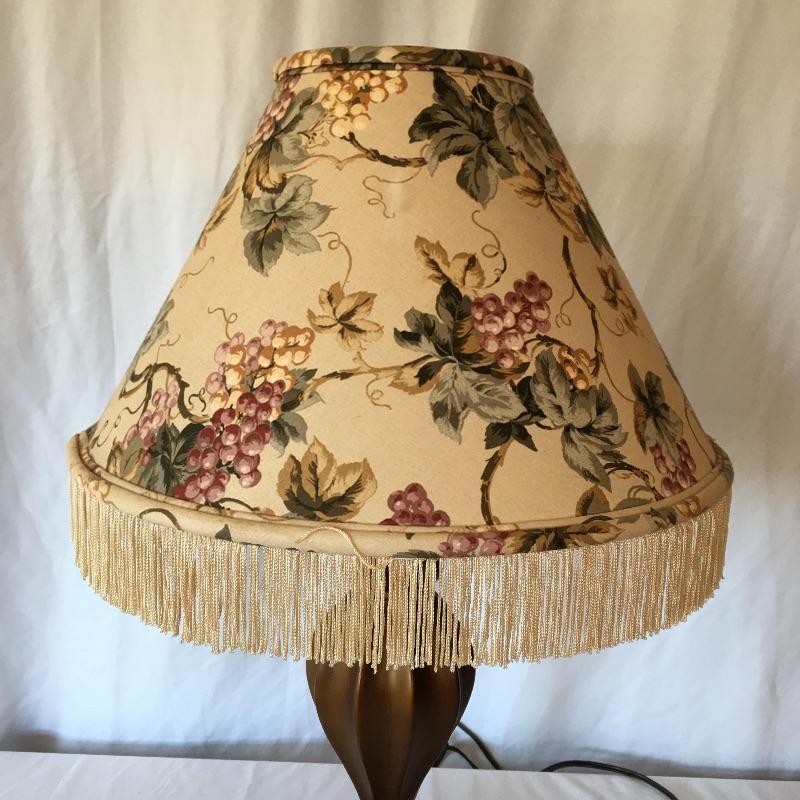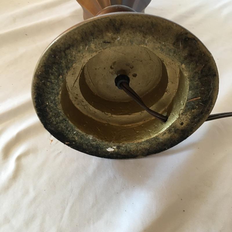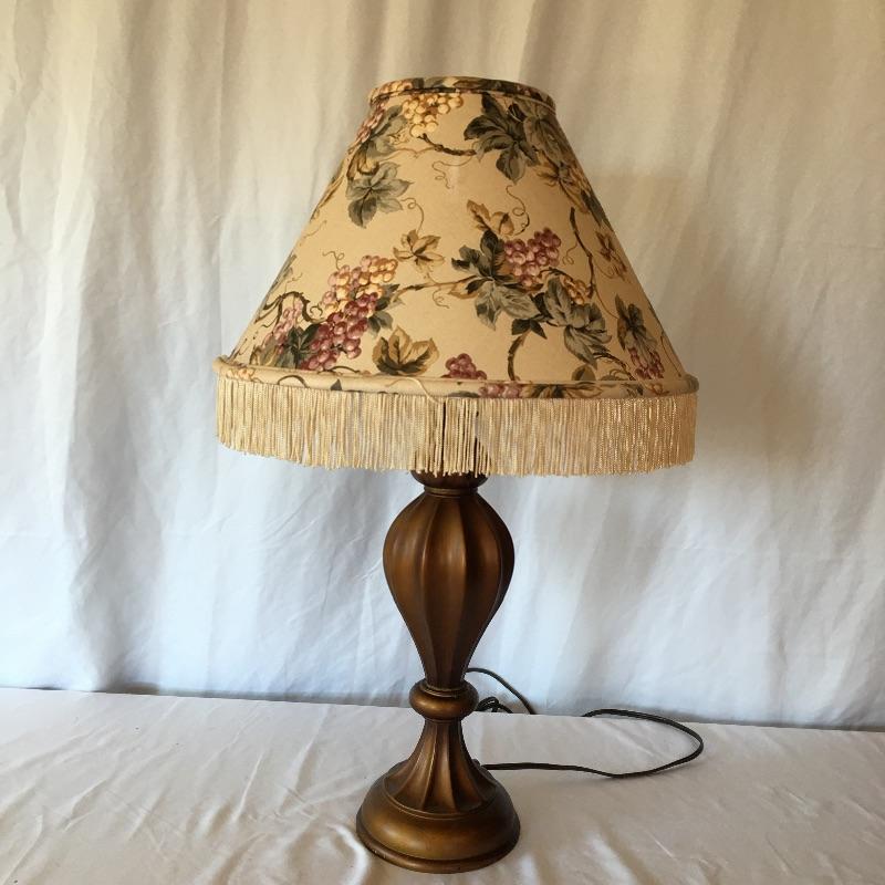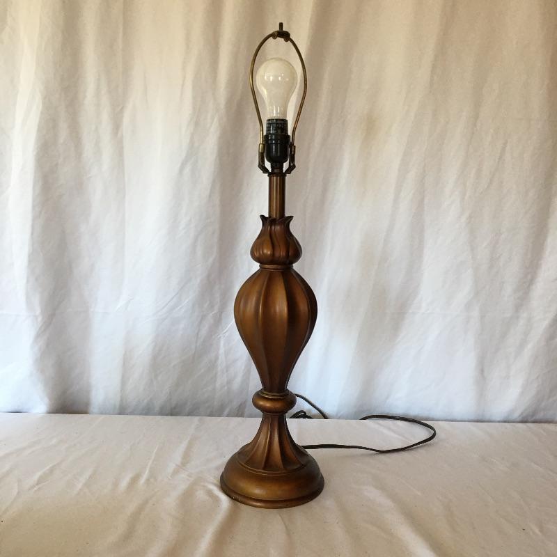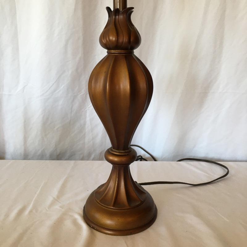 This lot includes an office chair with wheels and has a nail head trim with vinyl padded seat and back and a lamp with a tasseled shade. Lamp appears to be made of plaster and chair is missing two plugs for covering screws, see pictures. Lamp illuminates when tested.