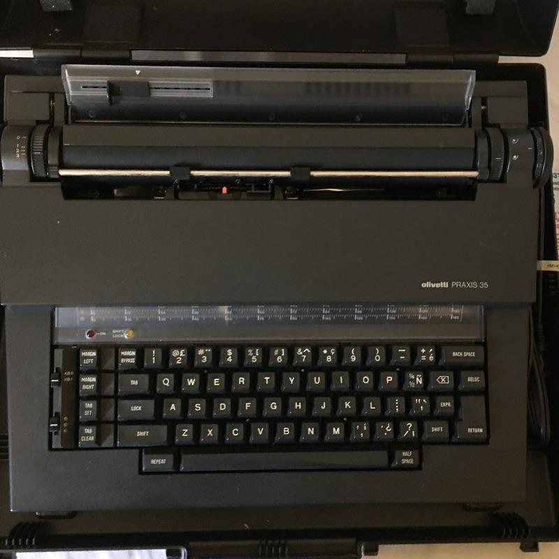 Olivetti Praxis 35 typewriter with case and extra ink cartridges and lift off tape. Typewriter worked when tested and is in excellent condition.