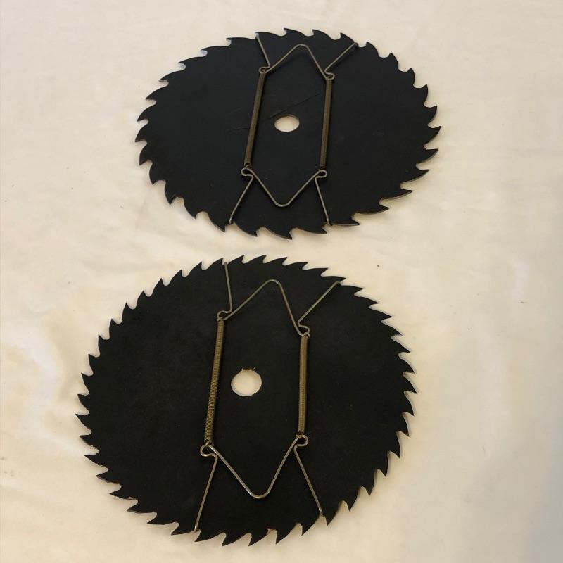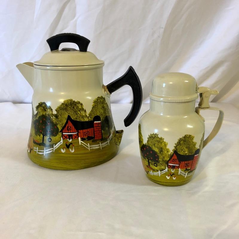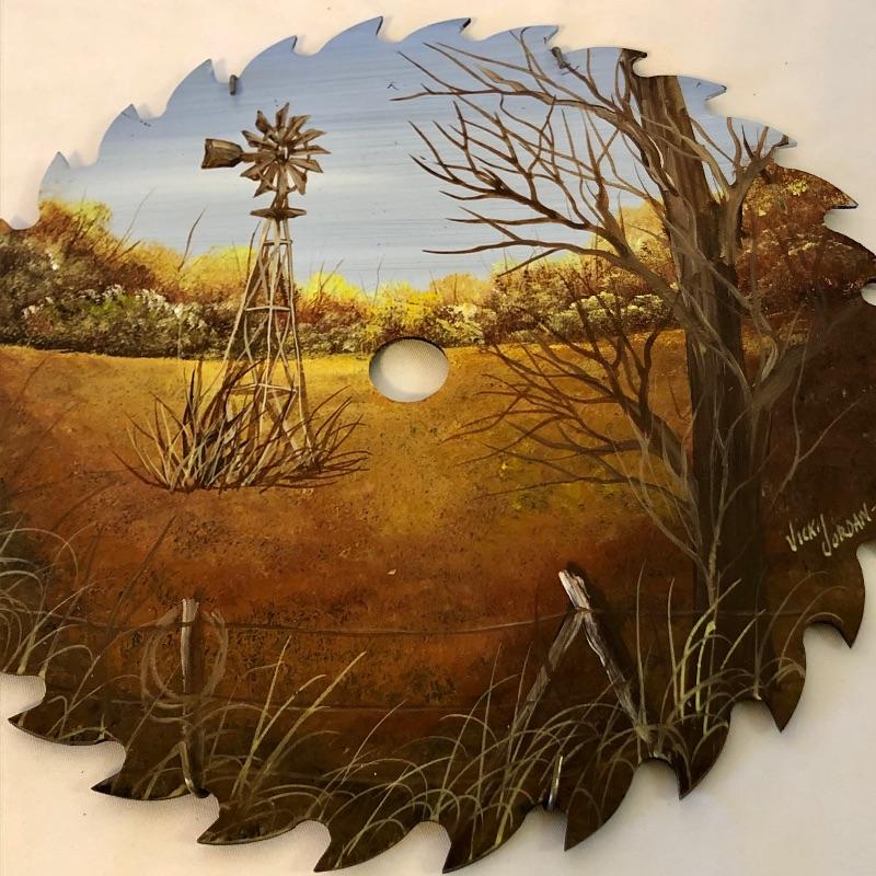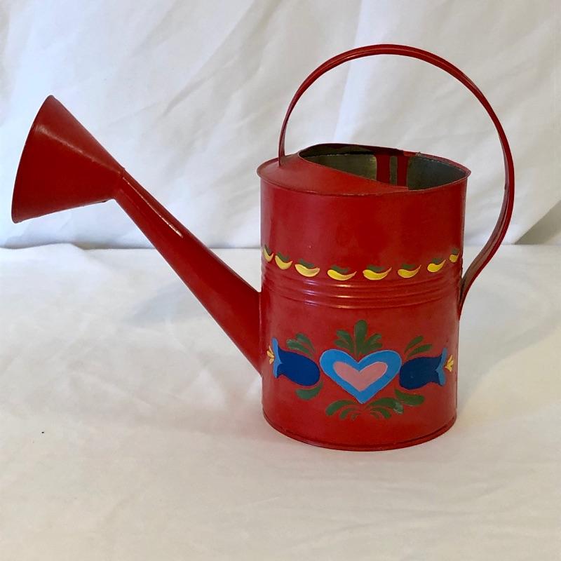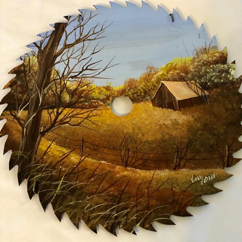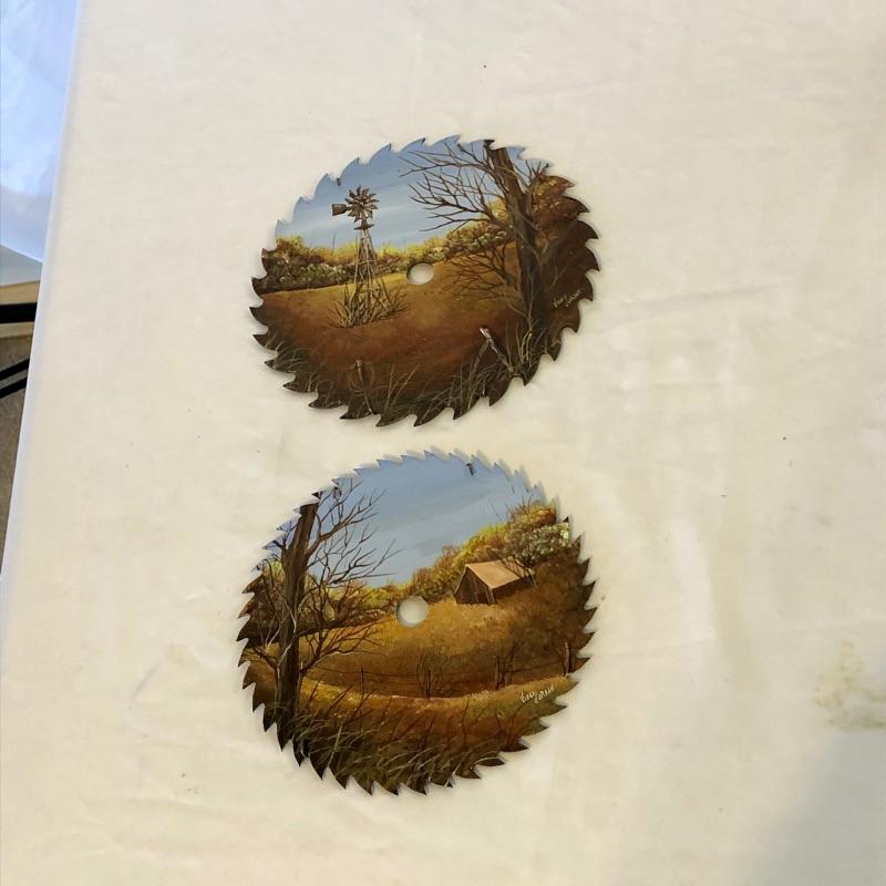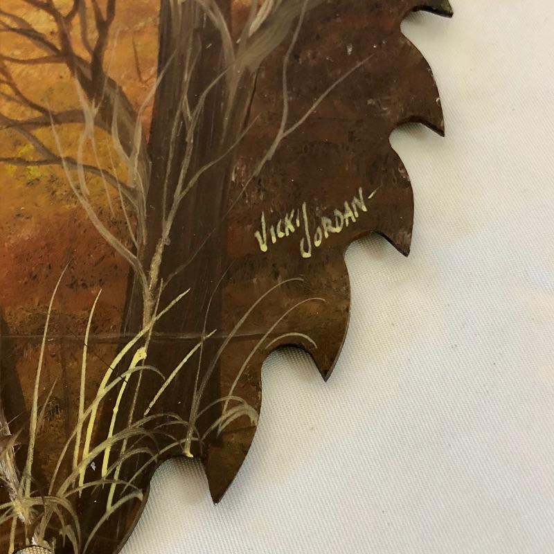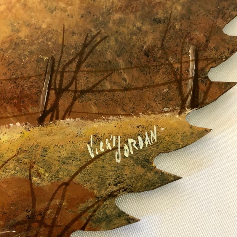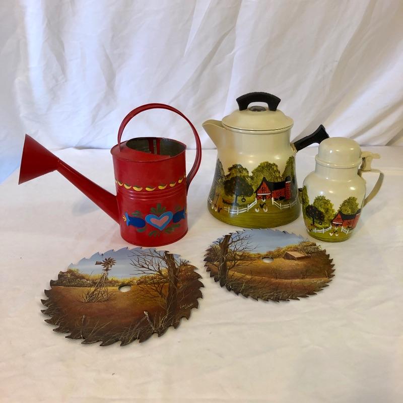 This charming assortment of country decor items includes a pair of signed Vicky Jordan painted saw blades that come complete with their hanging hooks in place. We have added some more painted metal pieces that includes a matching camp style kettle and jug and a red decorative watering can.