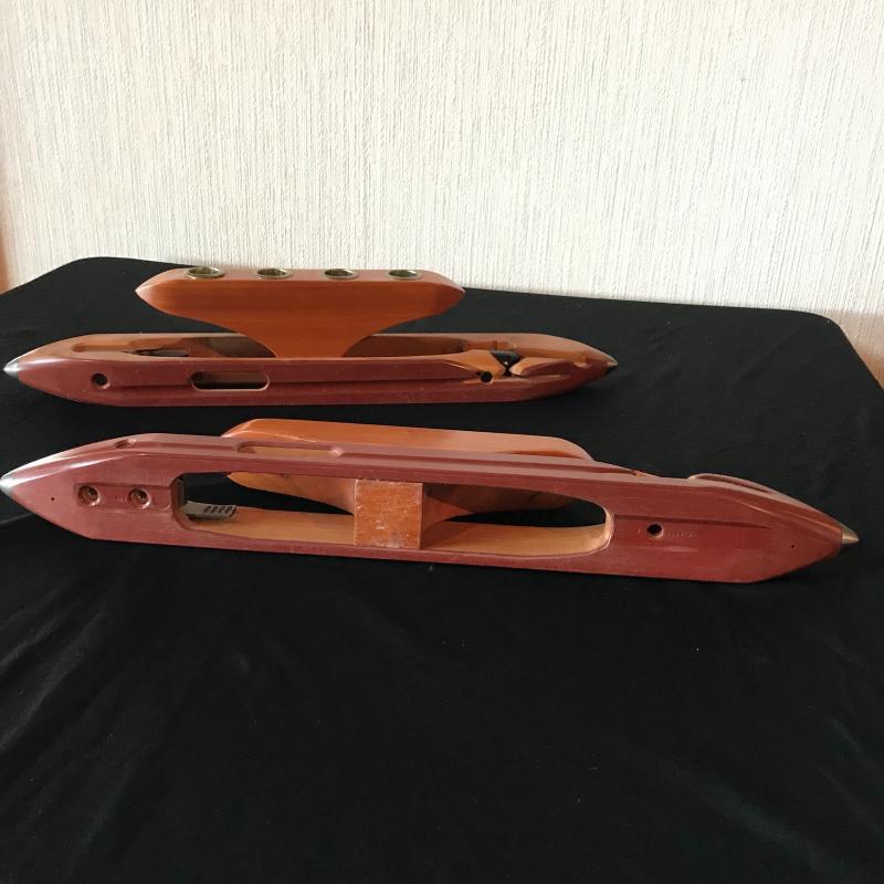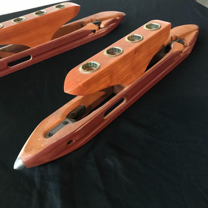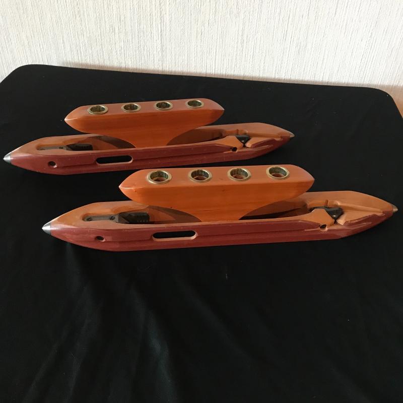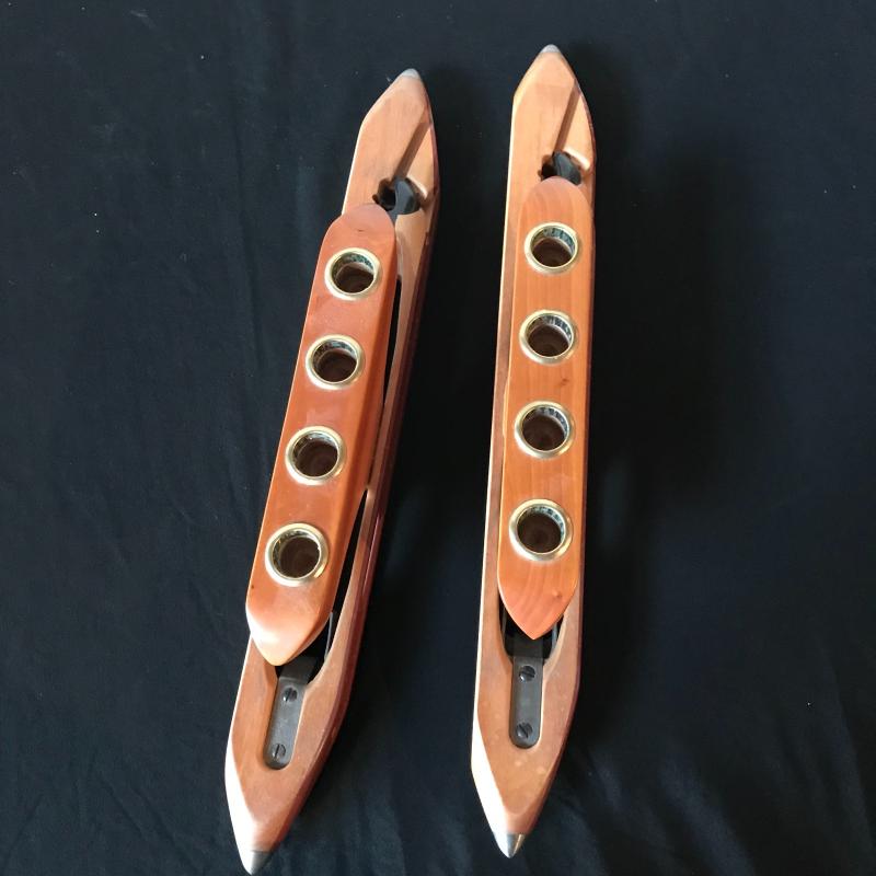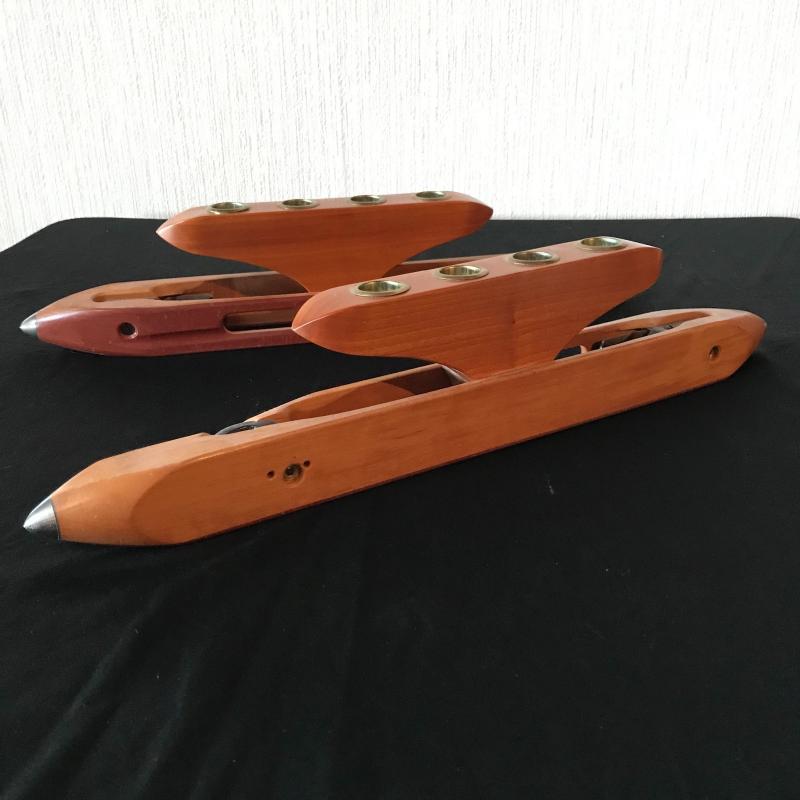 Two custom wood candle holders made from vintage bobbins measuring 19.5” x 4”. Both are in great condition and what a great use. Shipping available.