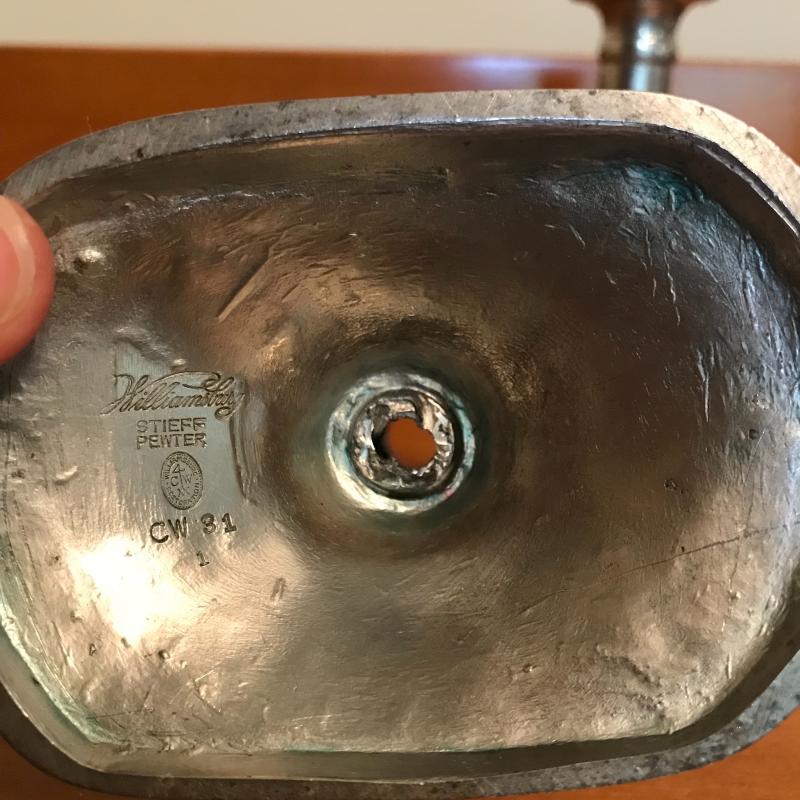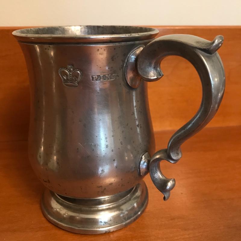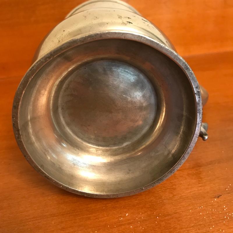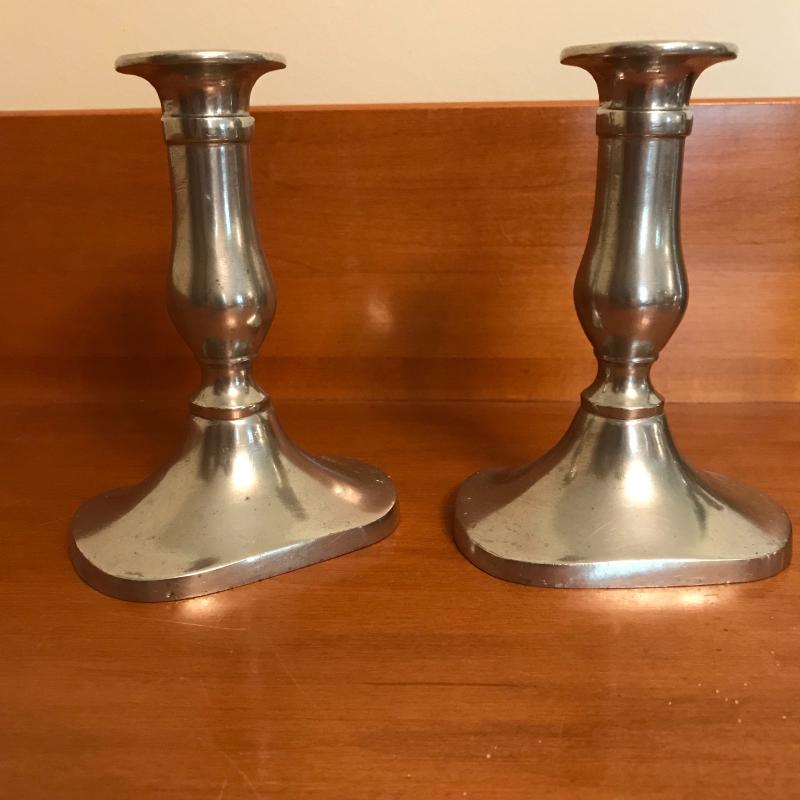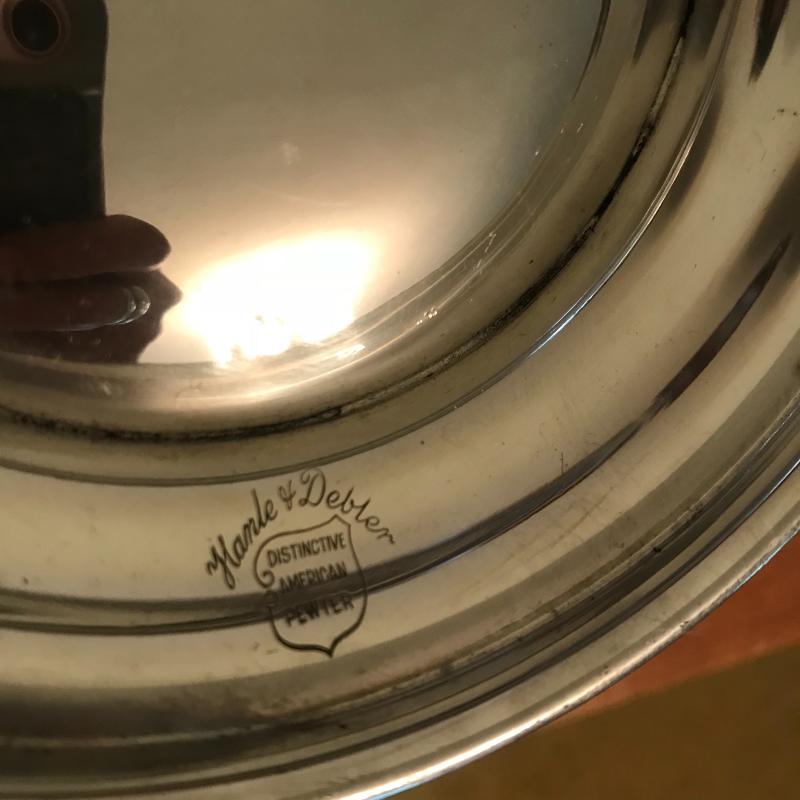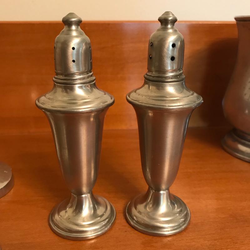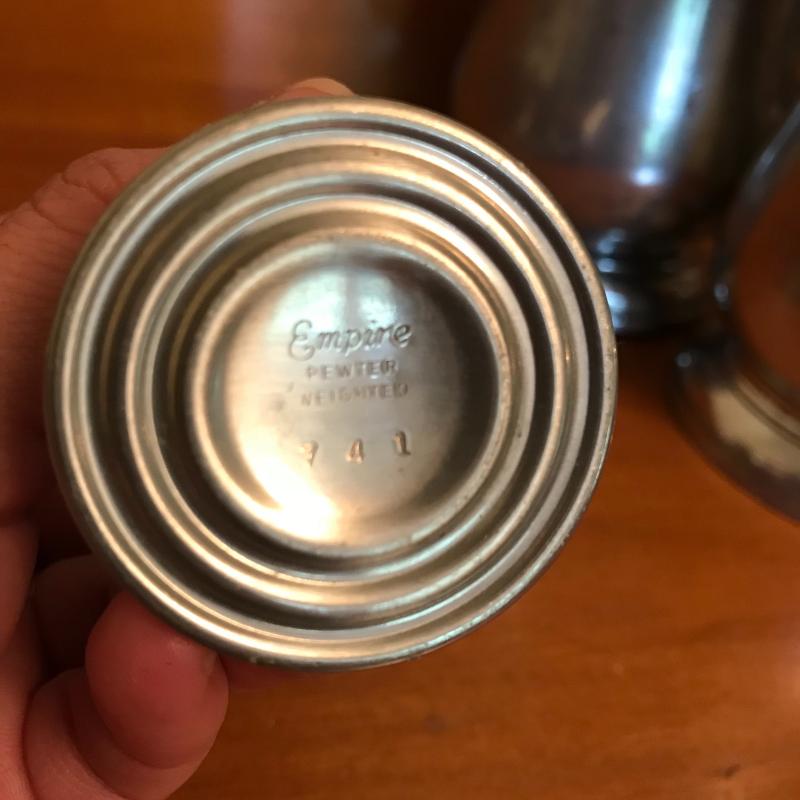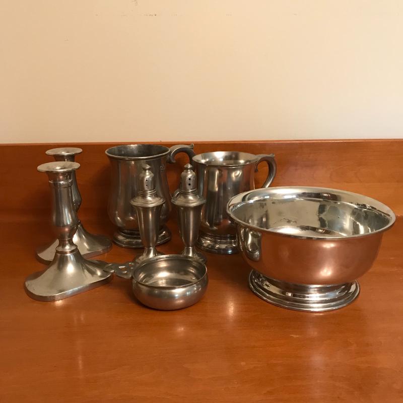Fun collection includes two beer steins, one is engraved on one side the other has a crown and “pint” stamped near the handle (this is the only piece without a Pewter stamp on the bottom). Two candle holders, salt & pepper shaker, and two bowls round out this lot. Candlesticks are 5.5” high. Shipping or Local pick up.