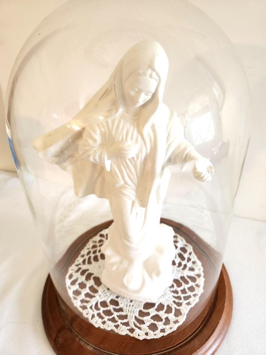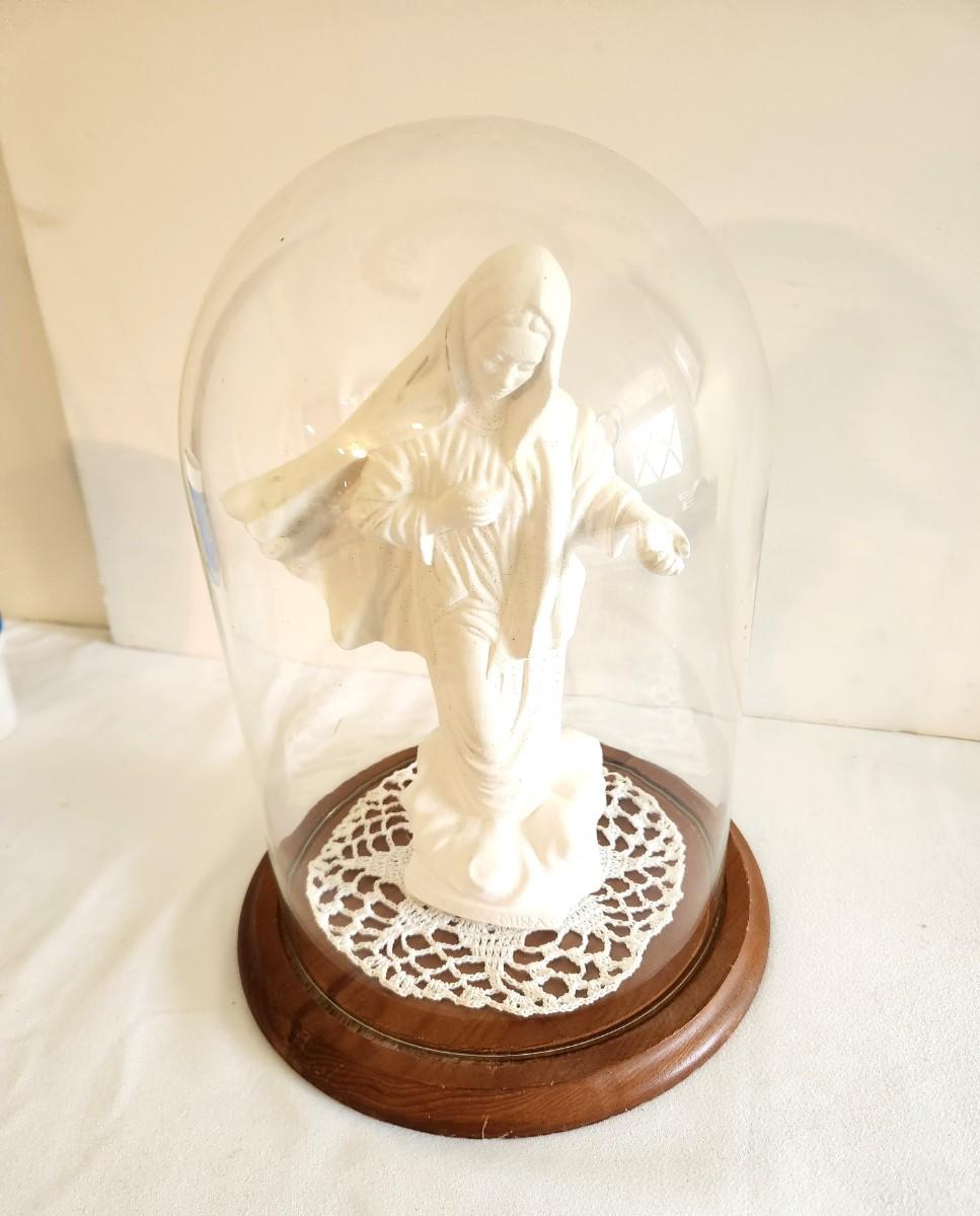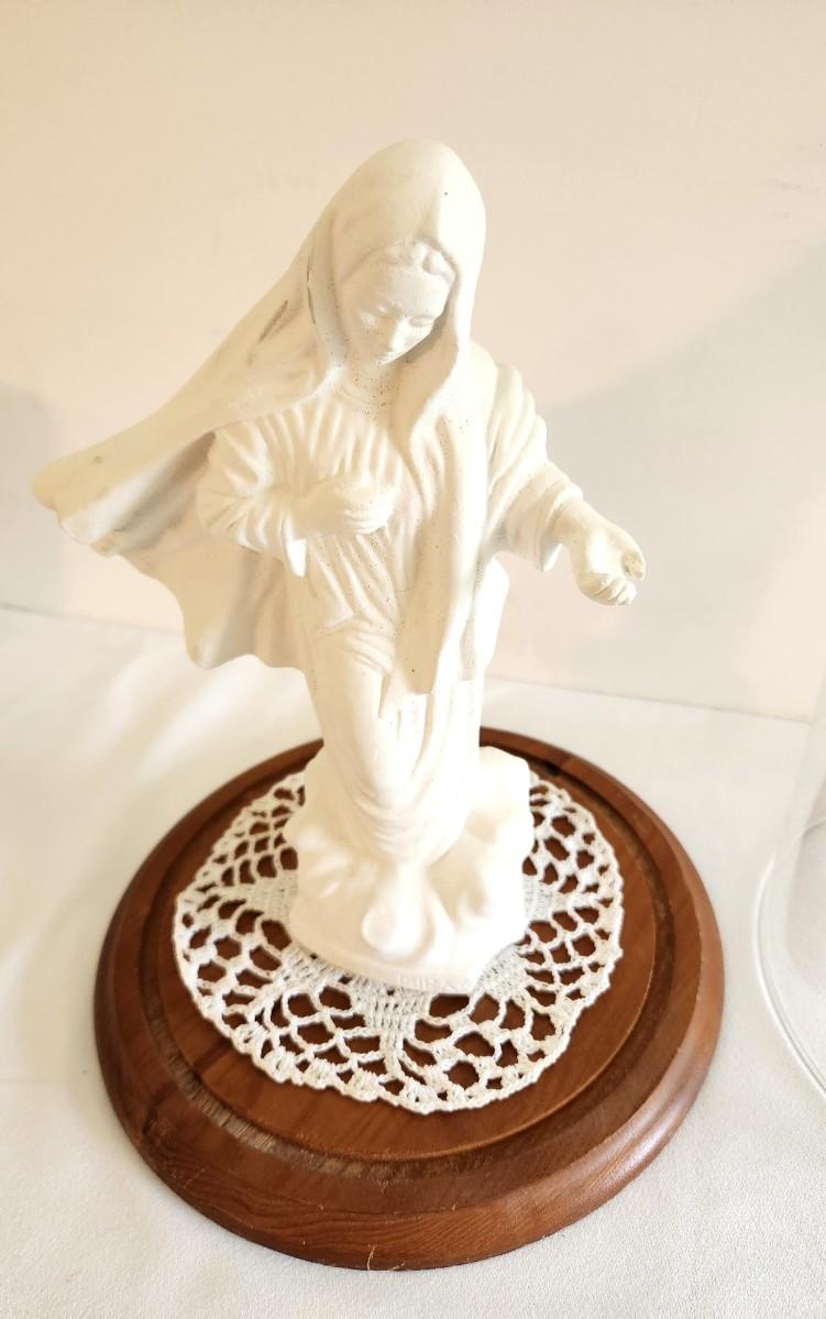 Plaster statue of the Virgin Mary as Our Lady of Medjugorje under plastic dome - wooden base. 12" tall. Good condition. No maker noted.