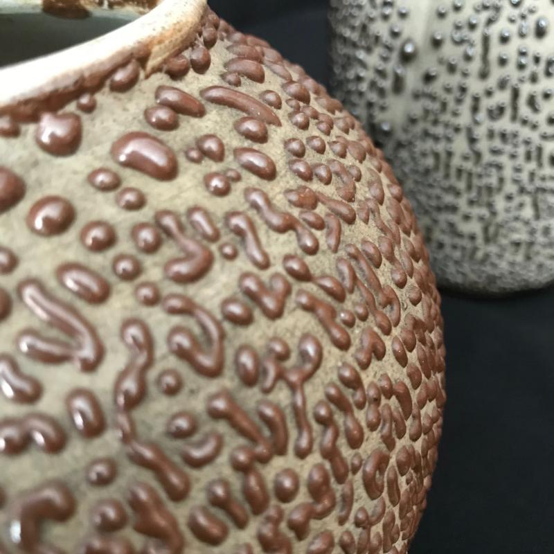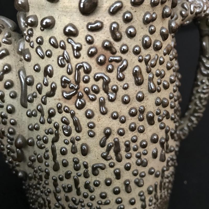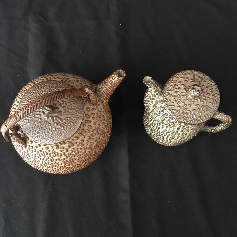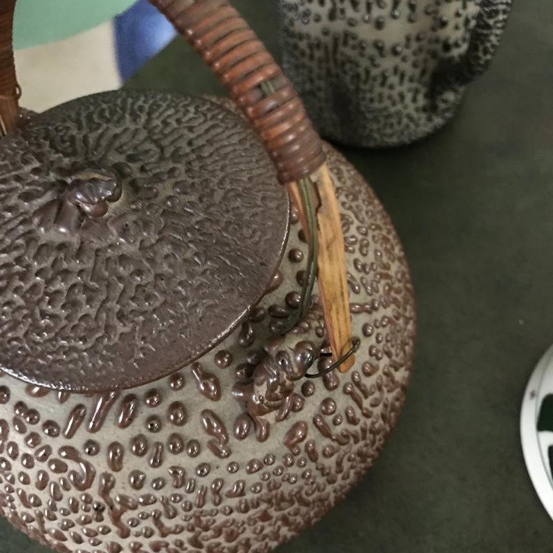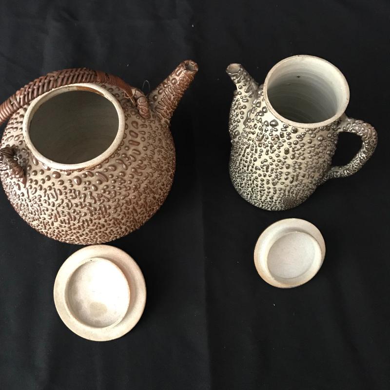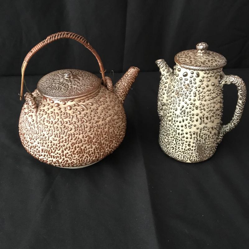 Pitcher and Tea Pot Set has a fantastic drip texture called Shigaraki oil spot glazing. From Japan. Both measure almost 8” tall (teapot handle up). Woven handle has a little damage. See pictures. No known signatures present. Shipping available.