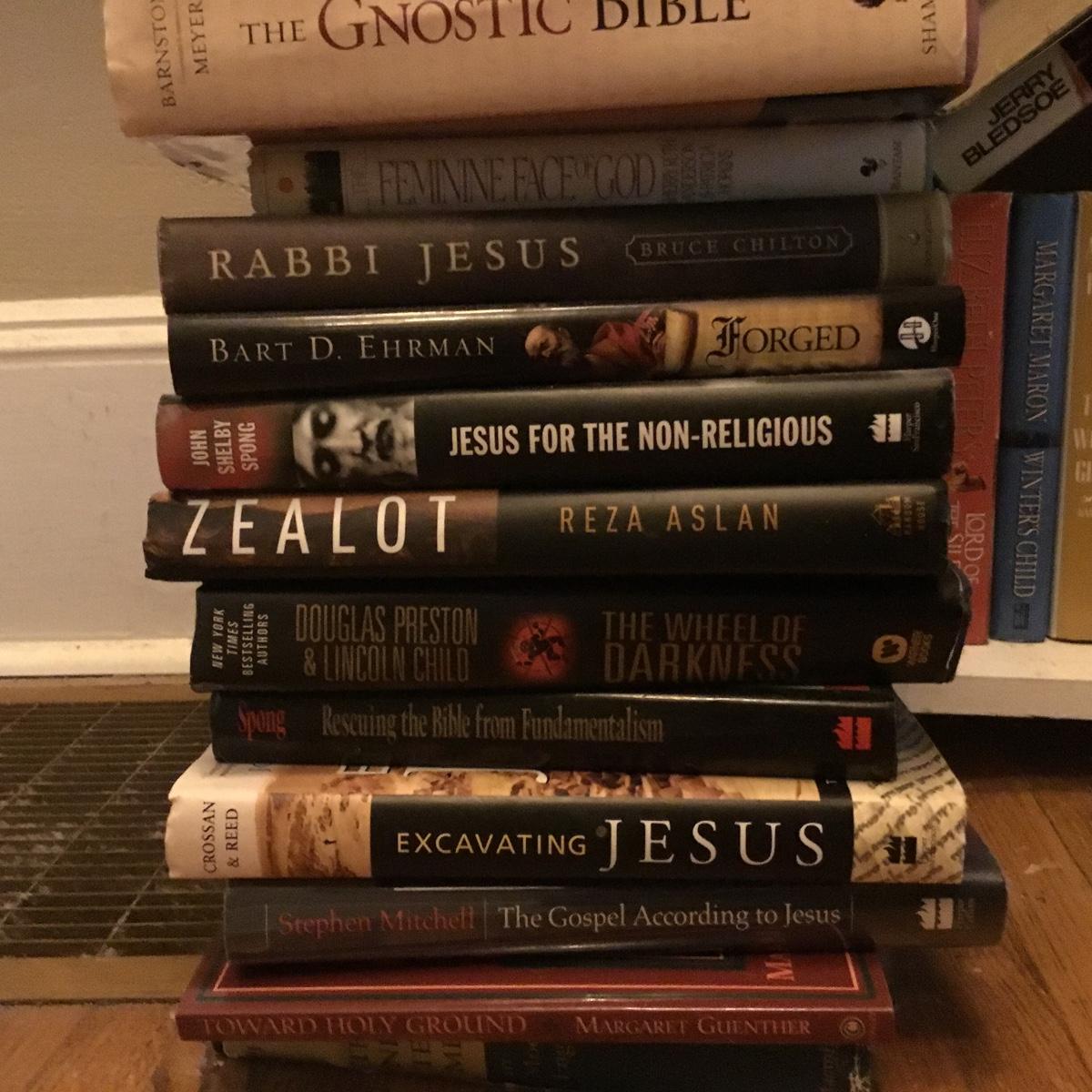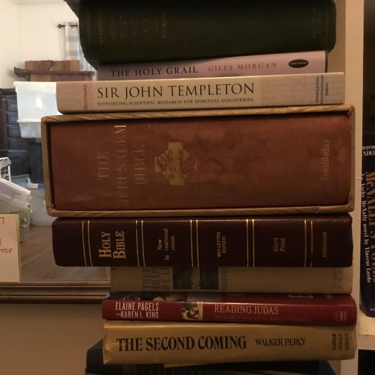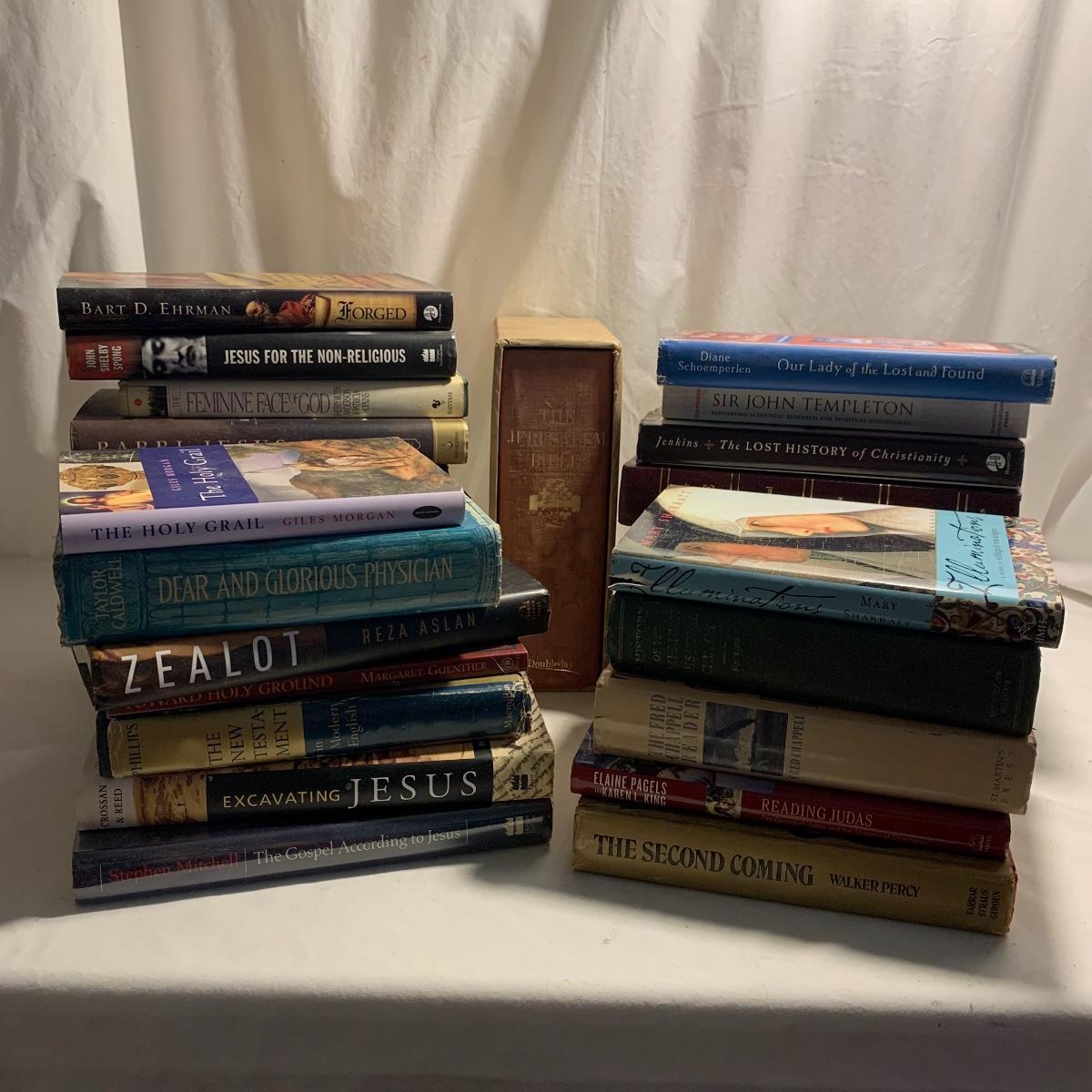 There is a collection of religious books included in this lot. They focus on Christianity. Approximately 30 books are included. Some of the titles are: The Jerusalem Bible, The Holy Grail by Giles Morgan, Illuminations by Mary Sharratt, Jesus for the Non-Religious by John Shelby Spong, The Feminine Fave of God by Sherry Ruth Anderson & Patricia Hopkins, and more. Some are fiction novels and some are nonfiction. Shipping is available.