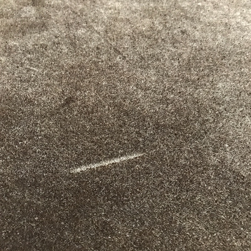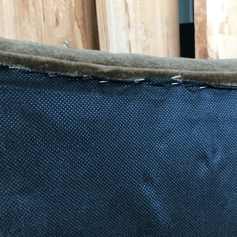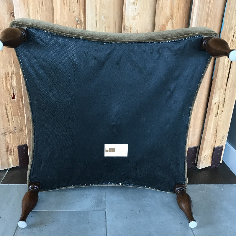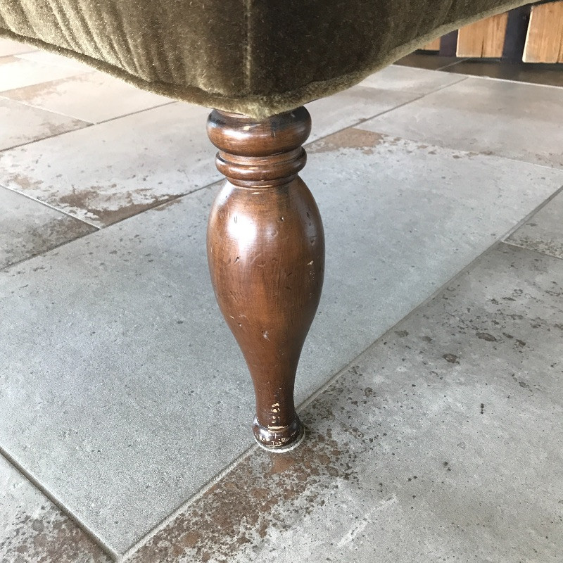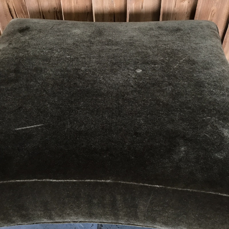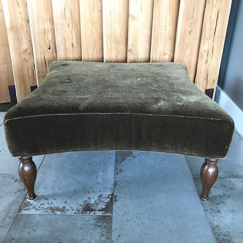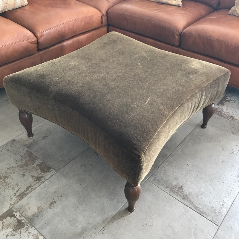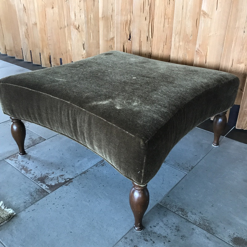 This nice square ottoman is a velvety dark moss green and would make a lovely accent to your living room. As well as a stylish foot rest it could be used as extra seating or as a coffee table. This piece is velvety to the touch but is an unknown fabric. It has a few marks (not stains) that are from items sitting on top, see images. Wooden legs have a few marks from wear and tear, again see images. Measures 35” x 35” x 17.5”.