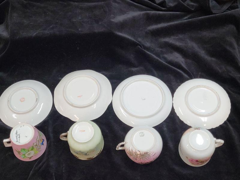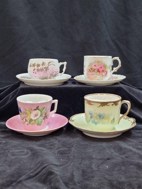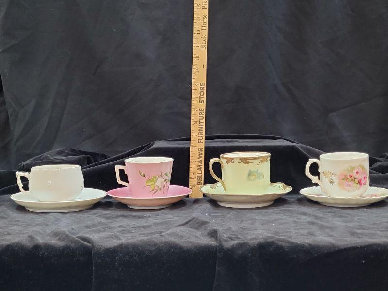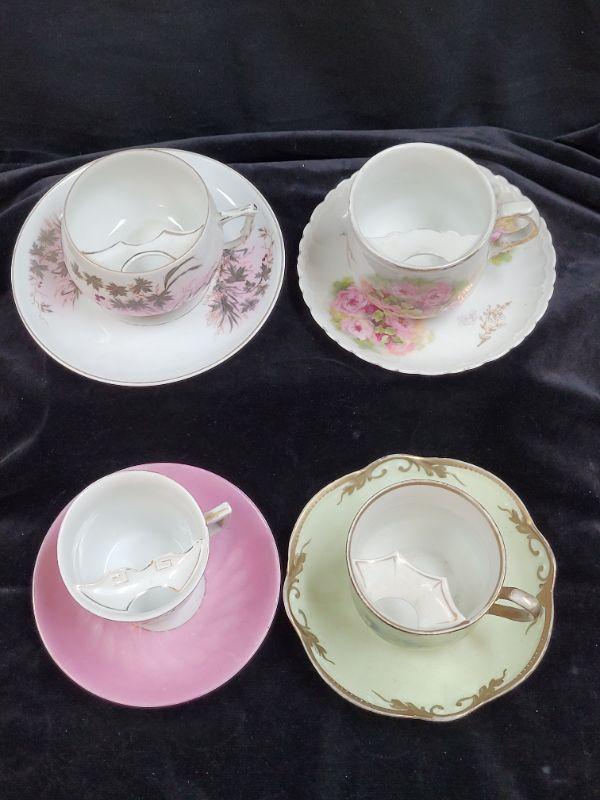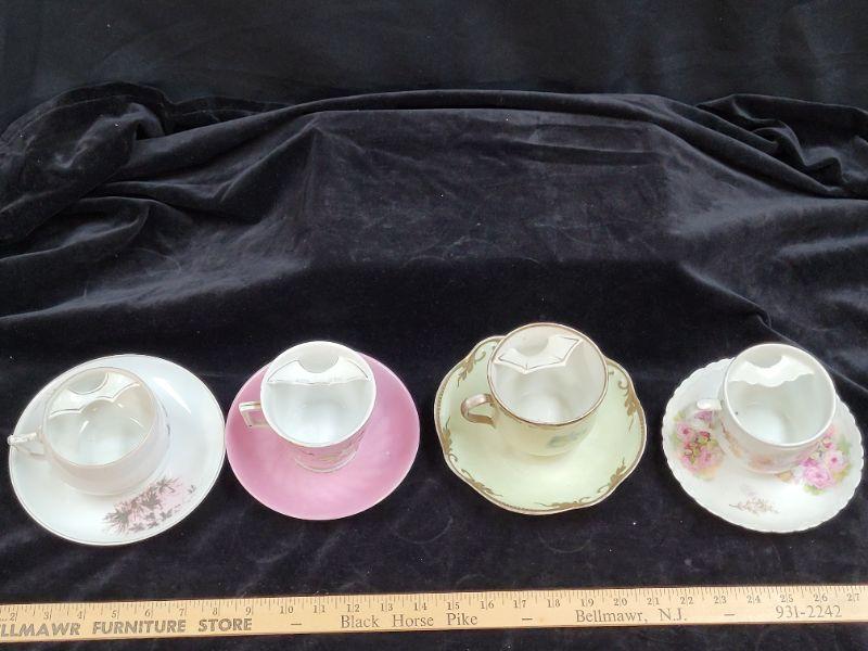 Set of 4 mustache tea cups and saucers. Various makers.