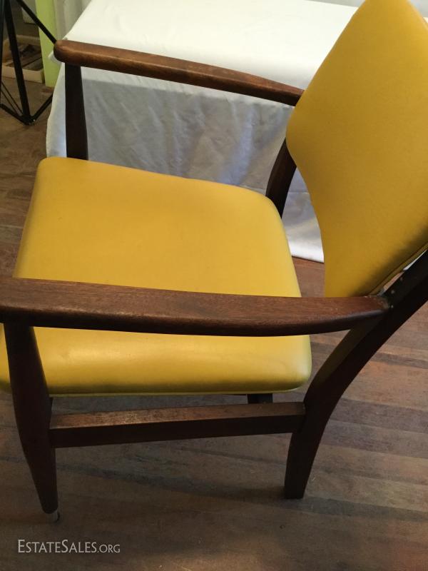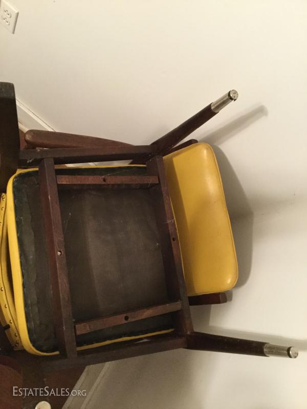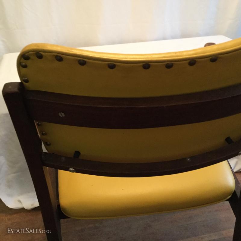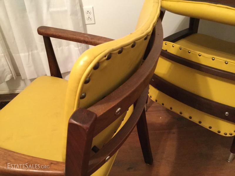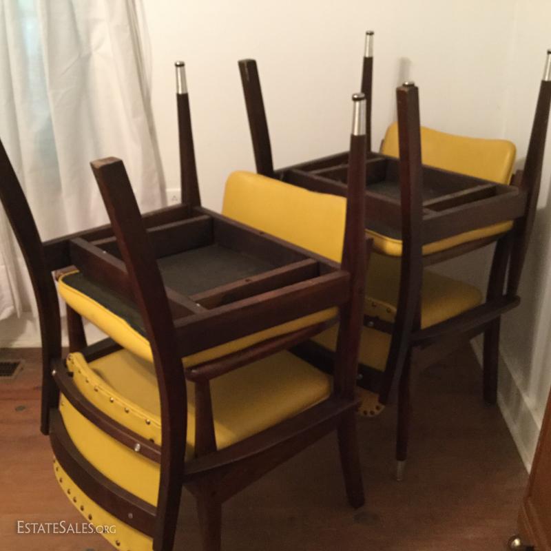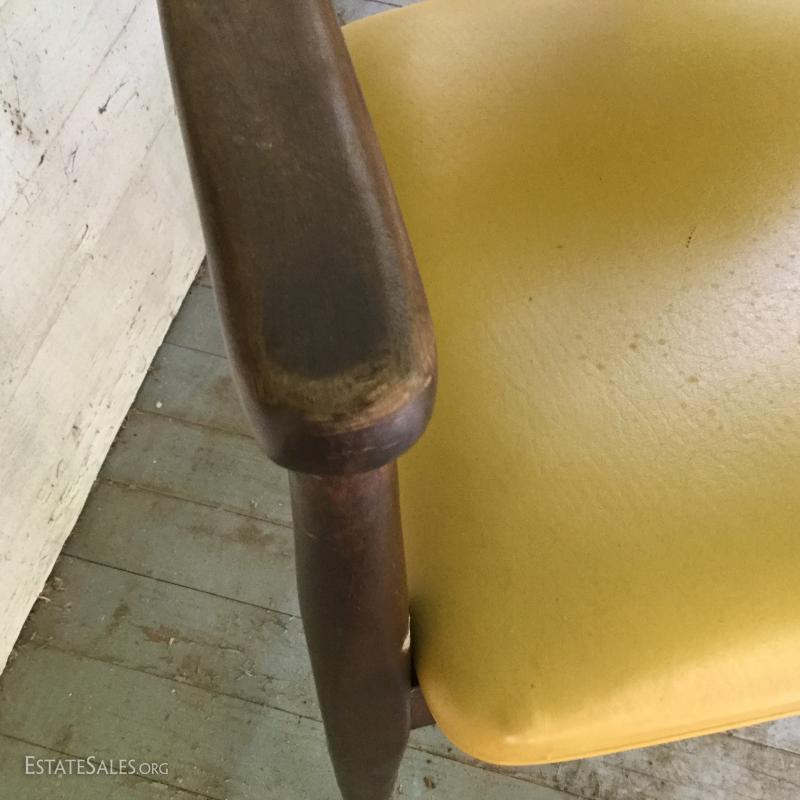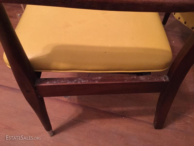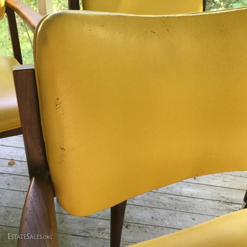 Four solid wood, MCM "Mustard Yellow" Vinyl covered chairs. Minor scratches a rips.