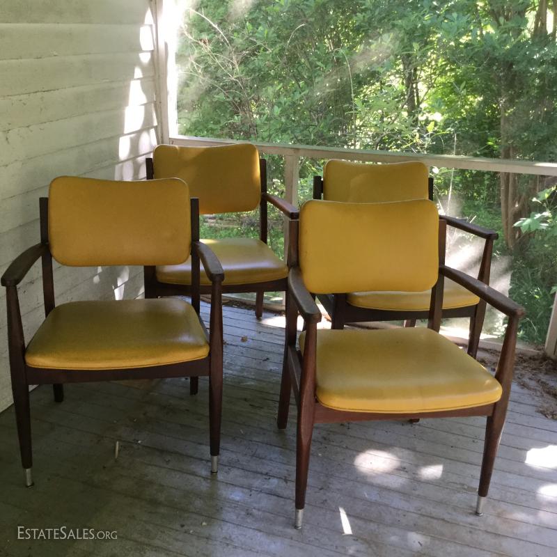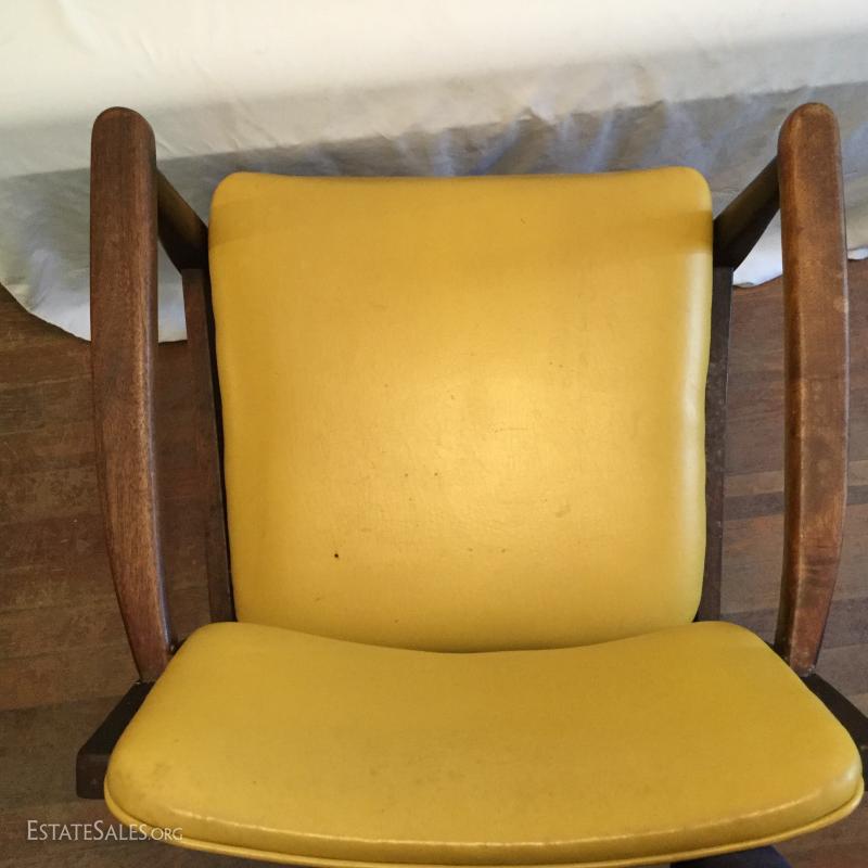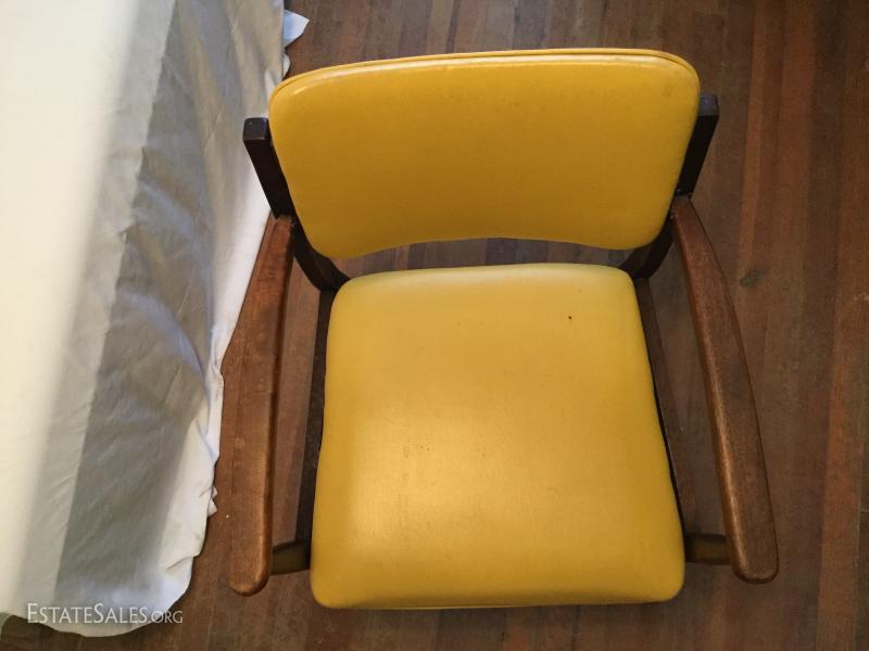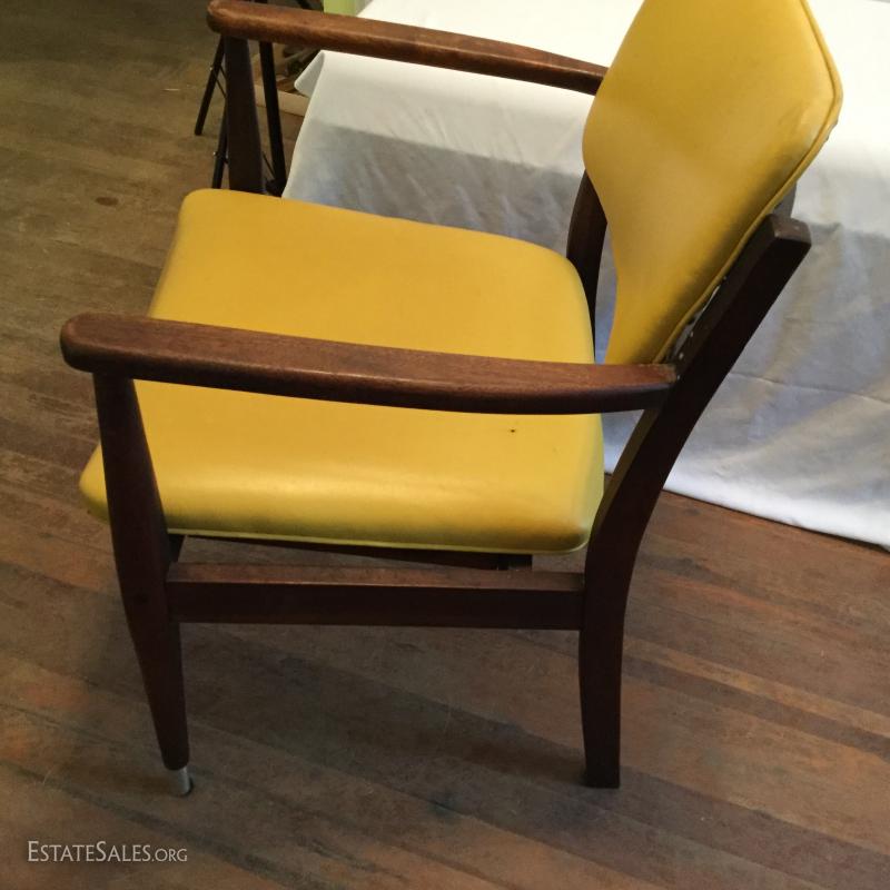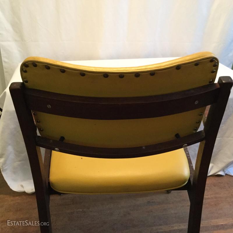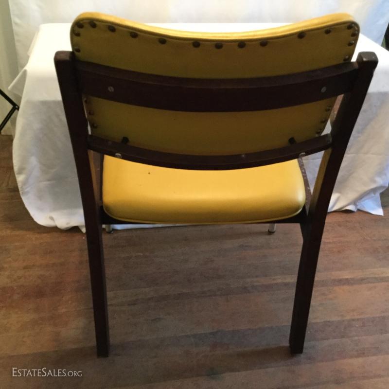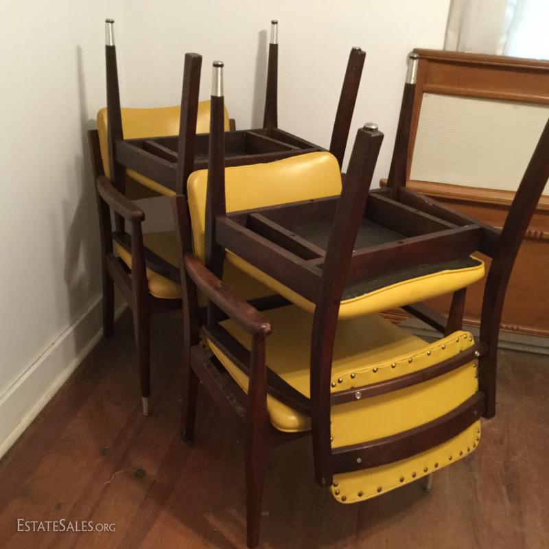 Four solid wood, MCM "Mustard Yellow" Vinyl covered chairs. Minor scratches a rips.