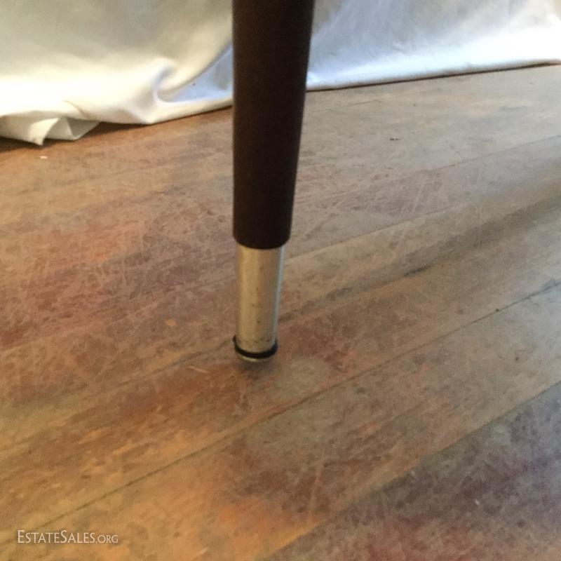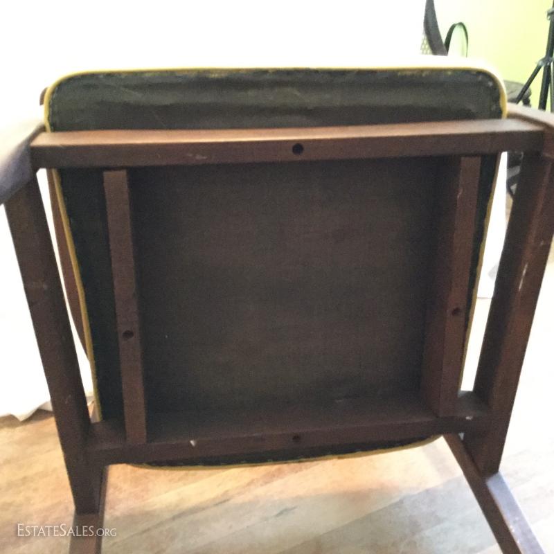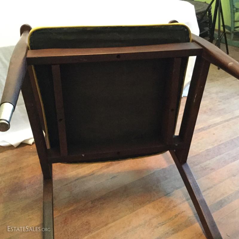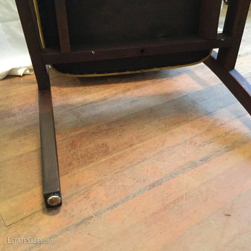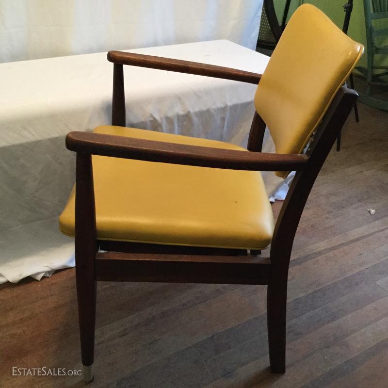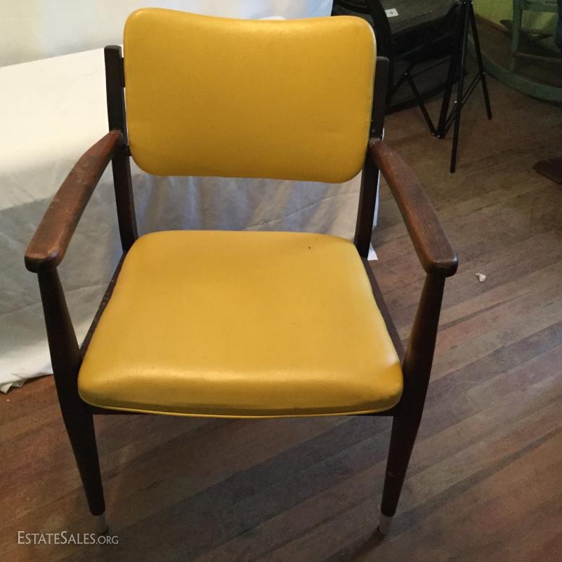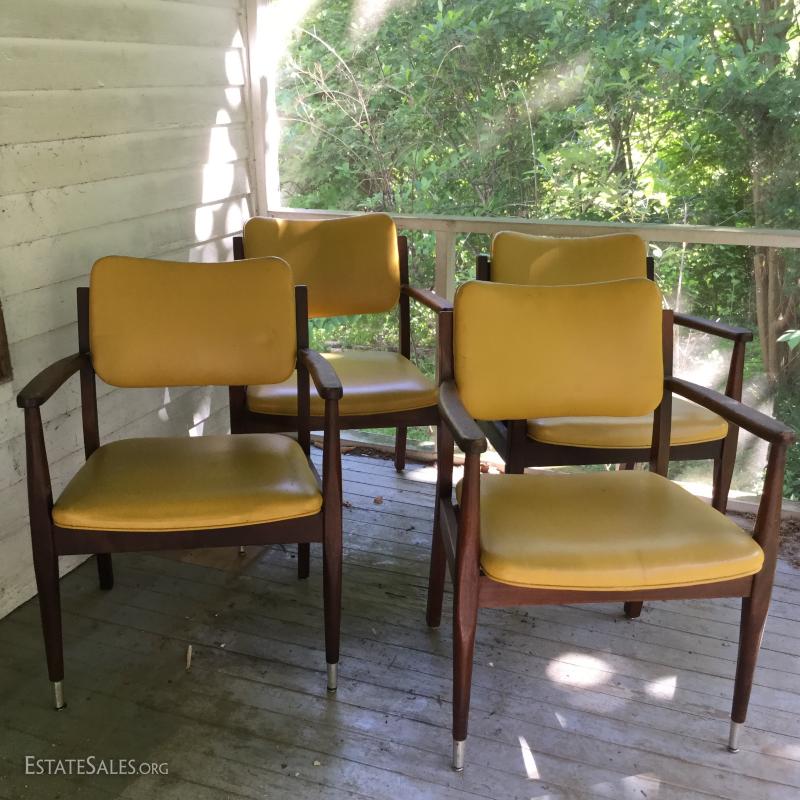 Four solid wood, MCM "Mustard Yellow" Vinyl covered chairs. Minor scratches a rips.