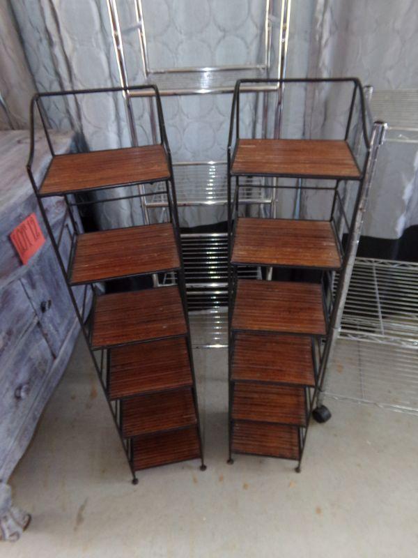 2 Matching shelves, great for CD's, DVD's or knick-knacks. Shelves appear to be bamboo. They measure 37" tall and 6" square.