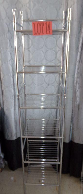 Narrow metal 6 shelf unit measures 58" tall 12" square. Adjustable height on each leg
