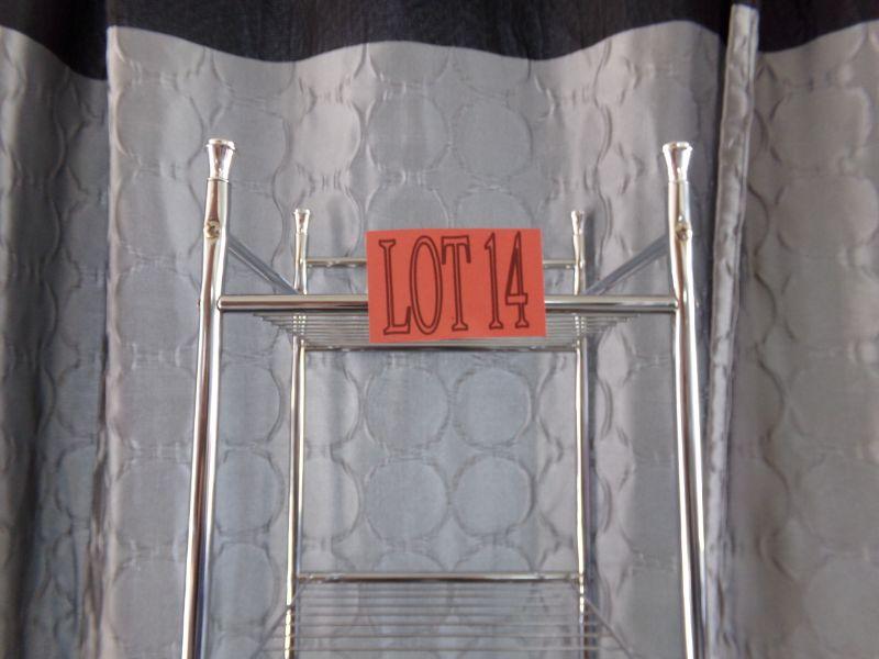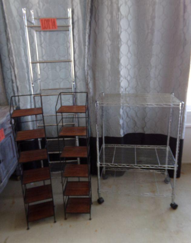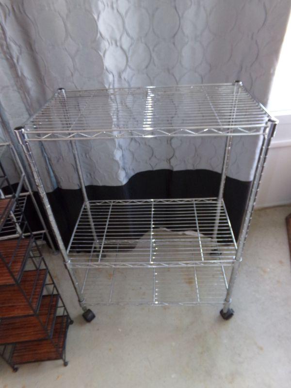 Sturdy metal shelving unit on casters measures 34" tall 37" wide 14" deep.