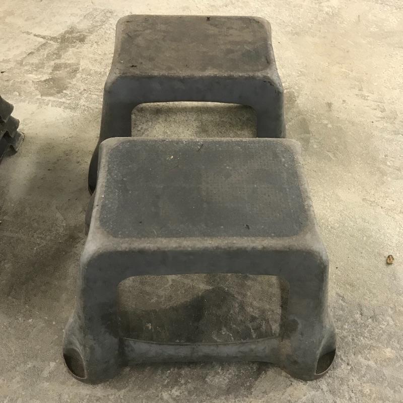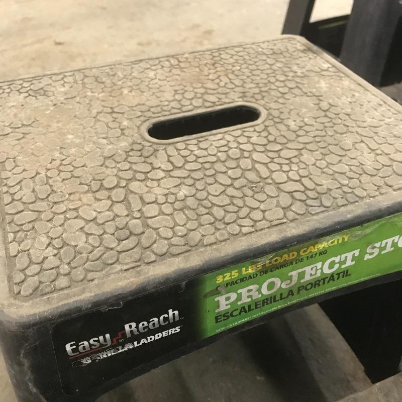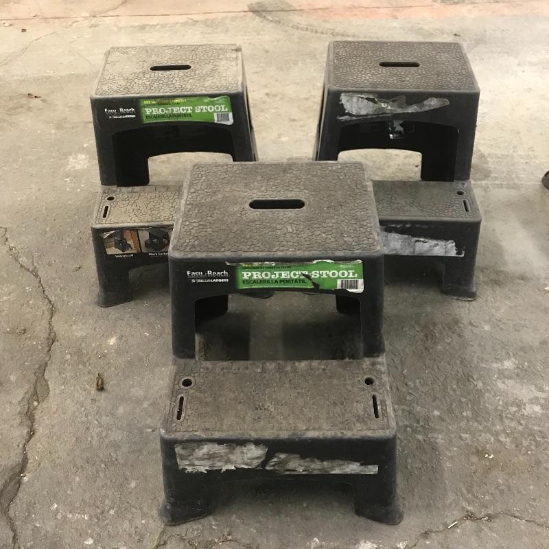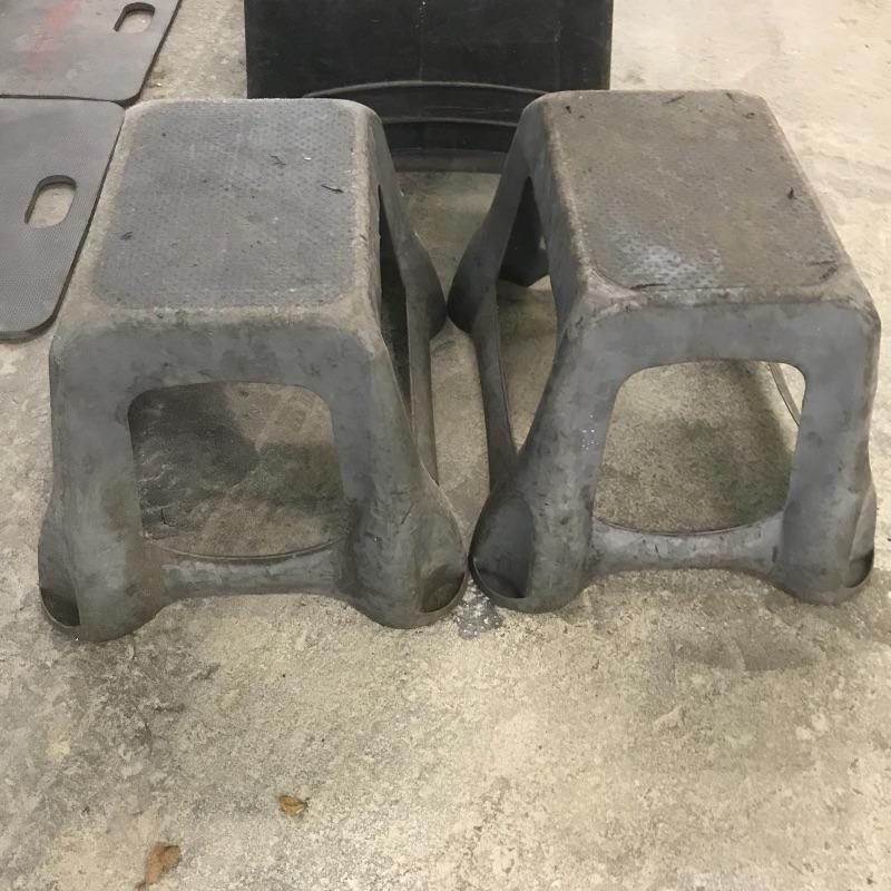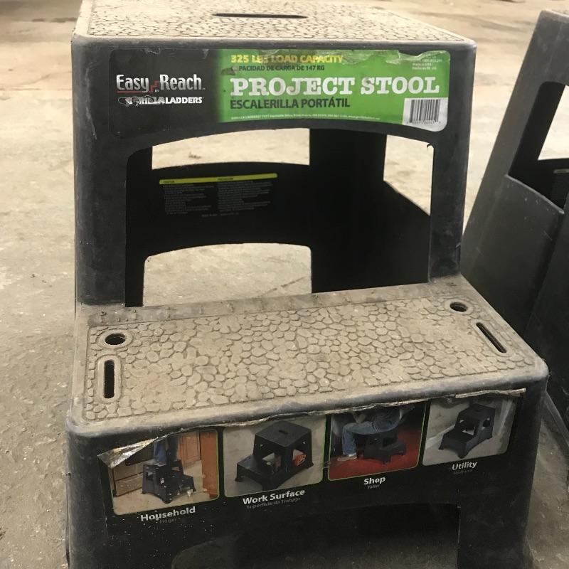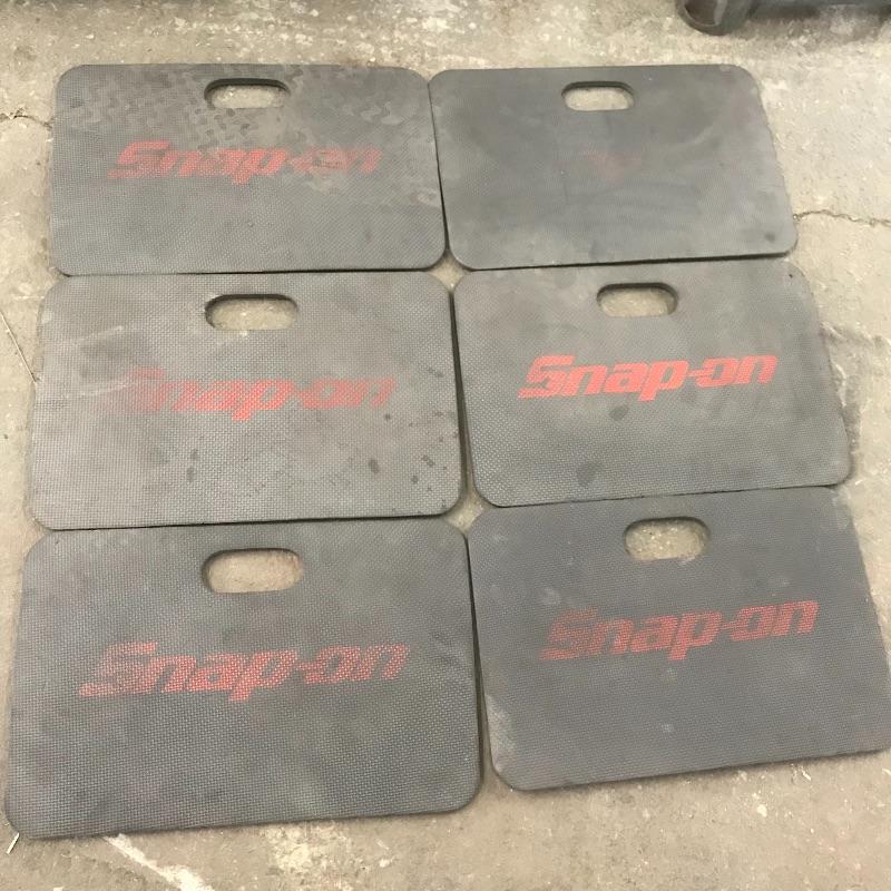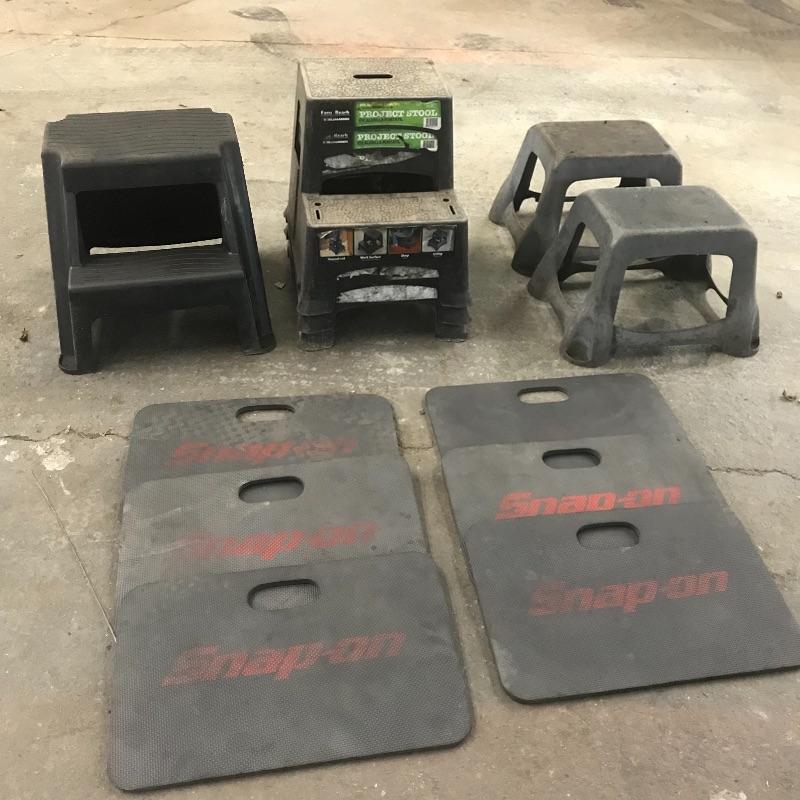 Keep those knees comfortable while you work with these six Snap-On Kneeling Pads. Collection is dirty, but all are in sturdy shape and have a lot of life left. Two step stools with no manufacturer information stand 18” x 14” x 11.5”. The two-step black Rubbermaid stool measure 15.5” x 18” x 16.5” with handles on each side for convenient moving. Lastly, three Easy Reach two step project stools have non-slip grilling and plenty of handles. See photos. No shipping.