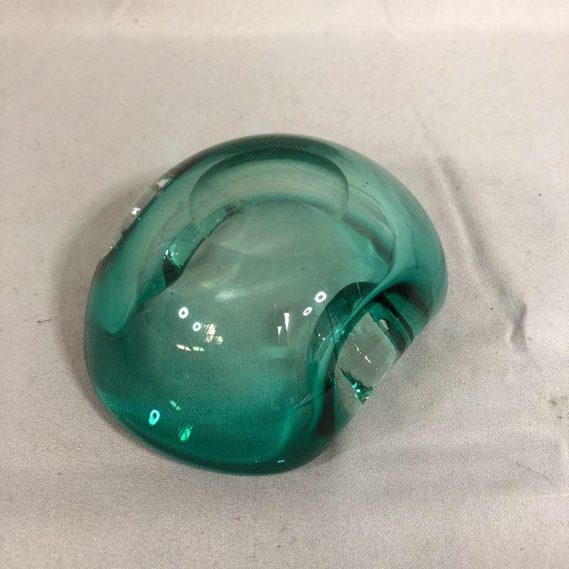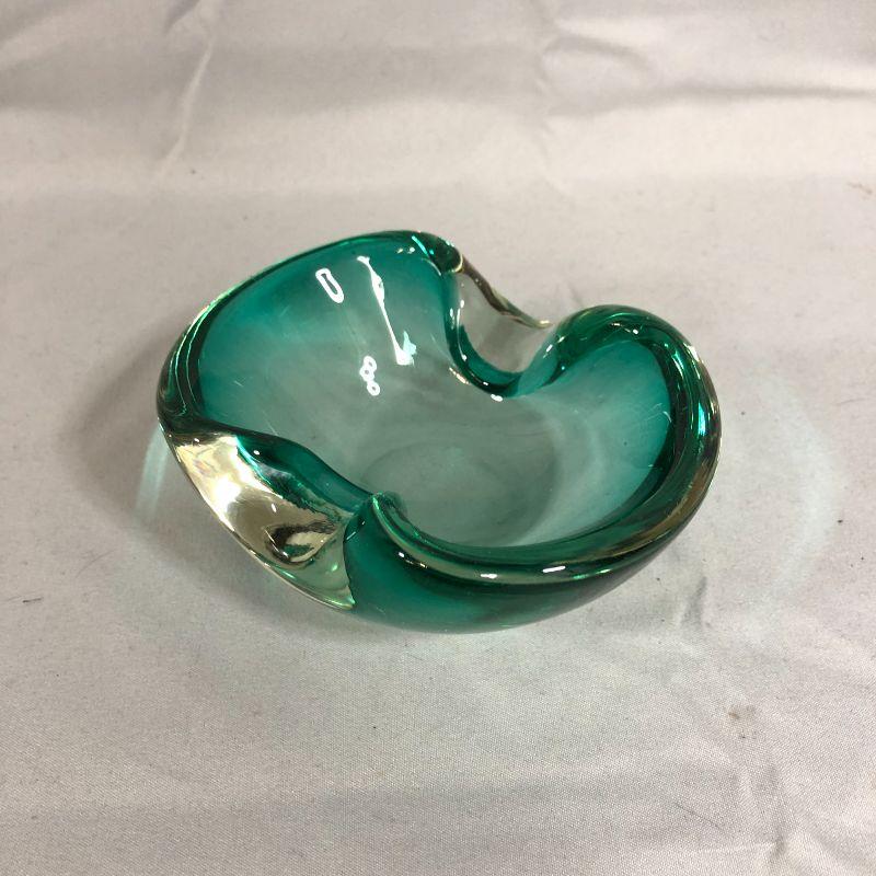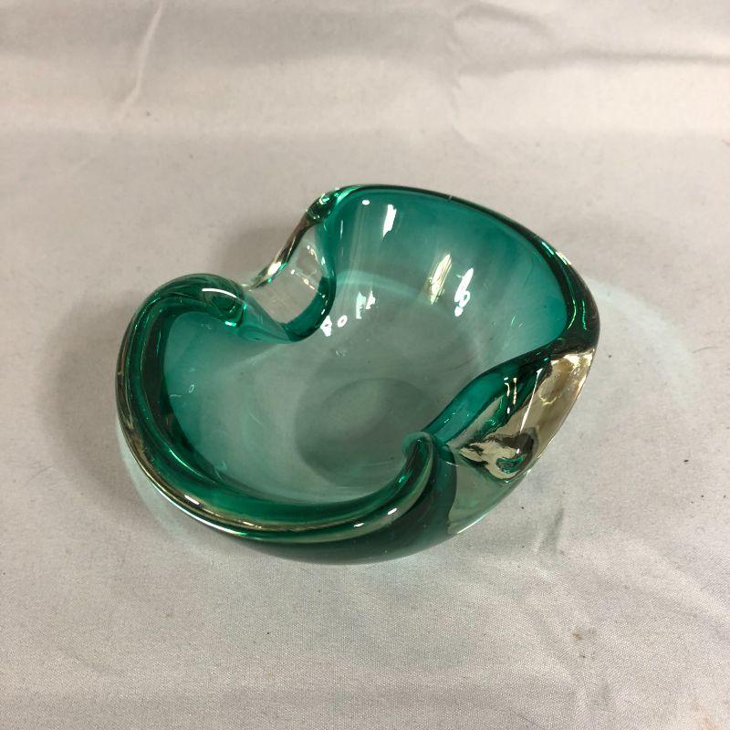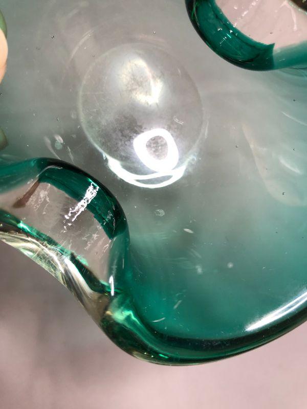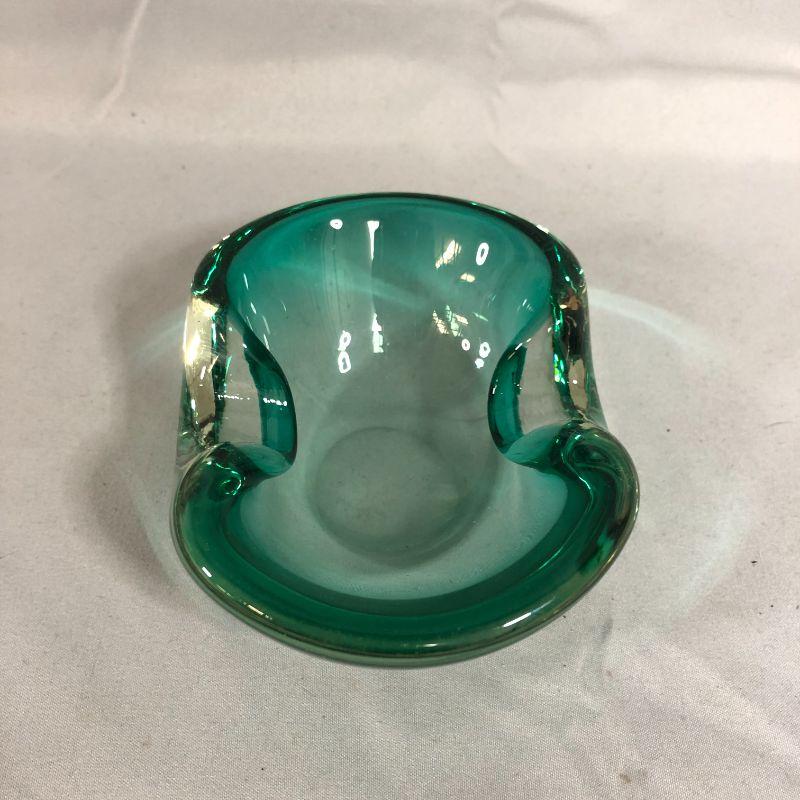 This is a pretty bowl that is clear and dark green. There are light surface scratches on the bottom where it sits on the table, but otherwise it is in very good condition. It is 4.5" at the longest diameter.