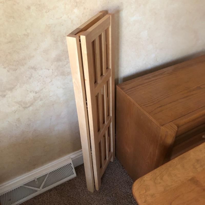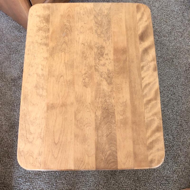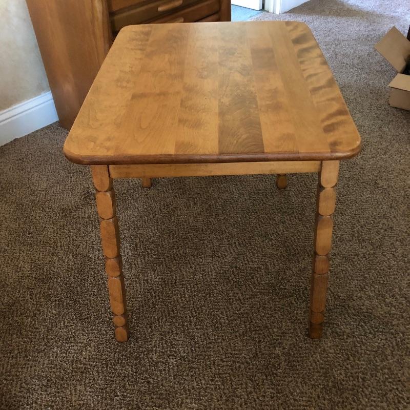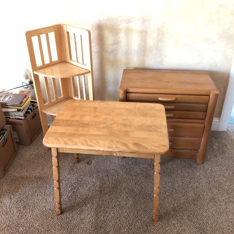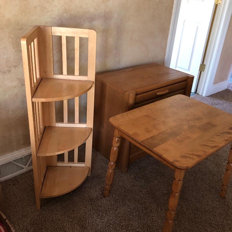 Three pieces of light colored furniture here. They appear to be pine or the color of pine. The corner shelving unit has three shelves and folds flat for easy storage and stands at 38” tall. The small solid wood table has a great modern clean look to it with detailed legs and is 20” x 26” x 23”. The two drawer small dresser measures 15” x 26” x 23”.