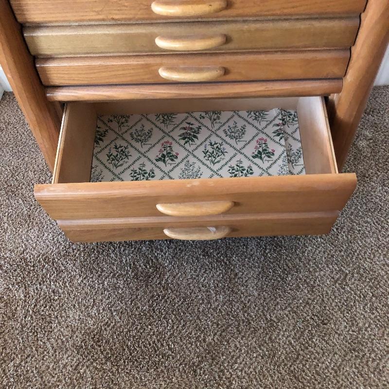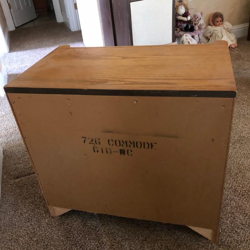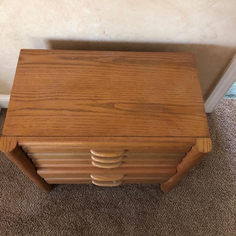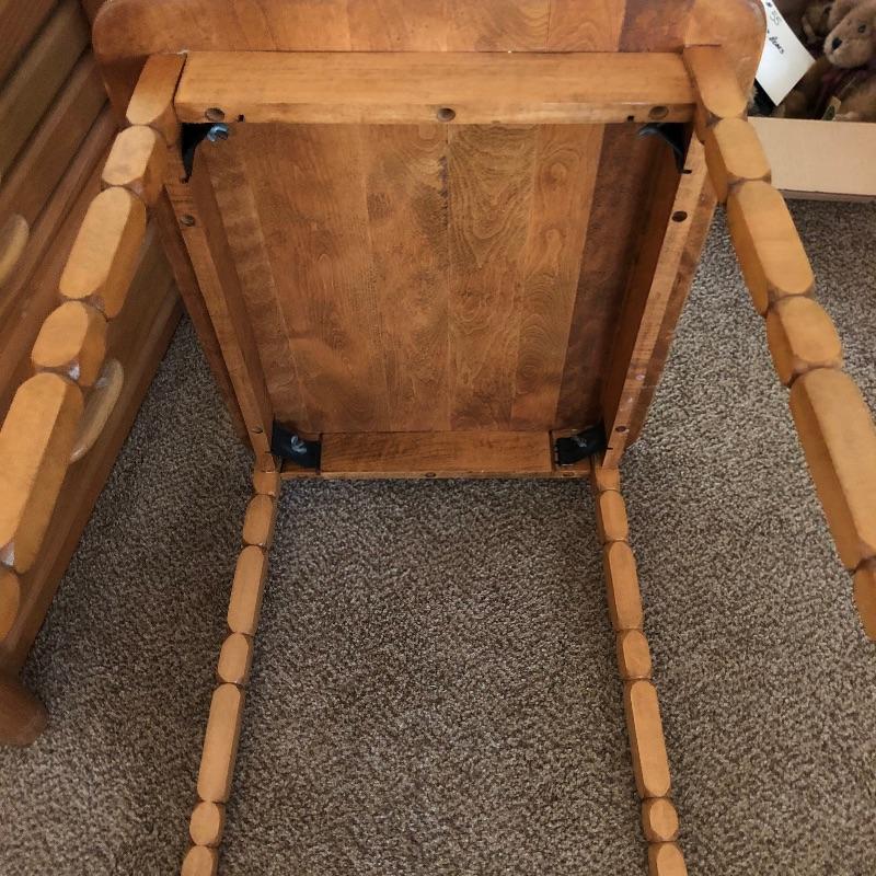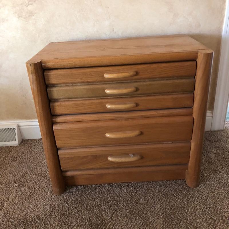 Three pieces of light colored furniture here. They appear to be pine or the color of pine. The corner shelving unit has three shelves and folds flat for easy storage and stands at 38” tall. The small solid wood table has a great modern clean look to it with detailed legs and is 20” x 26” x 23”. The two drawer small dresser measures 15” x 26” x 23”.