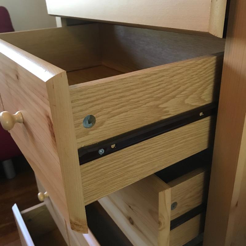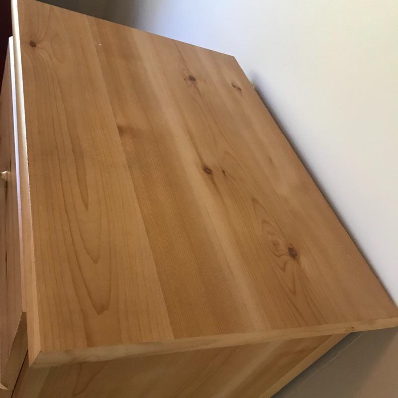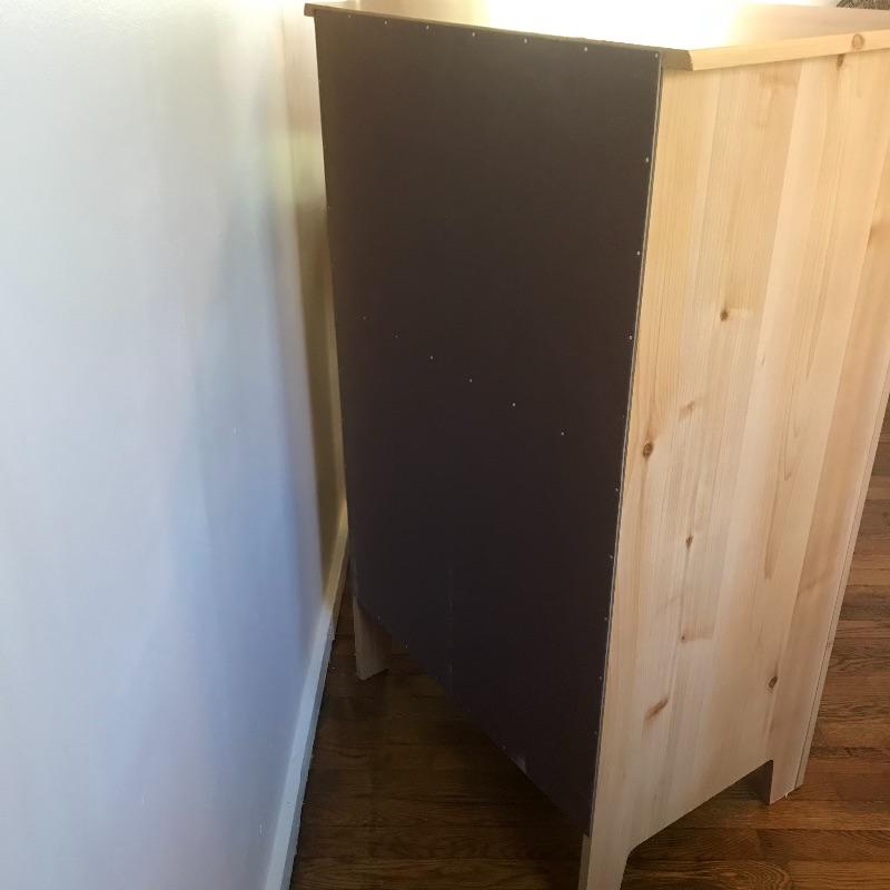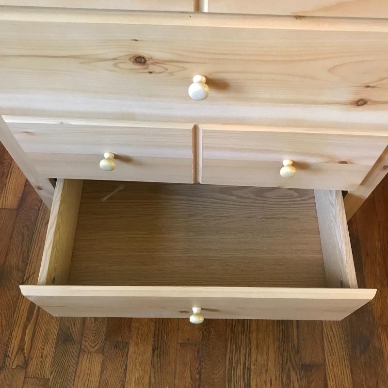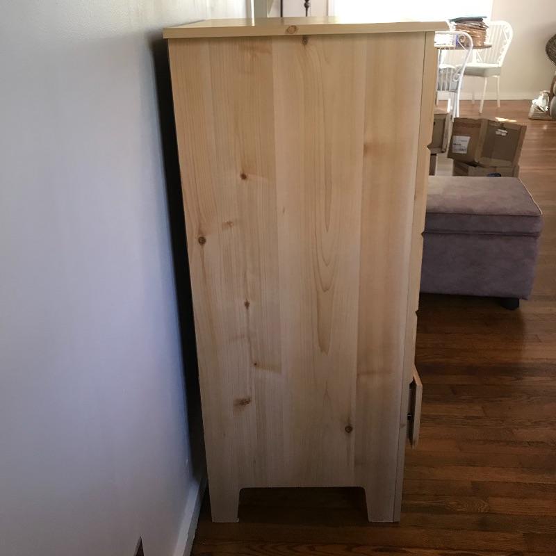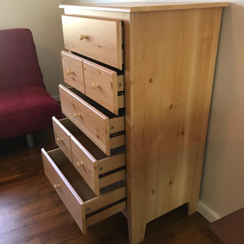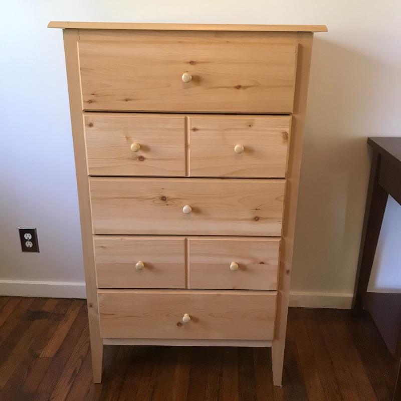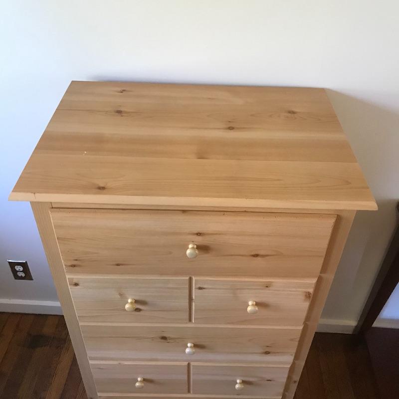 Very nice “naked-wood” style chest of drawers perfect storage for any room in your house! Piece has five drawers, with a faux design to appear as seven drawers. The piece appears to be pressed wood with veneer. It is in very nice condition with a few blemishes that almost add to the “naked-wood” theme. Dresser measures 28.25” x 19.5” x 46.5”. Piece is sturdy and heavy, please bring help to load. Local pick up only.