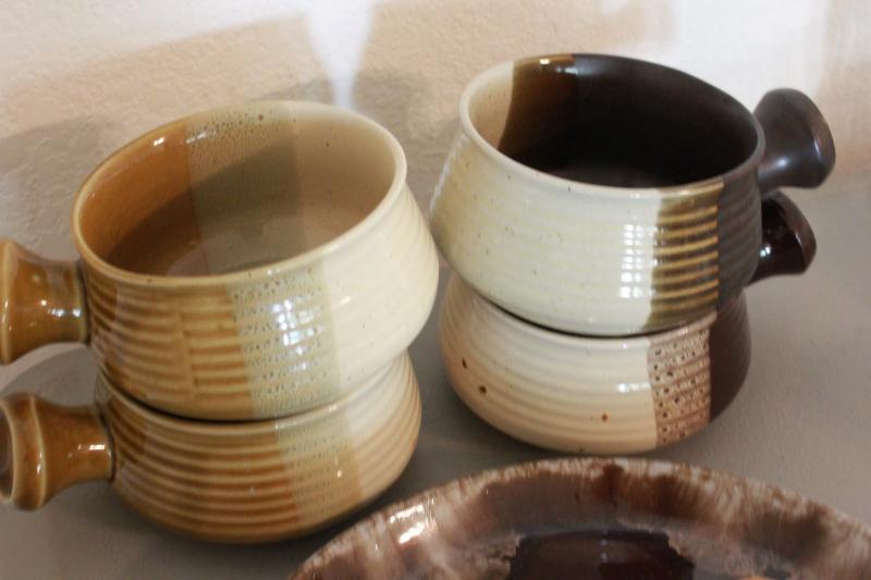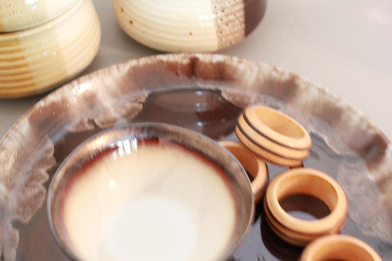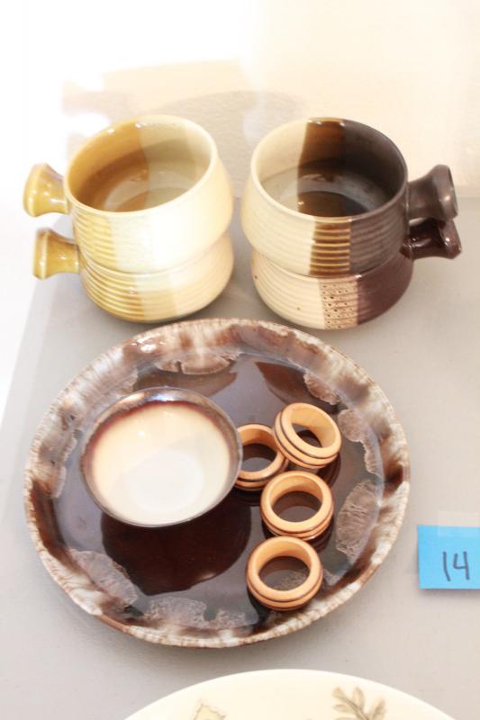 four napkin rings, four soup bowls, serving dish and small bowl.