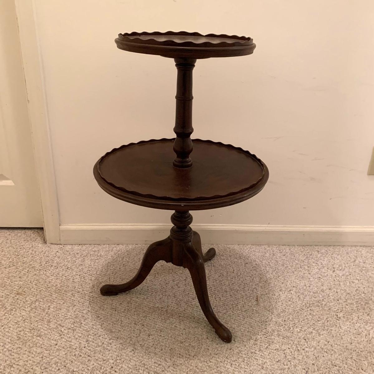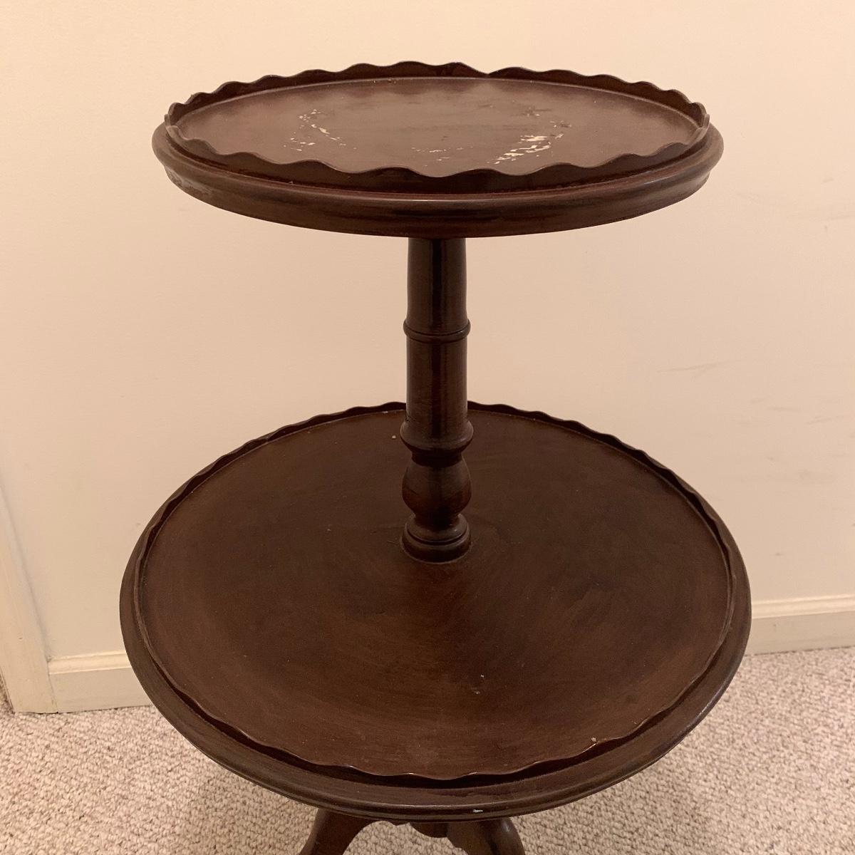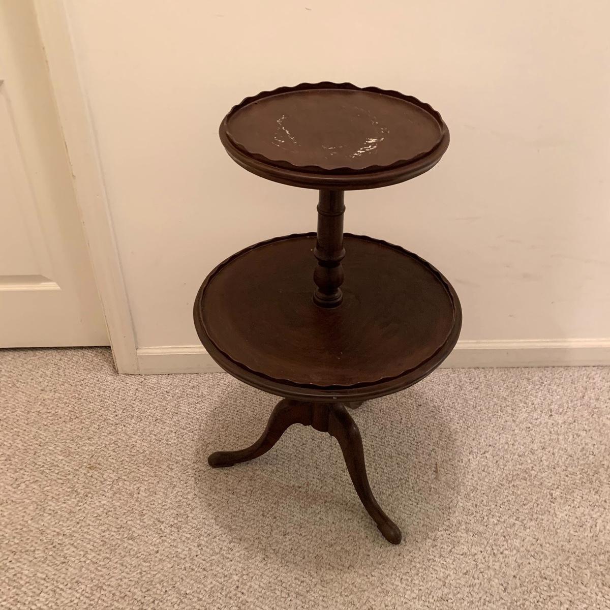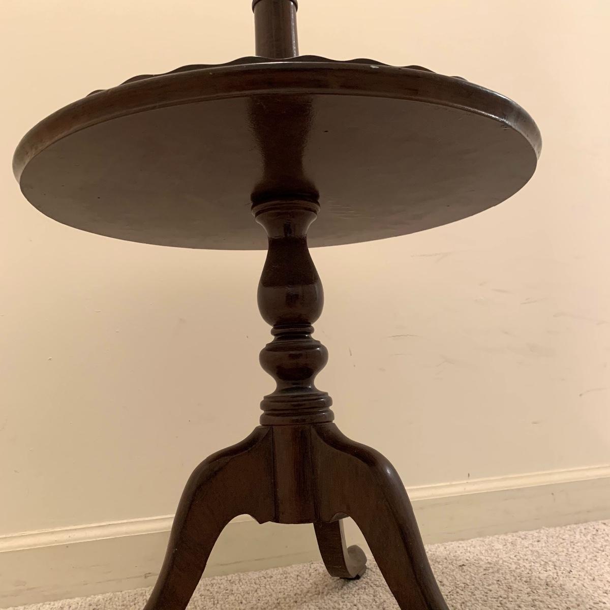This two-tiered table would be excellent for displaying your collectibles or using as a plant stand. The top edge of the tables has a neat scalloped design. There is some wear from use in the top surface of the table. The table is about 31.5” tall. The diameter of the lower table is 19.5” and the diameter of the upper table is 14”. Local pickup only.