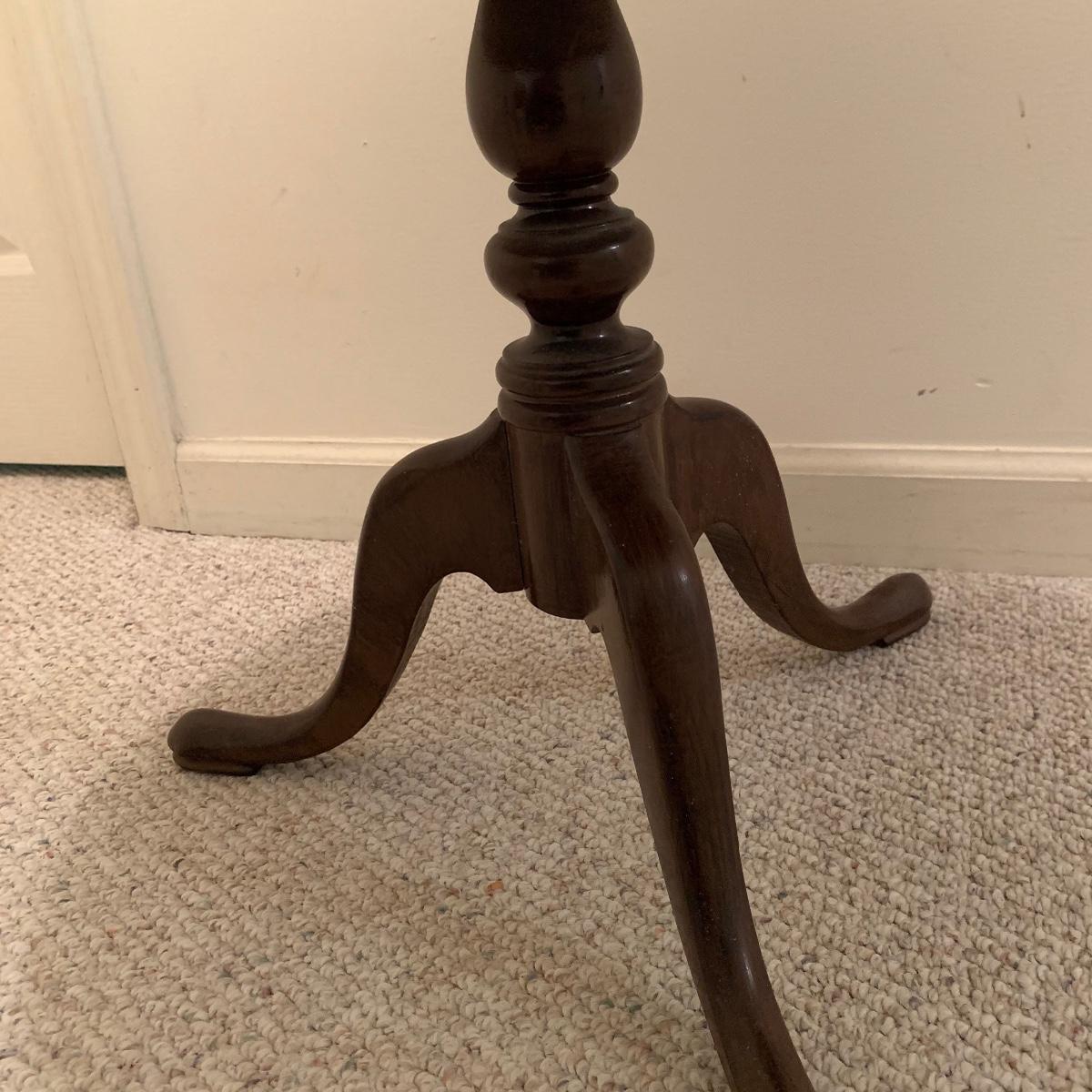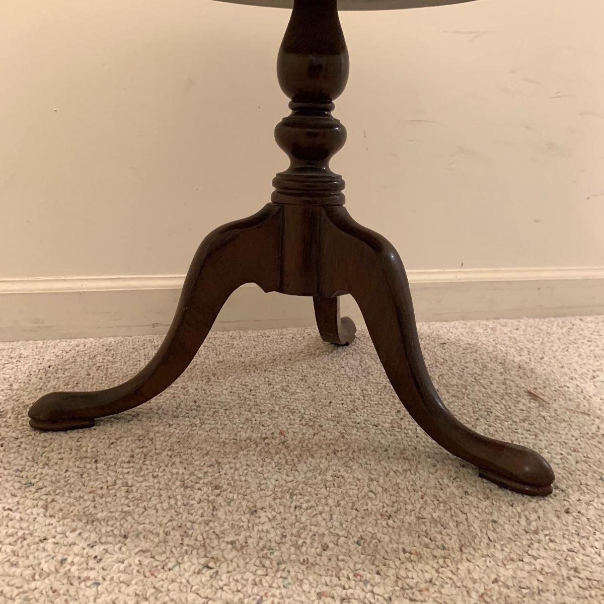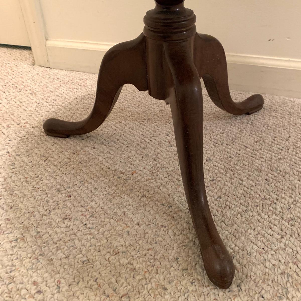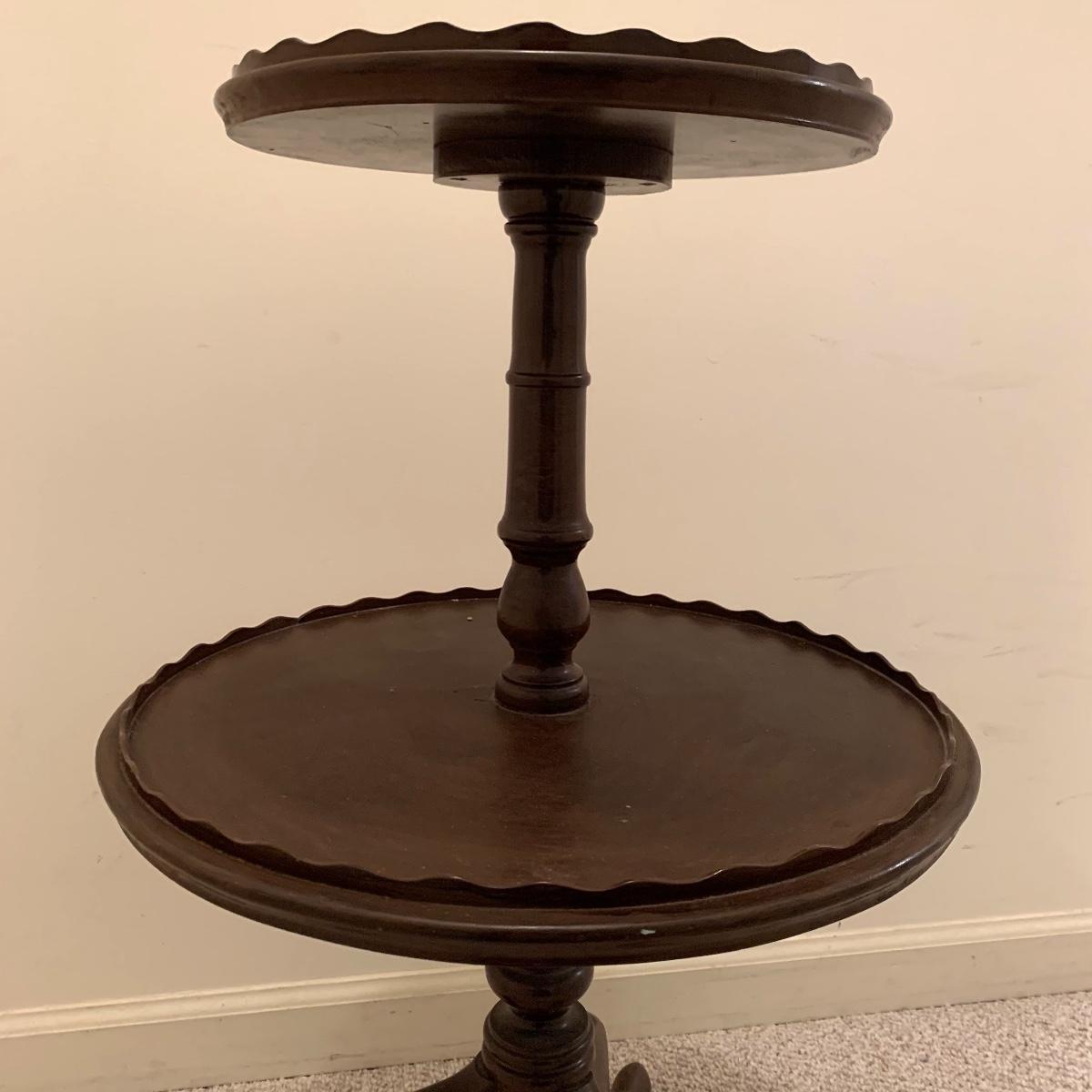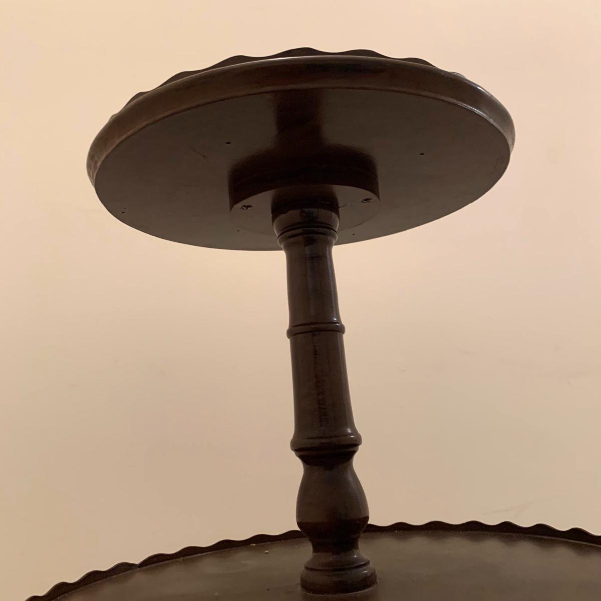 This two-tiered table would be excellent for displaying your collectibles or using as a plant stand. The top edge of the tables has a neat scalloped design. There is some wear from use in the top surface of the table. The table is about 31.5” tall. The diameter of the lower table is 19.5” and the diameter of the upper table is 14”. Local pickup only.