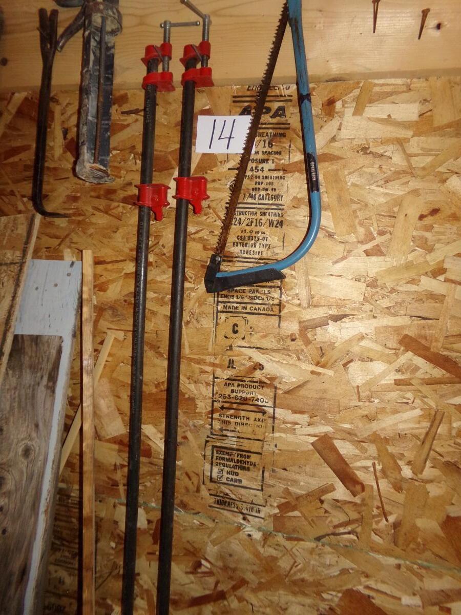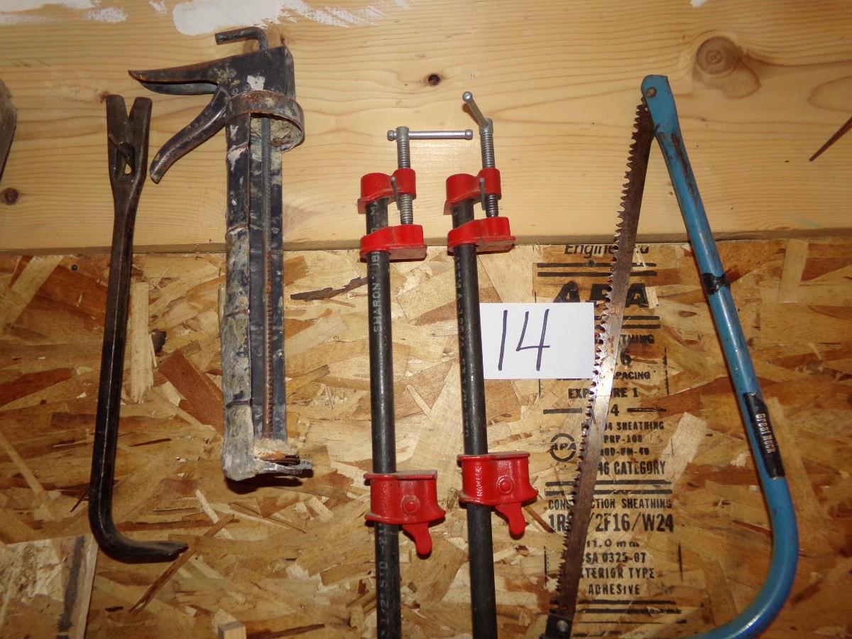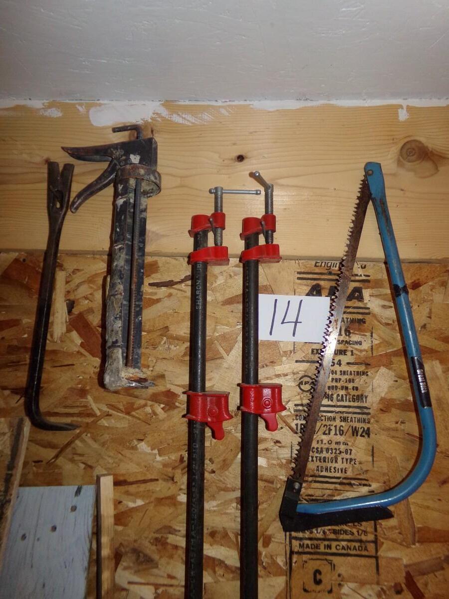 PRY BAR, CAULKING GUN, HAND SAW AND 2 LARGE CLAMPS.